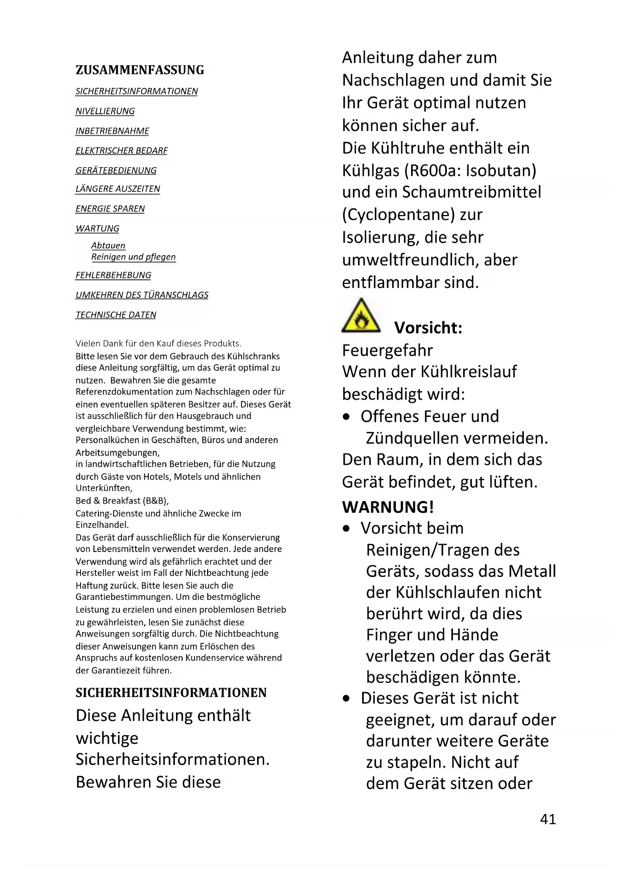 - Keine brennbaren und hoch flüchtigen Substanzen wie Äther, Benzin, Flüssiggas, Propan, Sprühdosen, Klebstoffe, reinen Alkohol usw. in der Kühltruhe aufbewahren - Explosionsgefahr!