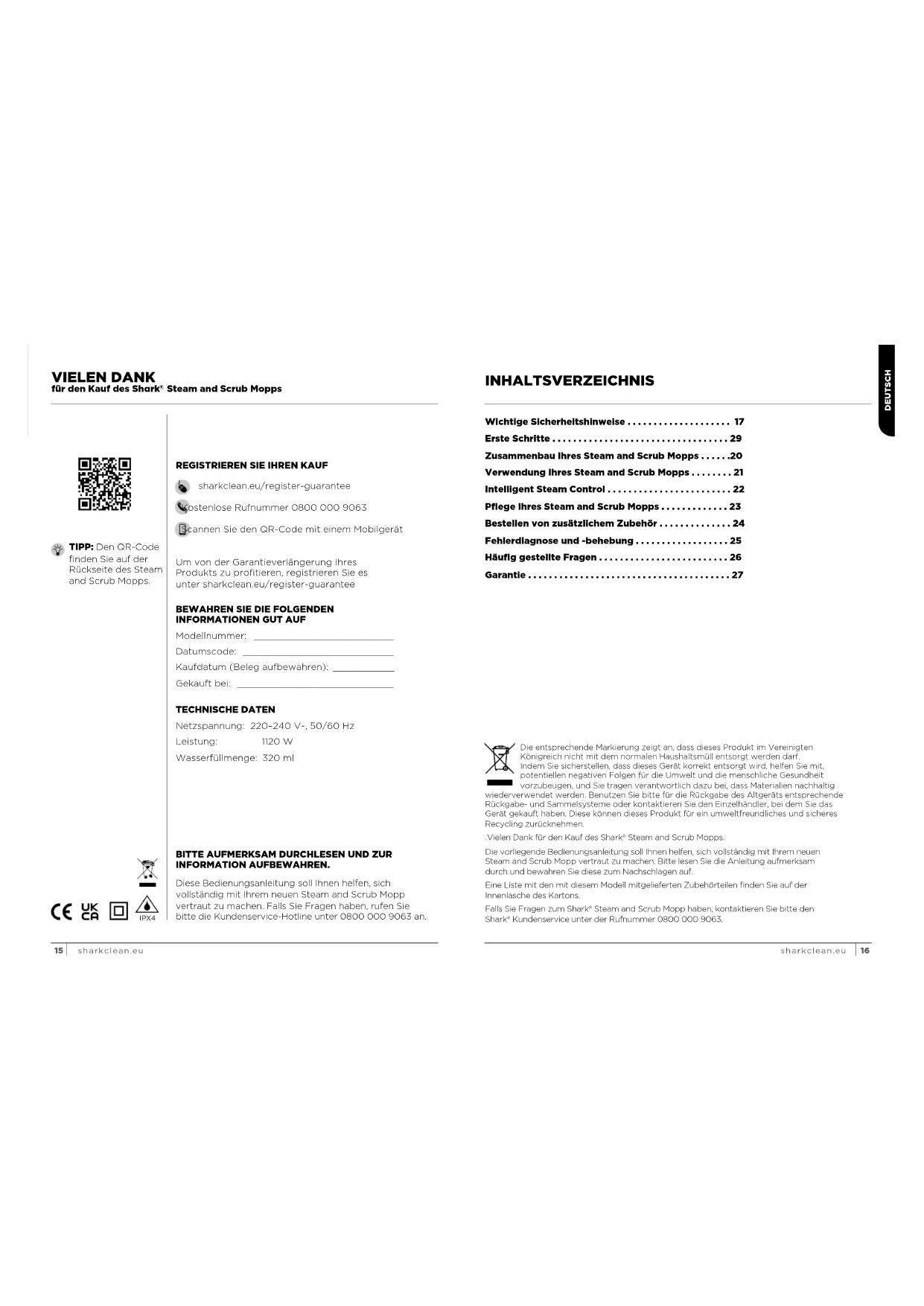 sharkclean.eu/register-guarantee Kostenlose Rufnummer 0800 000 9063 Scannen Sie den QR-Code mit einem Mobilgerät Die entsprechende Markierung zeigt an, dass dieses Produkt im Vereinigten Königreich nicht mit dem normalen Haushaltsmüll entsorgt werden darf. Indem Sie sicherstellen, dass dieses Gerät korrekt entsorgt wird, helfen Sie mit, potentiellen negativen Folgen für die Umwelt und die menschliche Gesundheit vorzubeugen, und Sie tragen verantwortlich dazu bei, dass Materialien nachhaltig wiederverwendet werden. Benutzen Sie bitte für die Rückgabe des Altgeräts entsprechende Rückgabe- und Sammelsysteme oder kontaktieren Sie den Einzelhändler, bei dem Sie das Gerät gekauft haben. Diese können dieses Produkt für ein umweltfreundliches und sicheres Recycling zurücknehmen. .Vielen Dank für den Kauf des Shark® Steam and Scrub Mopps. Die vorliegende Bedienungsanleitung soll Ihnen helfen, sich vollständig mit Ihrem neuen Steam and Scrub Mopp vertraut zu machen. Bitte lesen Sie die Anleitung aufmerksam durchund bewahren Sie diese zum Nachschlagen auf. Eine Liste mit den mit diesem Modell mitgelieferten Zubehörteilen finden Sie auf der Innenlasche des Kartons. Falls Sie Fragen zum Shark® Steam and Scrub Mopp haben, kontaktieren Sie bitte den Shark® Kundenservice unter der Rufnummer 0800 000 9063. IPX4 TIPP: Den QR-Code finden Sie auf der Rückseite des Steam and Scrub Mopps.WARNHINWEIS Dieses Gerät darf von Personen mit herabge- setzten ph ysischen, sensorischen oder geistigen Fähigkeiten und Mangel an Erfahrung und Kenntnissen nur unter Aufsicht oder nach ausreichender Einweisung durch eine für ihre Sicherheit verantwortliche Person benutzt werden Kinder sollten dieses Gerät nicht benutzen oder damit spielen Um das Gerät während der Benutzung außerhalb der Reichweite von Kindern zu halten, ist eine strikte Überwachung erforderlich DEUTSCH 18sharkclean.eu17 sharkclean.eu WARNHINWEIS: Verbrühungsgefahr. Der aus dem Dampfmopp austretende Dampf ist sehr heiß und es besteht Verbrühungsgefahr. Bitte gehen Sie bei der Benutzung stets vorsichtig mit Ihrem Steam and Scrub Mopp um. WARNHINWEIS: Den Dampfmopp von Kindern fernhalten. WARNHINWEIS: Kinder müssen beaufsichtigt werden, damit sie nicht mit dem Gerät spielen.