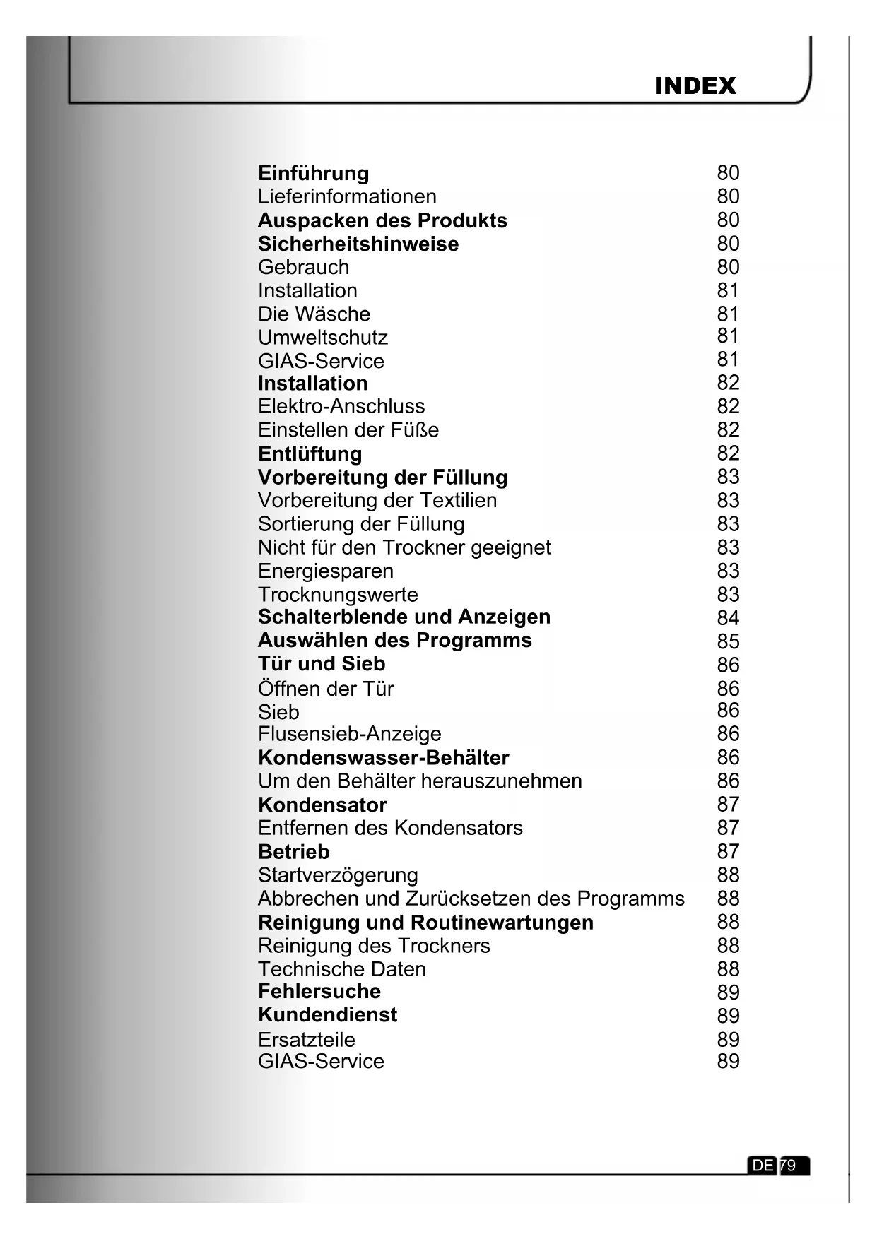 Einführung Lieferinformationen Auspacken des Produkts Sicherheitshinweise Gebrauch Installation Die Wäsche Umweltschutz GIAS-Service Installation Elektro-Anschluss Einstellen der Füße Entlüftung Vorbereitung der Füllung Vorbereitung der Textilien Sortierung der Füllung Nicht für den Trockner geeignet Energiesparen Trocknungswerte Schalterblende und Anzeigen Auswählen des Programms Tür und Sieb Öffnen der Tür Sieb Flusensieb-Anzeige Kondenswasser-Behälter Um den Behälter herauszunehmen Kondensator Entfernen des Kondensators Betrieb Startverzögerung Abbrechen und Zurücksetzen des Programms Reinigung und Routinewartungen Reinigung des Trockners Technische Daten Fehlersuche Kundendienst Ersatzteile GIAS-Service DE 79 INDEXZum Lieferumfang Ihrer Waschmaschine gehören folgende Dokumentation und Zusatzteile: ● Bedienungsanleitung ● Garantieschein ● Energieeffizienzklasse E n t f e r n e n S i e d i e Verpackung der Maschine dicht an dem Platz, wo sie aufgestellt werden soll.