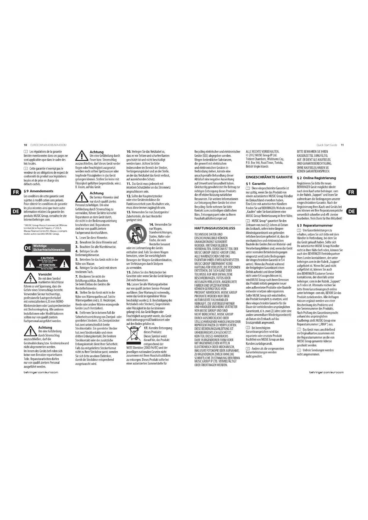 10 11Quick Start GuideEUROCOM MA4008/MA4000M§ 4 Garantieausschluss (1) Diese eingeschränkte Garantie gilt nicht für Verschleißteile, wie Sicherungen und Batterien. Woanwendbar, gewährtMUSICGroup für neunzig (90) Tage ab Kaufdatum die Garantie, dassdie im Produkt enthaltenen Röhren oder Anzeigen frei von Material- und Verarbeitungsfehlern sind. (2) Diese eingeschränkte Garantie gilt nicht für Produkte, die auf irgendeine Weise elektronisch oder mechanisch modi ziert wurden. Wenn ein Produkt verändert oder angepasst werden muss, damit es in einem Land, für das es ursprünglich nicht entwickelt oder hergestellt wurde, den geltenden technischen oder sicherheitstechnischen Standards auf nationaler oder lokaler Ebene entspricht, ist diese Veränderung/Anpassung nicht als Material- oder Verarbeitungsfehler anzusehen. Diese eingeschränkte Garantie umfasst nicht derartige Veränderungen/ Anpassungen unabhängig davon, ob diese ordnungsgemäß durchgeführt wurden oder nicht. MUSICGroup übernimmt im Rahmen dieser Garantie für derartige Veränderungen auch keine Kosten. (3) Diese eingeschränkte Garantie gilt nur für die Hardware des Produkts. Sieschließt keine technische Unterstützung für die Anwendung der Hard- oder Software ein und sie gilt nicht für Software-Produkte, gleichgültig ob sie im Produkt enthalten sind oder nicht. DieSoftware wird im „IST-ZUSTAND“ geliefert, sofern ihr keine besondere eingeschränkte Soft war e- G aran tiebe ilie gt. (4) Diese eingeschränkte Garantie erlischt, wenn die im Werk angebrachte Seriennummer verändert oder entferntwurde. (5) Diese eingeschränkte Garantie berechtigt nicht zur kostenlosen Inspektion und Wartung/Reparatur des Geräts, insbesondere wenn die Defekte auf unsachgemäße Benutzung zurückzuführen sind. DieGarantie gilt auch nicht für Defekte durch normale Abnutzung, besonders bei Fadern, Crossfadern, Potentiometern, Tasten, Gitarrensaiten, Leuchtmitteln und ähnlichenTeilen. (6) Unter diese eingeschränkte Garantie fallen auch keine Schäden/Defekte, dieverursacht wurden durch: