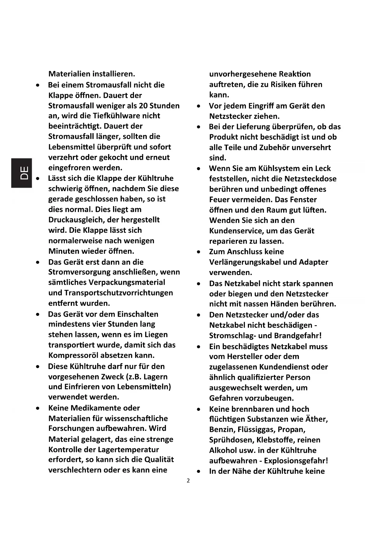 - Diese Kühltruhe darf nur für den vorgesehenen Zweck (z.B. Lagern und Einfrieren von Lebensmieln) verwendet werden.