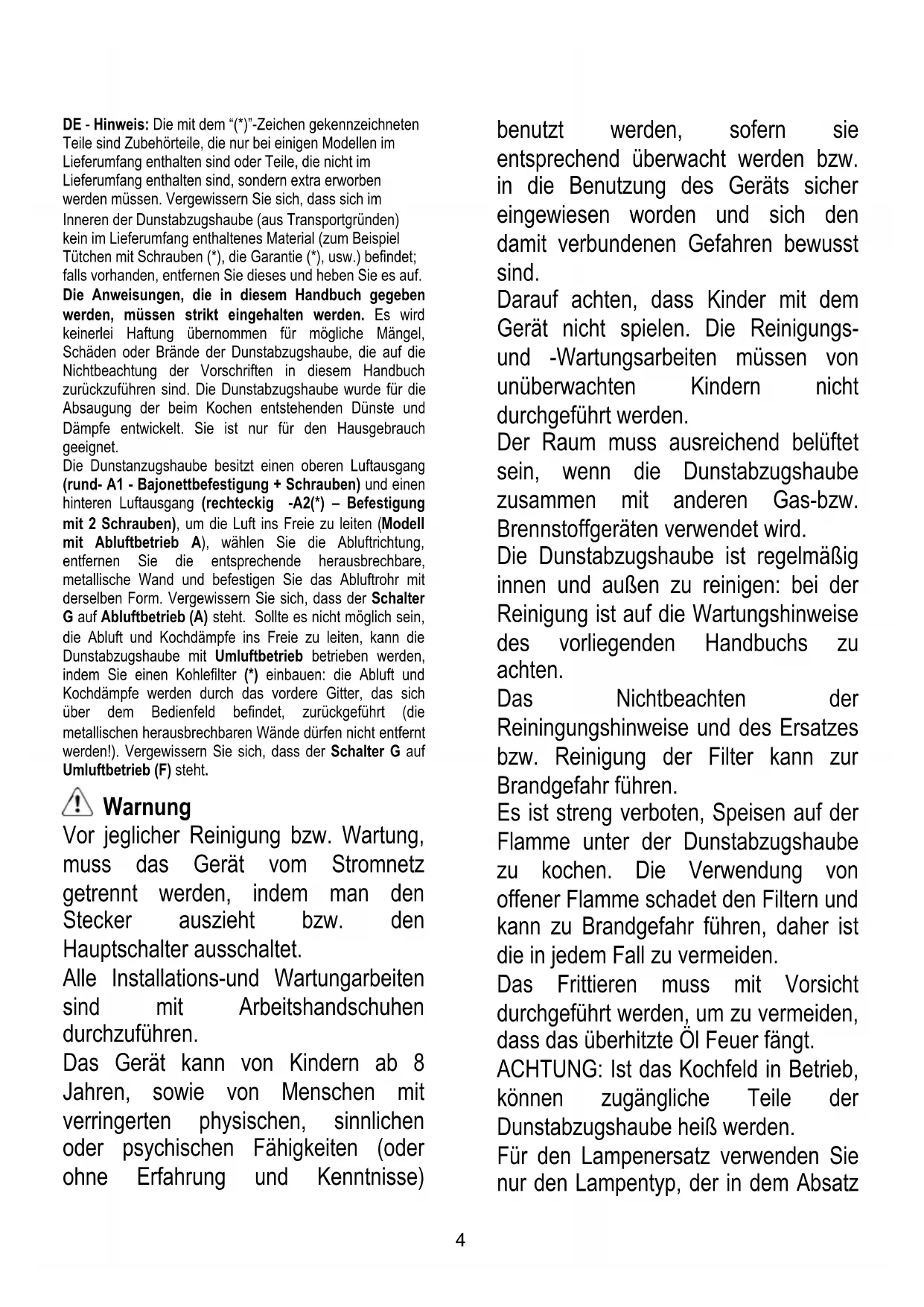 SL Navodila za montažo in uporabo UK Інструкція з монтажу і експлуатації ET Paigaldus- ja kasutusjuhend LT montavimo ir naudojimosi instrukcija LV ierīkošanas un izmantošanas instrukcija HR Uputstva za montažu i za uporabu SR Uputstva za montažu i upotrebu KK Монтаждау мен пайдалану нұсқауы34 DE - Hinweis: Die mit dem “(*)”-Zeichen gekennzeichneten Teile sind Zubehörteile, die nur bei einigen Modellen im Lieferumfang enthalten sind oder Teile, die nicht im Lieferumfang enthalten sind, sondern extra erworben werden müssen. Vergewissern Sie sich, dass sich im Inneren der Dunstabzugshaube (aus Transportgründen) kein im Lieferumfang enthaltenes Material (zum Beispiel Tütchen mit Schrauben (*), die Garantie (*), usw.) befindet; falls vorhanden, entfernen Sie dieses und heben Sie es auf. Die Anweisungen, die in diesem Handbuch gegeben werden, müssen strikt eingehalten werden. Es wird keinerlei Haftung übernommen für mögliche Mängel, Schäden oder Brände der Dunstabzugshaube, die auf die Nichtbeachtung der Vorschriften in diesem Handbuch zurückzuführen sind. Die Dunstabzugshaube wurde für die Absaugung der beim Kochen entstehenden Dünste und Dämpfe entwickelt. Sie ist nur für den Hausgebrauch geeignet. Die Dunstanzugshaube besitzt einen oberen Luftausgang (rund- A1 - Bajonettbefestigung + Schrauben) und einen hinteren Luftausgang (rechteckig -A2(*) – Befestigung mit 2 Schrauben), um die Luft ins Freie zu leiten (Modell mit Abluftbetrieb A), wählen Sie die Abluftrichtung, entfernen Sie die entsprechende herausbrechbare, metallische Wand und befestigen Sie das Abluftrohr mit derselben Form. Vergewissern Sie sich, dass der Schalter G auf Abluftbetrieb (A) steht. Sollte es nicht möglich sein, die Abluft und Kochdämpfe ins Freie zu leiten, kann die Dunstabzugshaube mit Umluftbetrieb betrieben werden, indem Sie einen Kohlefilter (*) einbauen: die Abluft und Kochdämpfe werden durch das vordere Gitter, das sich über dem Bedienfeld befindet, zurückgeführt (die metallischen herausbrechbaren Wände dürfen nicht entfernt werden!). Vergewissern Sie sich, dass der Schalter G auf Umluftbetrieb (F) steht. Warnung Vor jeglicher Reinigung bzw. Wartung, muss das Gerät vom Stromnetz getrennt werden, indem man den Stecker auszieht bzw. den Hauptschalter ausschaltet. Alle Installations-und Wartungarbeiten sind mit Arbeitshandschuhen durchzuführen. Das Gerät kann von Kindern ab 8 Jahren, sowie von Menschen mit verringerten physischen, sinnlichen oder psychischen Fähigkeiten (oder ohne Erfahrung und Kenntnisse) benutzt werden, sofern sie entsprechend überwacht werden bzw. in die Benutzung des Geräts sicher eingewiesen worden und sich den damit verbundenen Gefahren bewusst sind. Darauf achten, dass Kinder mit dem Gerät nicht spielen. Die Reinigungs- und -Wartungsarbeiten müssen von unüberwachten Kindern nicht durchgeführt werden. Der Raum muss ausreichend belüftet sein, wenn die Dunstabzugshaube zusammen mit anderen Gas-bzw. Brennstoffgeräten verwendet wird. Die Dunstabzugshaube ist regelmäßig innen und außen zu reinigen: bei der Reinigung ist auf die Wartungshinweise des vorliegenden Handbuchs zu achten. Das Nichtbeachten der Reiningungshinweise und des Ersatzes bzw. Reinigung der Filter kann zur Brandgefahr führen. Es ist streng verboten, Speisen auf der Flamme unter der Dunstabzugshaube zu kochen. Die Verwendung von offener Flamme schadet den Filtern und kann zu Brandgefahr führen, daher ist die in jedem Fall zu vermeiden. Das Frittieren muss mit Vorsicht durchgeführt werden, um zu vermeiden, dass das überhitzte Öl Feuer fängt. ACHTUNG: Ist das Kochfeld in Betrieb, können zugängliche Teile der Dunstabzugshaube heiß werden. Für den Lampenersatz verwenden Sie nur den Lampentyp, der in dem Absatz5 Lampenwartung / Ersatz des vorliegenden Handbuchs angegeben wird. Achtung! Das Gerät nicht an das Stromnetz anschließen, bis die Installation vollständig abgeschlossen ist. Für das Ableiten der Küchengerüche, sich streng an die Voschriften der örtlichen Behörde halten. Bei gleichzeitigem Betrieb der Dunstabzugshaube im Abluftbetrieb und gas- oder brennstoffbetriebenen Geräten darf im Aufstellraum gas- oder brennstoffbetriebenen Geräten der Unterdruck nicht größer als 4 Pa (4 x