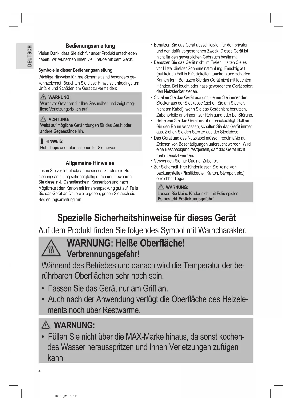 - Füllen Sie nicht über die MAX-Marke hinaus, da sonst kochen- des Wasser herausspritzen und Ihnen Verletzungen zufügen kann!TK3715_IM 17.10.18