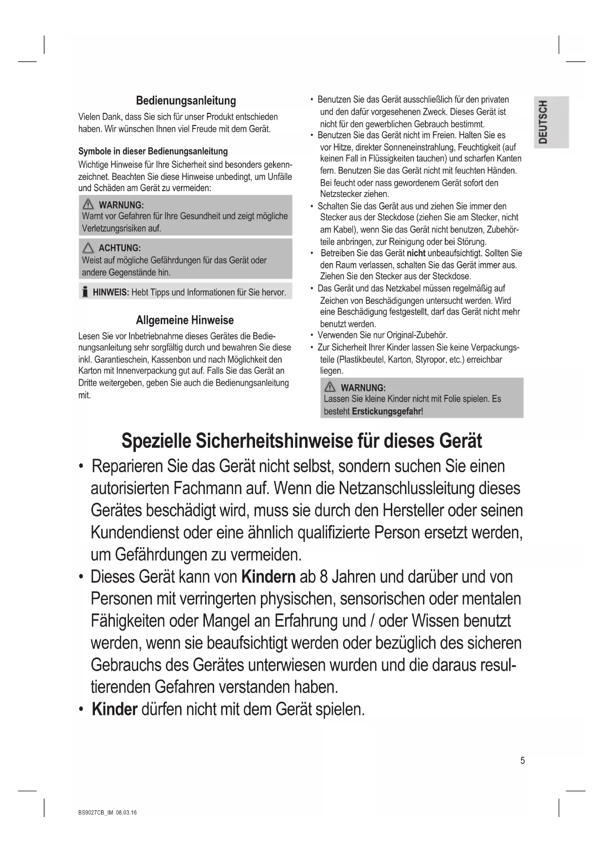 - Kinder dürfen nicht mit dem Gerät spielen.6 BS9027CB_IM 08.03.16