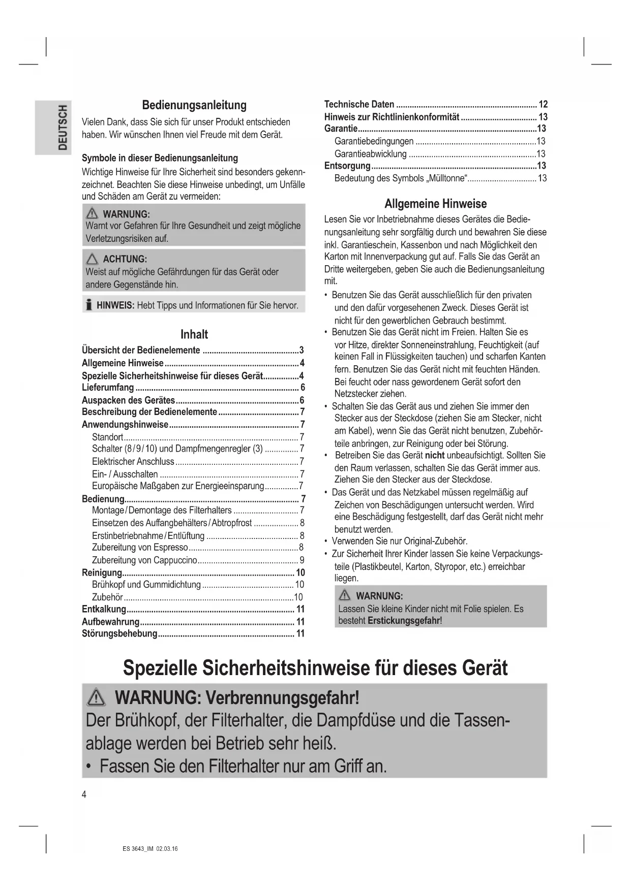 - ES 3643_IM 02.03.164 ES 3643_IM 02.03.16 Bedienungsanleitung Vielen Dank, dass Sie sich für unser Produkt entschieden haben. Wir wünschen Ihnen viel Freude mit dem Gerät. Symbole in dieser Bedienungsanleitung Wichtige Hinweise für Ihre Sicherheit sind besonders gekenn- zeichnet. Beachten Sie diese Hinweise unbedingt, um Unfälle und Schäden am Gerät zu vermeiden: WARNUNG: Warnt vor Gefahren für Ihre Gesundheit und zeigt mögliche Verletzungsrisiken auf. ACHTUNG: Weist auf mögliche Gefährdungen für das Gerät oder andere Gegenstände hin. HINWEIS: Hebt Tipps und Informationen für Sie hervor. Inhalt Übersicht der Bedienelemente p. 3