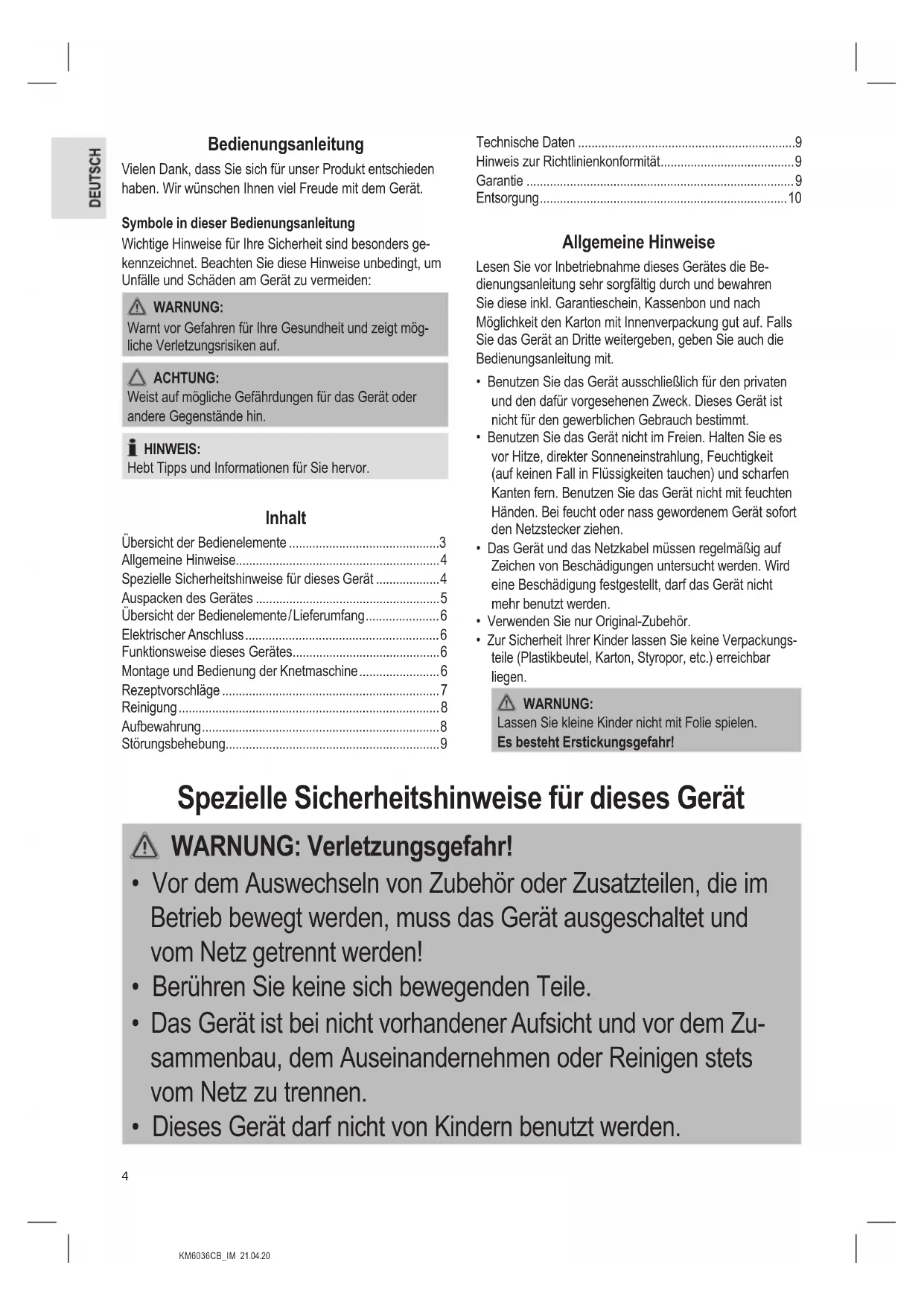 - Dieses Gerät darf nicht von Kindern benutzt werden.5 KM6036CB_IM 21.04.20 WARNUNG: Verletzungsgefahr!