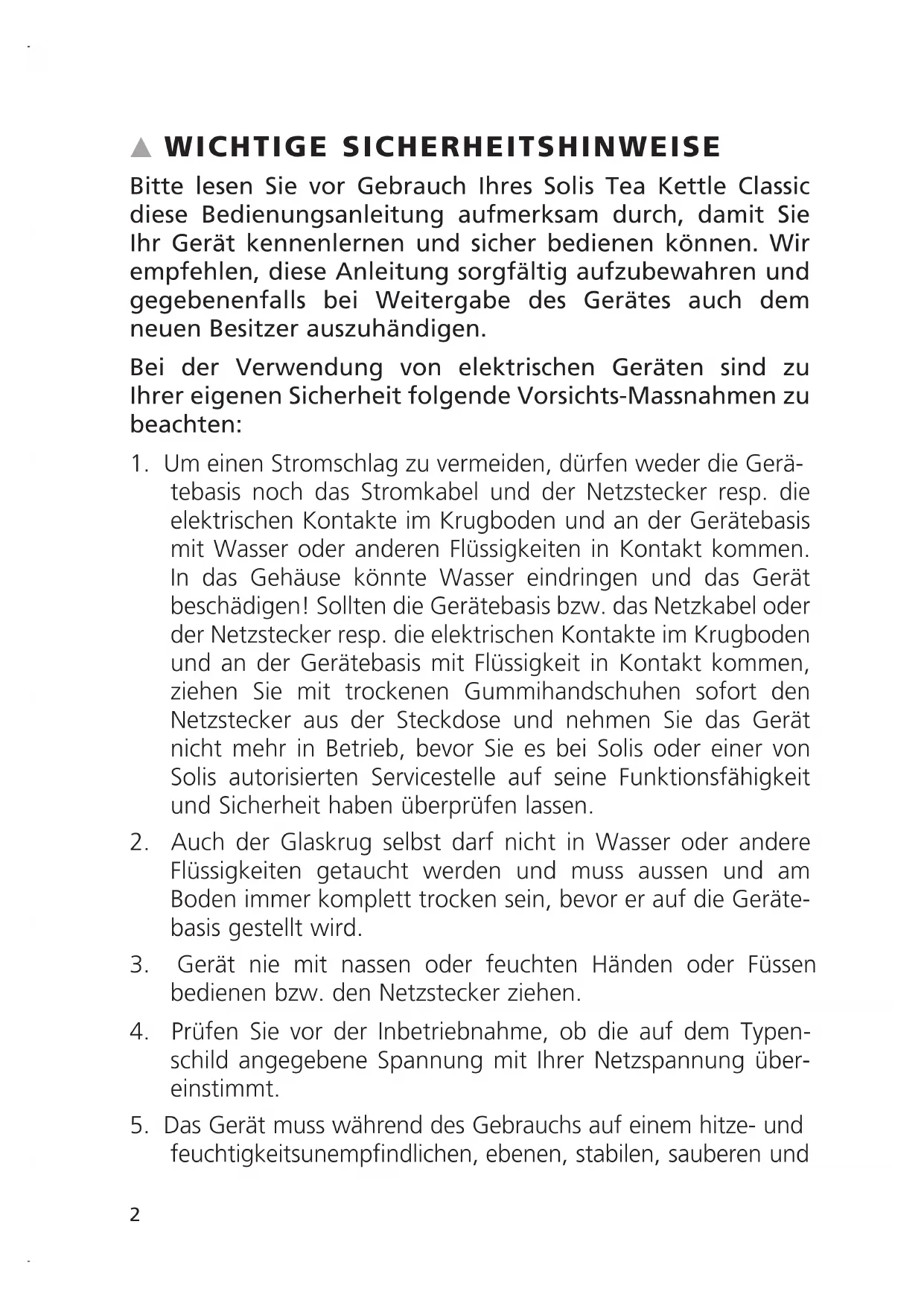 Typ / Type / Tipo 5514 SINCE 19 08s WICHTIGE SICHERHEITSHINWEISE Bitte lesen Sie vor Gebrauch Ihres Solis Tea Kettle Classic diese Bedienungsanleitung aufmerksam durch, damit Sie Ihr Gerät kennenlernen und sicher bedienen können. Wir empfehlen, diese Anleitung sorgfältig aufzubewahren und gegebenenfalls bei Weitergabe des Gerätes auch dem neuen Besitzer auszuhändigen. Bei der Verwendung von elektrischen Geräten sind zu Ihrer eigenen Sicherheit folgende Vorsichts-Massnahmen zu beachten: