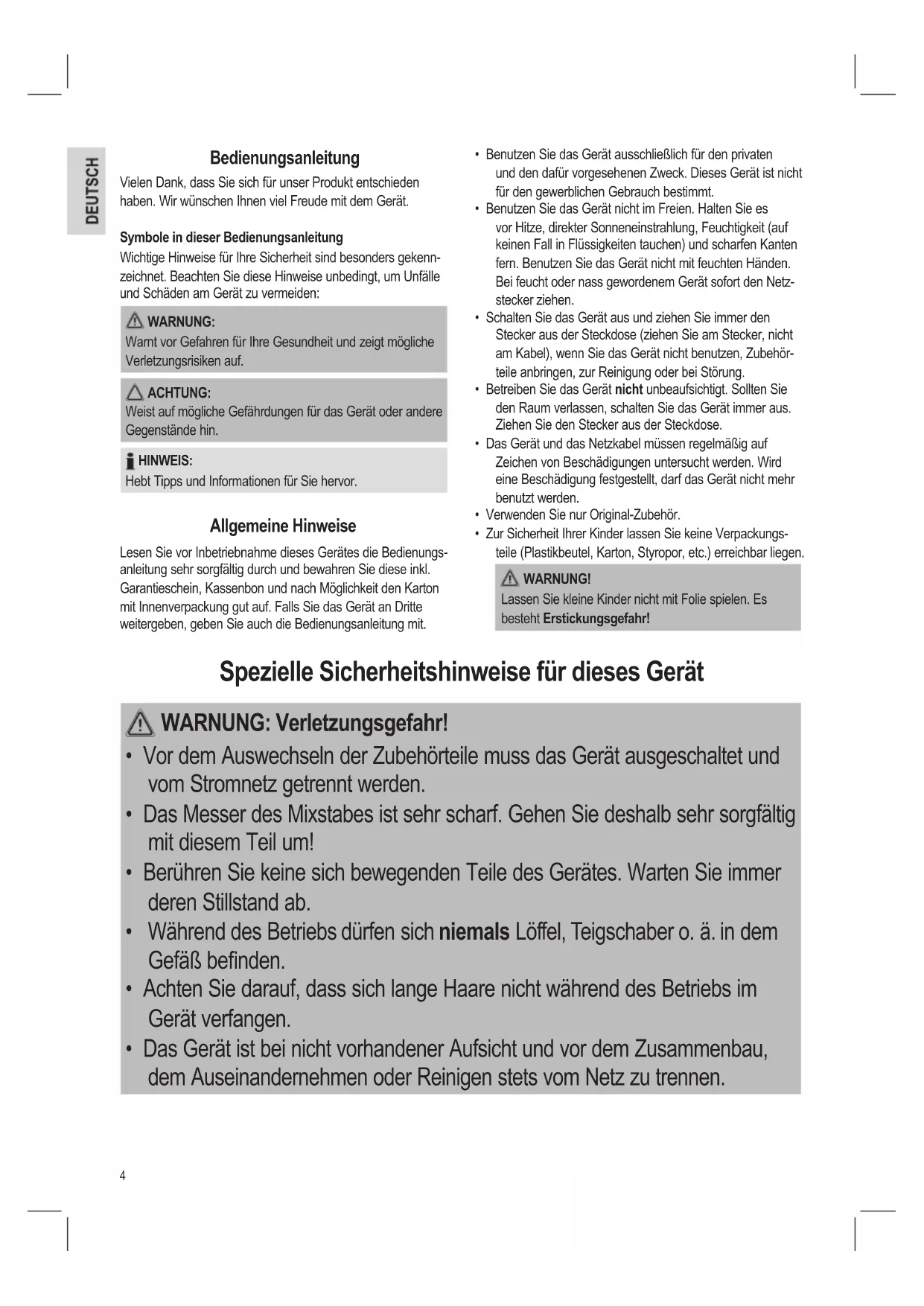 - Das Messer des Mixstabes ist sehr scharf. Gehen Sie deshalb sehr sorgfältig mit diesem Teil um!