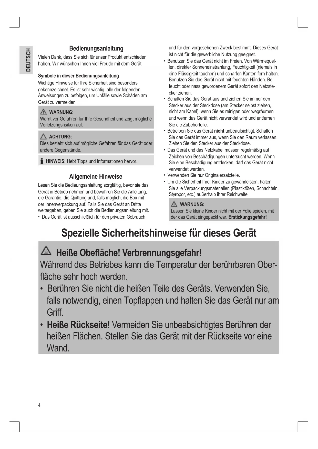 - Um die Sicherheit Ihrer Kinder zu gewährleisten, halten Sie alle Verpackungsmaterialien (Plastiktüten, Schachteln, Styropor, etc.) außerhalb ihrer Reichweite. WARNUNG: Lassen Sie kleine Kinder nicht mit der Folie spielen, mit der das Gerät eingepackt war. Erstickungsgefahr! Spezielle Sicherheitshinweise für dieses Gerät Heiße Obeäche! Verbrennungsgefahr! Während des Betriebes kann die Temperatur der berührbaren Ober- äche sehr hoch werden.