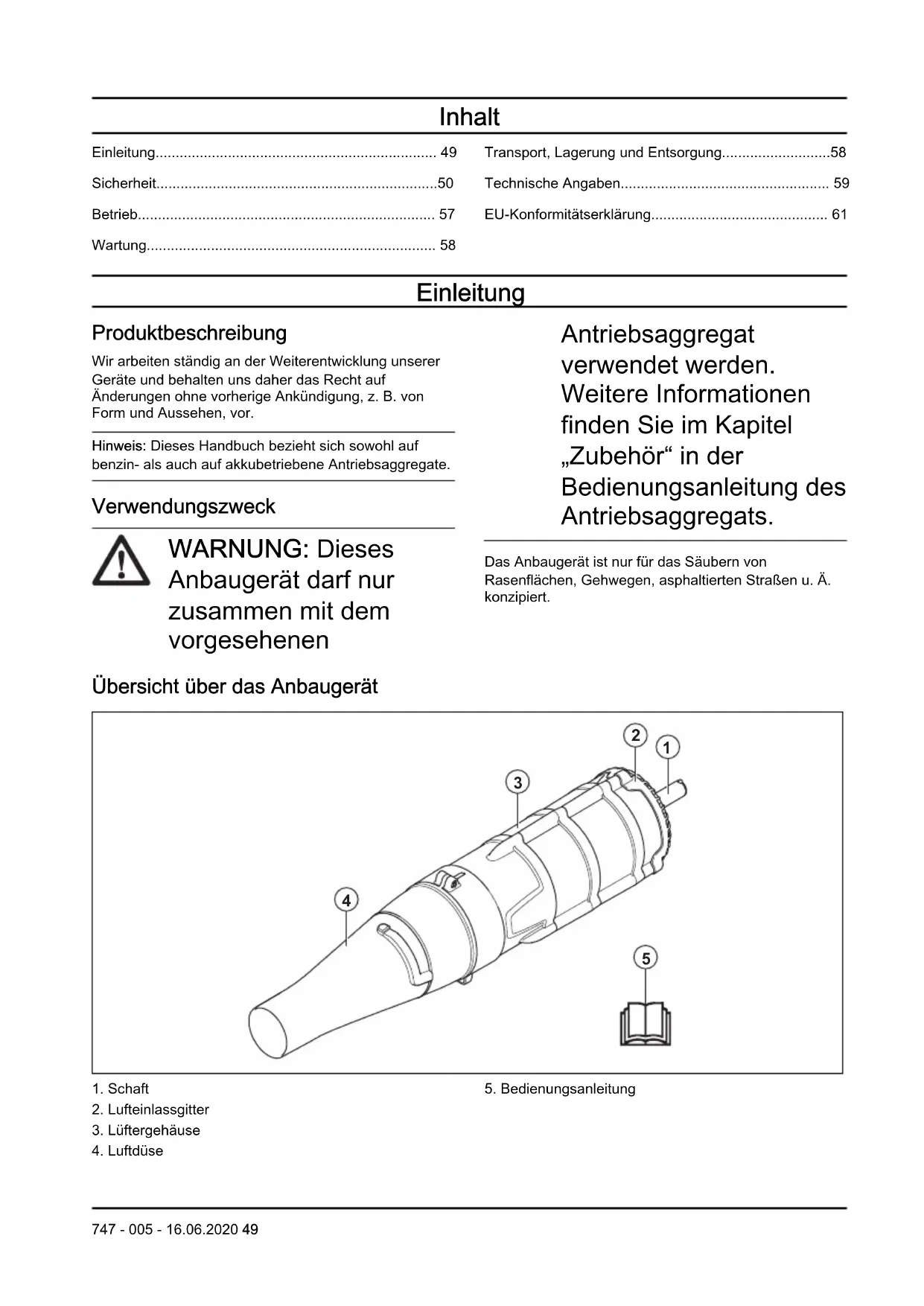 - EU-Konformitätserklärung Einleitung Produktbeschreibung Wir arbeiten ständig an der Weiterentwicklung unserer Geräte und behalten uns daher das Recht auf Änderungen ohne vorherige Ankündigung, z. B. von Form und Aussehen, vor. Hinweis: Dieses Handbuch bezieht sich sowohl auf benzin- als auch auf akkubetriebene Antriebsaggregate. Verwendungszweck WARNUNG: Dieses Anbaugerät darf nur zusammen mit dem vorgesehenen Antriebsaggregat verwendet werden. Weitere Informationen finden Sie im Kapitel „Zubehör“ in der Bedienungsanleitung des Antriebsaggregats. Das Anbaugerät ist nur für das Säubern von Rasenflächen, Gehwegen, asphaltierten Straßen u. Ä. konzipiert. Übersicht über das Anbaugerät p. 61