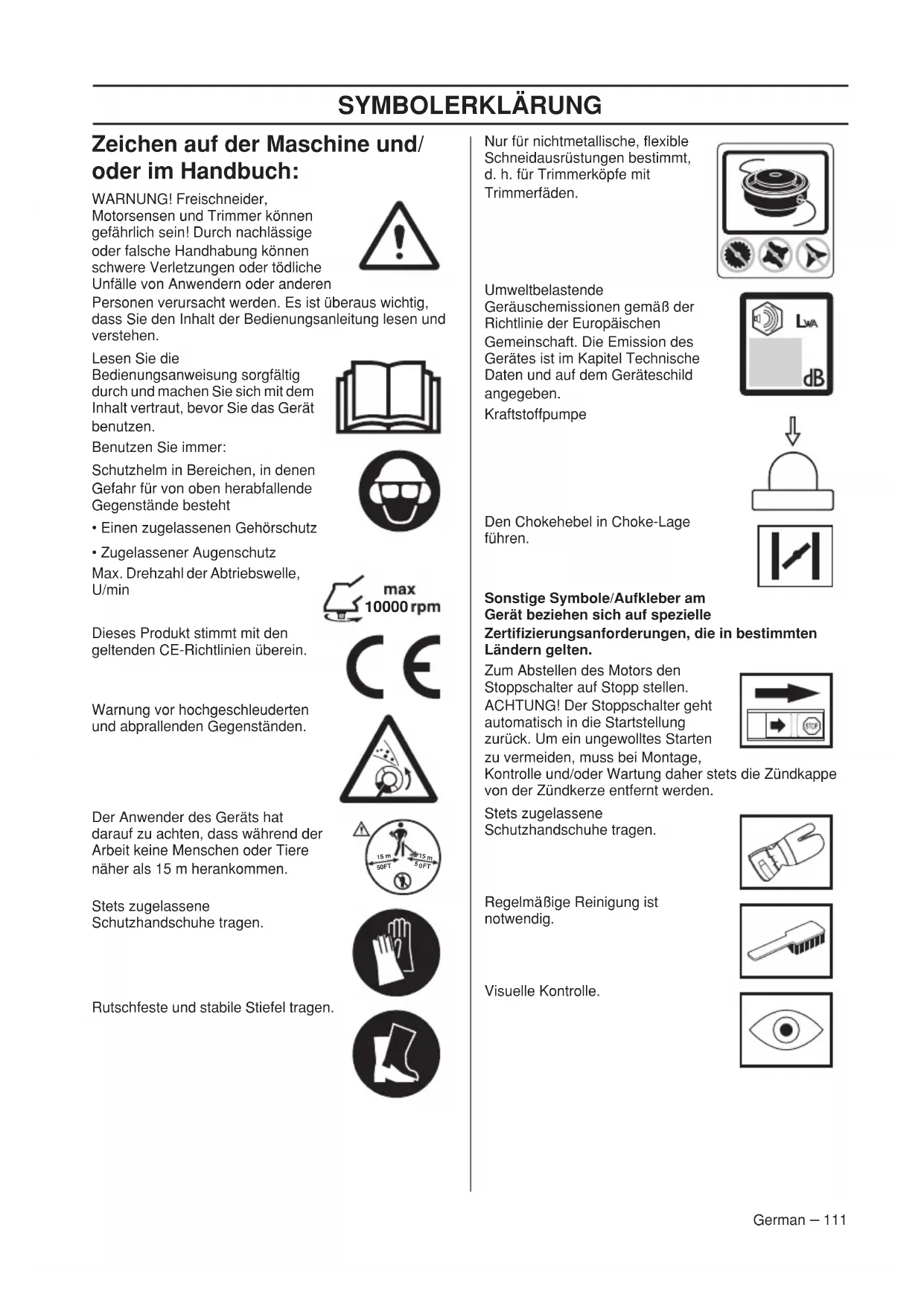 - Zugelassener Augenschutz Max. Drehzahl der Abtriebswelle, U/min Dieses Produkt stimmt mit den geltenden CE-Richtlinien überein. Warnung vor hochgeschleuderten und abprallenden Gegenständen. Der Anwender des Geräts hat darauf zu achten, dass während der Arbeit keine Menschen oder Tiere näher als 15 m herankommen. Stets zugelassene Schutzhandschuhe tragen. Rutschfeste und stabile Stiefel tragen. Nur für nichtmetallische, flexible Schneidausrüstungen bestimmt, d. h. für Trimmerköpfe mit Trimmerfäden. Umweltbelastende Geräuschemissionen gemäß der Richtlinie der Europäischen Gemeinschaft. Die Emission des Gerätes ist im Kapitel Technische Daten und auf dem Geräteschild angegeben. Kraftstoffpumpe Den Chokehebel in Choke-Lage führen. Sonstige Symbole/Aufkleber am Gerät beziehen sich auf spezielle Zertifizierungsanforderungen, die in bestimmten Ländern gelten. Zum Abstellen des Motors den Stoppschalter auf Stopp stellen. ACHTUNG! Der Stoppschalter geht automatisch in die Startstellung zurück. Um ein ungewolltes Starten zu vermeiden, muss bei Montage, Kontrolle und/oder Wartung daher stets die Zündkappe von der Zündkerze entfernt werden. Stets zugelassene Schutzhandschuhe tragen. Regelmäßige Reinigung ist notwendig. Visuelle Kontrolle.