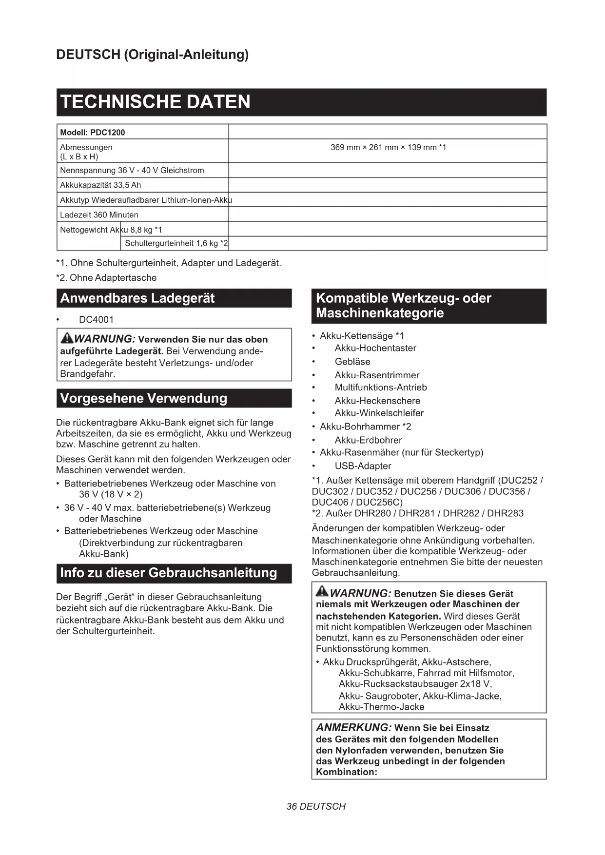 - Akku Drucksprühgerät, Akku-Astschere, Akku-Schubkarre, Fahrrad mit Hilfsmotor, Akku-Rucksackstaubsauger 2x18 V, Akku- Saugroboter, Akku-Klima-Jacke, Akku-Thermo-Jacke ANMERKUNG: Wenn Sie bei Einsatz des Gerätes mit den folgenden Modellen den Nylonfaden verwenden, benutzen Sie das Werkzeug unbedingt in der folgenden Kombination:37 DEUTSCH Modell DUR364L / DUR365U / DUR366L /