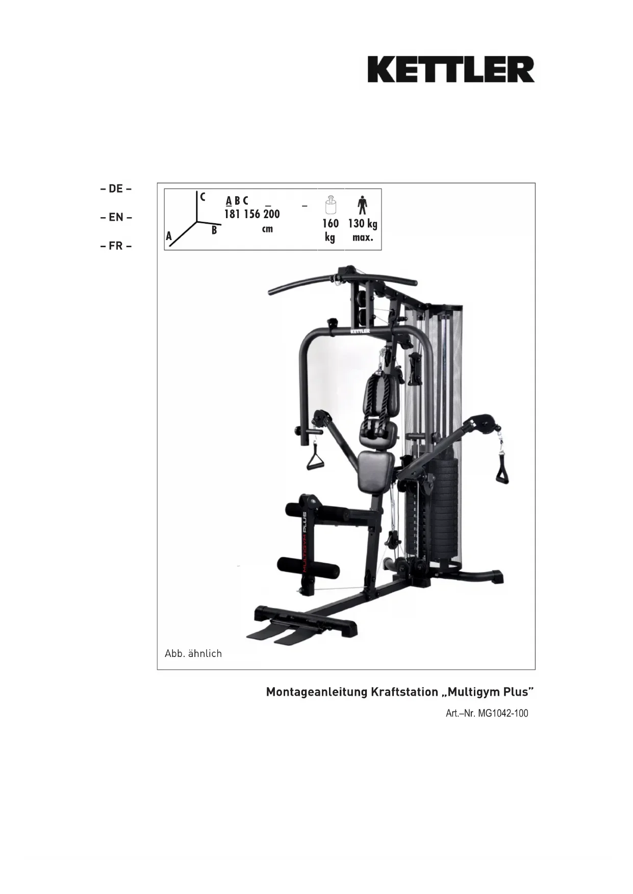Laden Sie die Anleitung für Ihr Fitnessgeräte kostenlos im PDF-Format! Finden Sie Ihr Handbuch Multigym Plus - KETTLER und nehmen Sie Ihr elektronisches Gerät wieder in die Hand. Auf dieser Seite sind alle Dokumente veröffentlicht, die für die Verwendung Ihres Geräts notwendig sind. Multigym Plus von der Marke KETTLER.