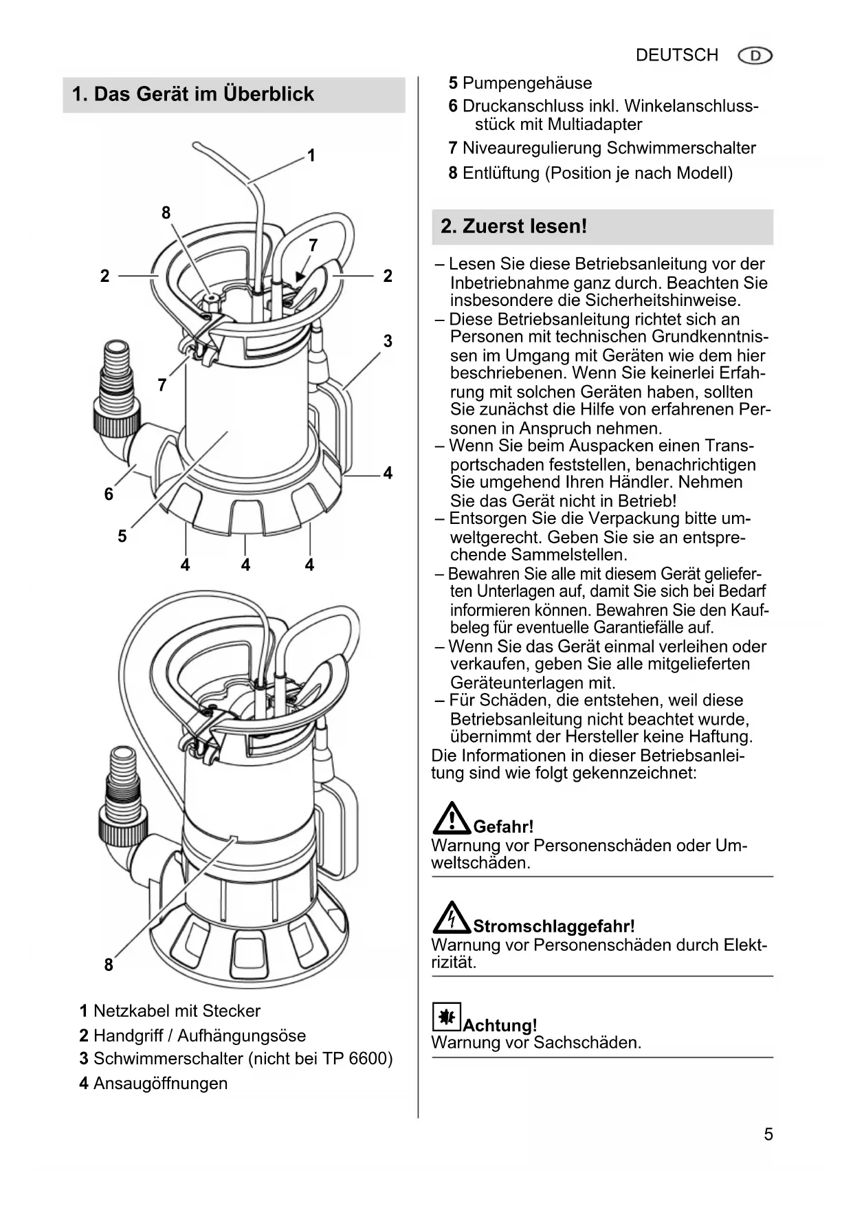 hinweise – Beachten Sie beim Gebrauch dieses Ge- rätes die folgenden Sicherheitshinweise, um Gefahren für Personen oder Sach- schäden auszuschließen. – Beachten Sie gesetzliche Richtlinien oder Unfallverhütungs-Vorschriften für den Um- gang mit Tauchpumpen. – Halten Sie beim Einsatz des Geräts in Schwimmbecken und Gartenteichen und in deren Schutzbereich an die Bestim- mungen nach DIN VDE 0100 -702, -738. Beachten Sie hierzu gegebenenfalls auch örtliche Vorschriften. – Die Absicherung des Gerätes muss mit ei- nem Fehlerstromschutzschalter (RCD) mit einem Bemessungsfehlerstrom von maxi- mal 30 mA erfolgen. AAllgemeine Gefahr! Betreiben Sie das Gerät nicht, wenn sich Personen in Kontakt mit der Förderflüssig- keit befinden (z.B im Schwimmbecken oder Gartenteich)! Die folgenden Restgefahren bestehen grundsätzlich beim Betrieb von Tauchpum- pen – sie lassen sich auch durch Sicher- heitsvorkehrungen nicht völlig beseitigen.