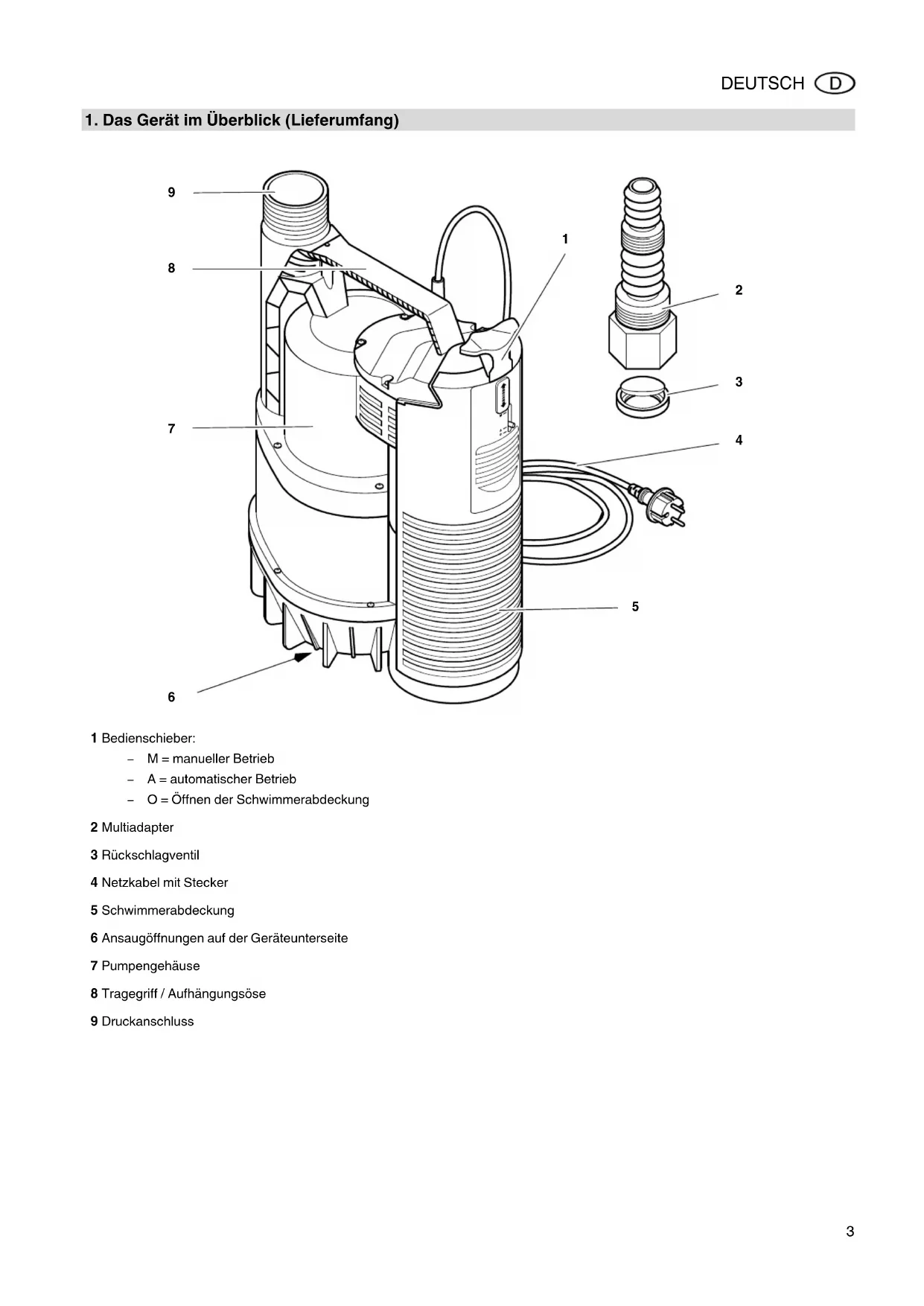 1 Bedienschieber: M = manueller Betrieb A = automatischer Betrieb O = Öffnen der Schwimmerabdeckung 2 Multiadapter 3 Rückschlagventil 4 Netzkabel mit Stecker 5 Schwimmerabdeckung 6 Ansaugöffnungen auf der Geräteunterseite 7 Pumpengehäuse 8 Tragegriff / Aufhängungsöse 9 Druckanschluss