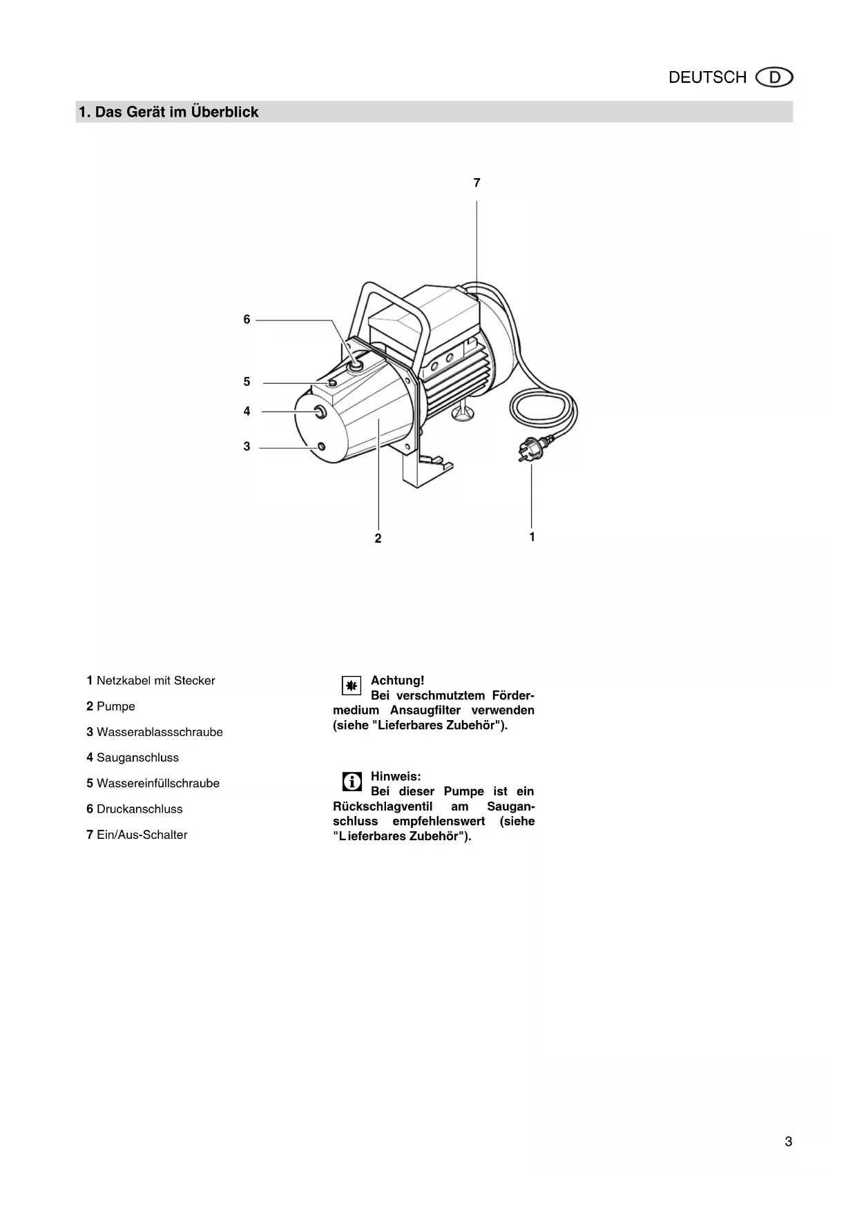 1 Netzkabel mit Stecker 2 Pumpe 3 Wasserablassschraube 4 Sauganschluss 5 Wassereinfüllschraube 6 Druckanschluss 7 Ein/Aus-Schalter