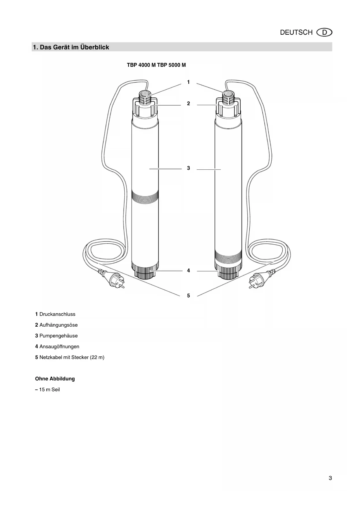 - 1 Druckanschluss 2 Aufhängungsöse 3 Pumpengehäuse 4 Ansaugöffnungen 5 Netzkabel mit Stecker (22 m) Ohne Abbildung – 15 m Seil XP0028D5.fm Originalbetriebsanleitung DEUTSCH4 DEUTSCH 1. Das Gerät im Überblick p. 32