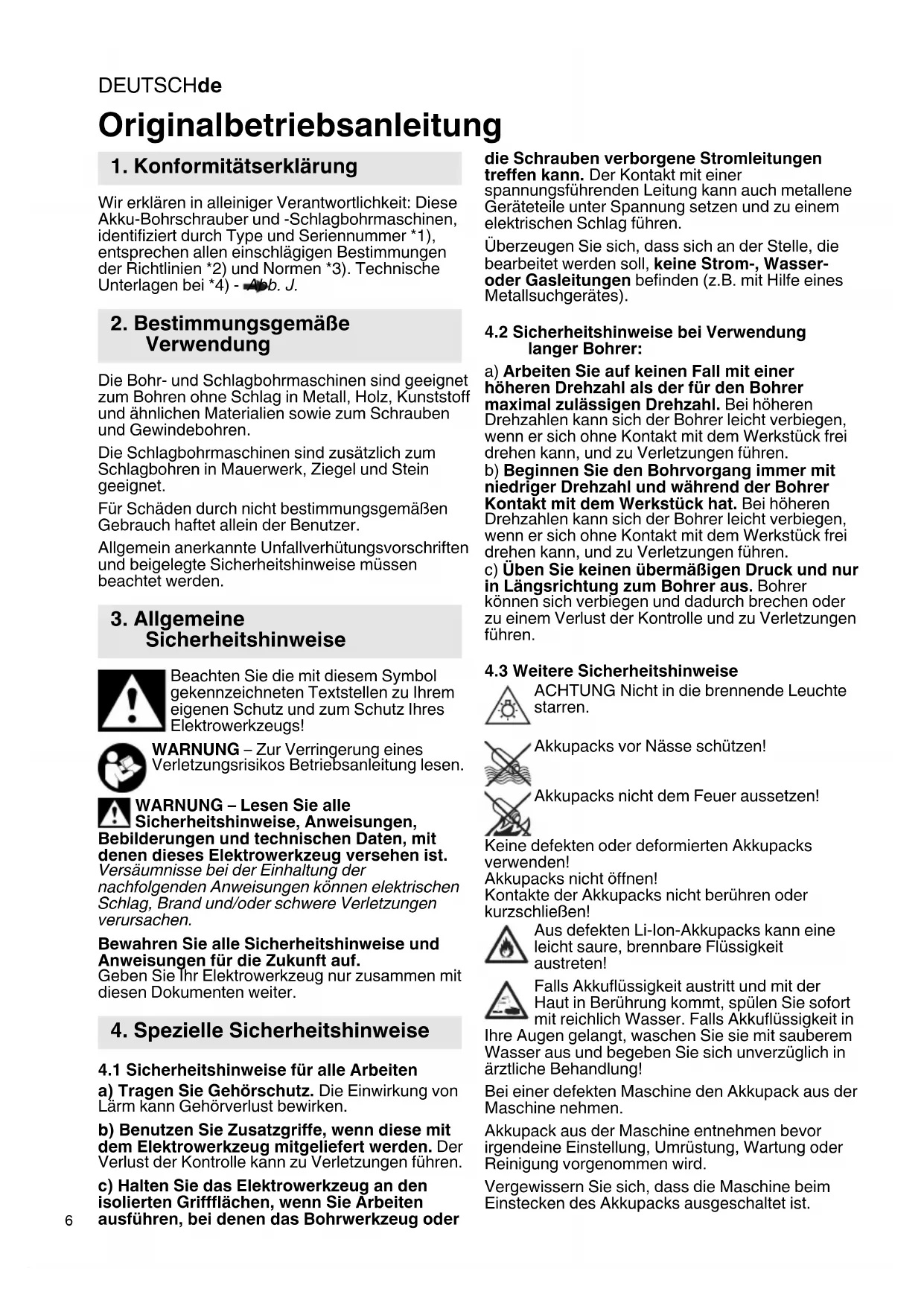 Wir erklären in alleiniger Verantwortlichkeit: Diese Akku-Bohrschrauber und -Schlagbohrmaschinen, identifiziert durch Type und Seriennummer *1), entsprechen allen einschlägigen Bestimmungen der Richtlinien *2) und Normen *3). Technische Unterlagen bei *4) - Abb. J. Die Bohr- und Schlagbohrmaschinen sind geeignet zum Bohren ohne Schlag in Metall, Holz, Kunststoff und ähnlichen Materialien sowie zum Schrauben und Gewindebohren. Die Schlagbohrmaschinen sind zusätzlich zum Schlagbohren in Mauerwerk, Ziegel und Stein geeignet. Für Schäden durch nicht bestimmungsgemäßen Gebrauch haftet allein der Benutzer. Allgemein anerkannte Unfallverhütungsvorschriften und beigelegte Sicherheitshinweise müssen beachtet werden. Beachten Sie die mit diesem Symbol gekennzeichneten Textstellen zu Ihrem eigenen Schutz und zum Schutz Ihres Elektrowerkzeugs! WARNUNG – Zur Verringerung eines Verletzungsrisikos Betriebsanleitung lesen. WARNUNG – Lesen Sie alle Sicherheitshinweise, Anweisungen, Bebilderungen und technischen Daten, mit denen dieses Elektrowerkzeug versehen ist. Versäumnisse bei der Einhaltung der nachfolgenden Anweisungen können elektrischen Schlag, Brand und/oder schwere Verletzungen verursachen. Bewahren Sie alle Sicherheitshinweise und Anweisungen für die Zukunft auf. Geben Sie Ihr Elektrowerkzeug nur zusammen mit diesen Dokumenten weiter.