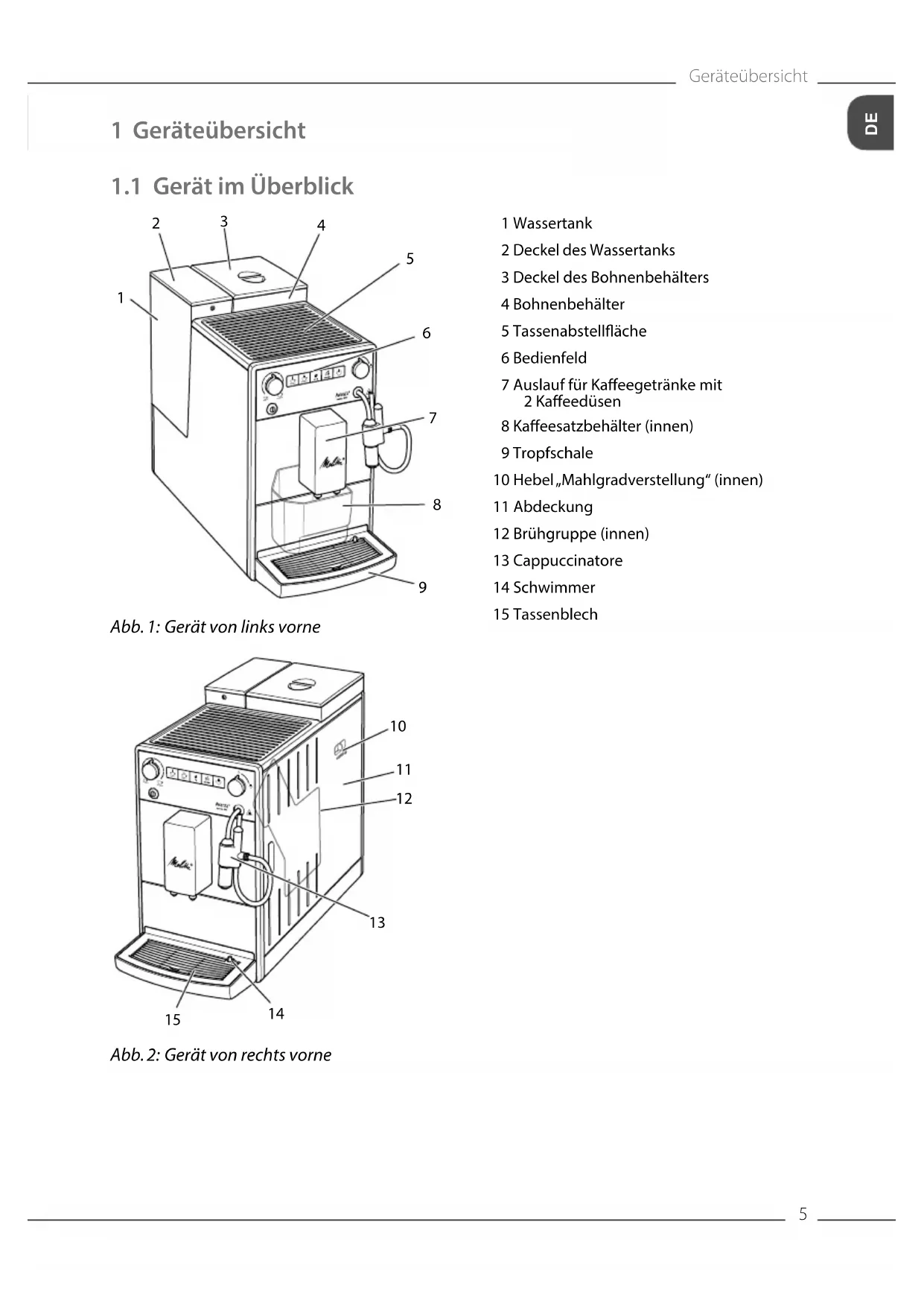 Abb. 2: Gerät von rechts vorne 1 Wassertank 2 Deckel des Wassertanks 3 Deckel des Bohnenbehälters 4 Bohnenbehälter 5 Tassenabstelläche 6 Bedienfeld 7 Auslauf für Kaeegetränke mit 2 Kaeedüsen 8 Kaeesatzbehälter (innen) 9 Tropfschale 10 Hebel „Mahlgradverstellung“ (innen) 11 Abdeckung 12 Brühgruppe (innen) 13 Cappuccinatore 14 Schwimmer 15 TassenblechGeräteübersicht