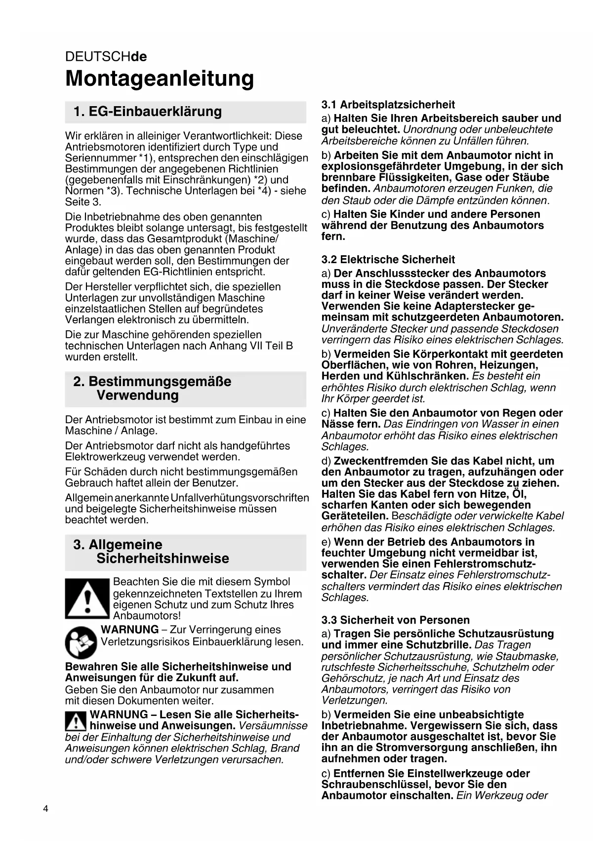 Montageanleitung Wir erklären in alleiniger Verantwortlichkeit: Diese Antriebsmotoren identifiziert durch Type und Seriennummer *1), entsprechen den einschlägigen Bestimmungen der angegebenen Richtlinien (gegebenenfalls mit Einschränkungen) *2) und Normen *3). Technische Unterlagen bei *4) - siehe Seite 3. Die Inbetriebnahme des oben genannten Produktes bleibt solange untersagt, bis festgestellt wurde, dass das Gesamtprodukt (Maschine/ Anlage) in das das oben genannten Produkt eingebaut werden soll, den Bestimmungen der dafür geltenden EG-Richtlinien entspricht. Der Hersteller verpflichtet sich, die speziellen Unterlagen zur unvollständigen Maschine einzelstaatlichen Stellen auf begründetes Verlangen elektronisch zu übermitteln. Die zur Maschine gehörenden speziellen technischen Unterlagen nach Anhang VII Teil B wurden erstellt. Der Antriebsmotor ist bestimmt zum Einbau in eine Maschine / Anlage. Der Antriebsmotor darf nicht als handgeführtes Elektrowerkzeug verwendet werden. Für Schäden durch nicht bestimmungsgemäßen Gebrauch haftet allein der Benutzer. Allgemein anerkannte Unfallverhütungsvorschriften und beigelegte Sicherheitshinweise müssen beachtet werden. Beachten Sie die mit diesem Symbol gekennzeichneten Textstellen zu Ihrem eigenen Schutz und zum Schutz Ihres Anbaumotors! WARNUNG – Zur Verringerung eines Verletzungsrisikos Einbauerklärung lesen. Bewahren Sie alle Sicherheitshinweise und Anweisungen für die Zukunft auf. Geben Sie den Anbaumotor nur zusammen mit diesen Dokumenten weiter. WARNUNG – Lesen Sie alle Sicherheits- hinweise und Anweisungen. Versäumnisse bei der Einhaltung der Sicherheitshinweise und Anweisungen können elektrischen Schlag, Brand und/oder schwere Verletzungen verursachen.