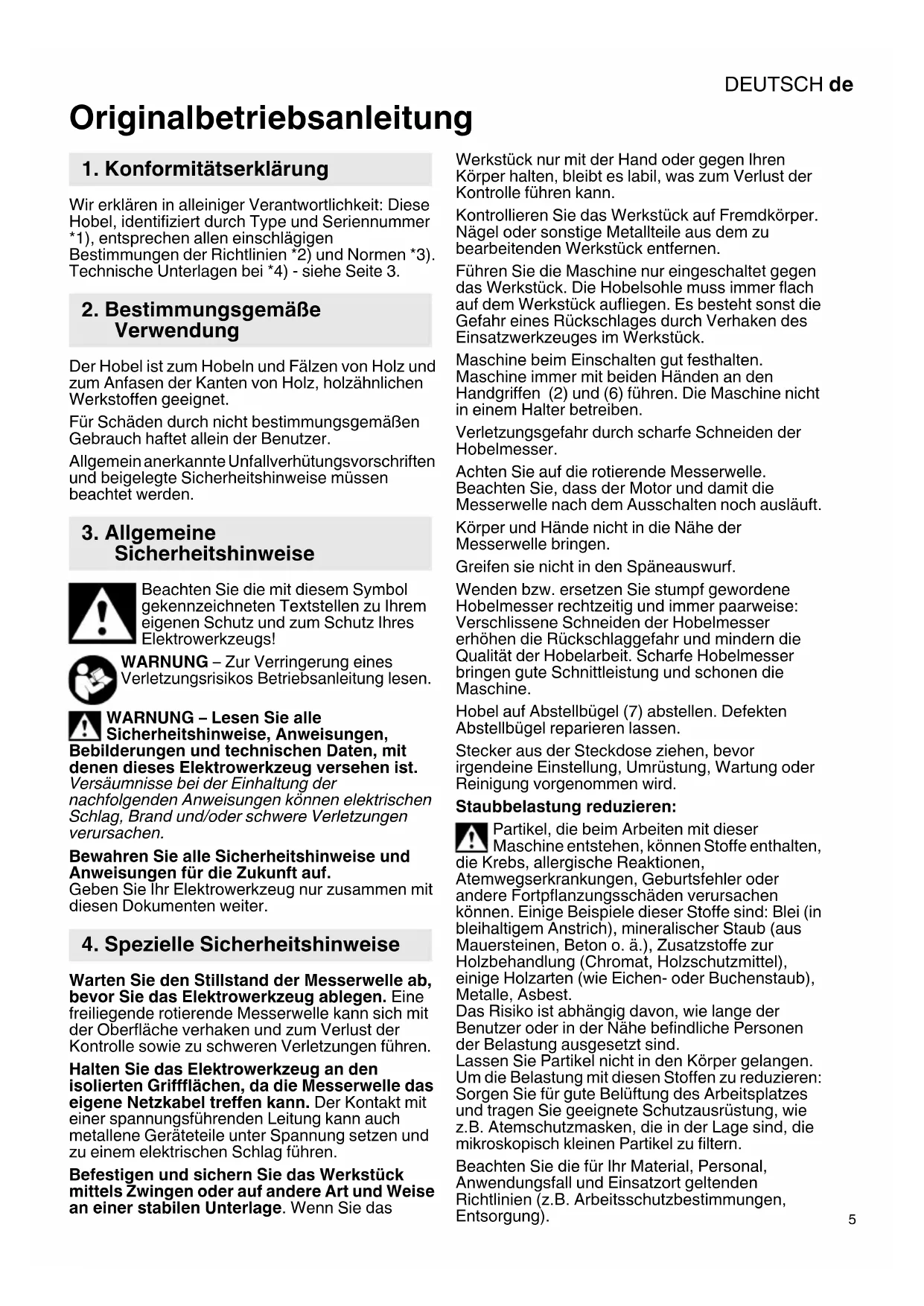 Originalbetriebsanleitung Wir erklären in alleiniger Verantwortlichkeit: Diese Hobel, identifiziert durch Type und Seriennummer *1), entsprechen allen einschlägigen Bestimmungen der Richtlinien *2) und Normen *3). Technische Unterlagen bei *4) - siehe Seite 3. Der Hobel ist zum Hobeln und Fälzen von Holz und zum Anfasen der Kanten von Holz, holzähnlichen Werkstoffen geeignet. Für Schäden durch nicht bestimmungsgemäßen Gebrauch haftet allein der Benutzer. Allgemein anerkannte Unfallverhütungsvorschriften und beigelegte Sicherheitshinweise müssen beachtet werden. Beachten Sie die mit diesem Symbol gekennzeichneten Textstellen zu Ihrem eigenen Schutz und zum Schutz Ihres Elektrowerkzeugs! WARNUNG – Zur Verringerung eines Verletzungsrisikos Betriebsanleitung lesen. WARNUNG – Lesen Sie alle Sicherheitshinweise, Anweisungen, Bebilderungen und technischen Daten, mit denen dieses Elektrowerkzeug versehen ist. Versäumnisse bei der Einhaltung der nachfolgenden Anweisungen können elektrischen Schlag, Brand und/oder schwere Verletzungen verursachen. Bewahren Sie alle Sicherheitshinweise und Anweisungen für die Zukunft auf. Geben Sie Ihr Elektrowerkzeug nur zusammen mit diesen Dokumenten weiter. Warten Sie den Stillstand der Messerwelle ab, bevor Sie das Elektrowerkzeug ablegen. Eine freiliegende rotierende Messerwelle kann sich mit der Oberfläche verhaken und zum Verlust der Kontrolle sowie zu schweren Verletzungen führen. Halten Sie das Elektrowerkzeug an den isolierten Griffflächen, da die Messerwelle das eigene Netzkabel treffen kann. Der Kontakt mit einer spannungsführenden Leitung kann auch metallene Geräteteile unter Spannung setzen und zu einem elektrischen Schlag führen. Befestigen und sichern Sie das Werkstück mittels Zwingen oder auf andere Art und Weise an einer stabilen Unterlage. Wenn Sie das Werkstück nur mit der Hand oder gegen Ihren Körper halten, bleibt es labil, was zum Verlust der Kontrolle führen kann. Kontrollieren Sie das Werkstück auf Fremdkörper. Nägel oder sonstige Metallteile aus dem zu bearbeitenden Werkstück entfernen. Führen Sie die Maschine nur eingeschaltet gegen das Werkstück. Die Hobelsohle muss immer flach auf dem Werkstück aufliegen. Es besteht sonst die Gefahr eines Rückschlages durch Verhaken des Einsatzwerkzeuges im Werkstück. Maschine beim Einschalten gut festhalten. Maschine immer mit beiden Händen an den Handgriffen (2) und (6) führen. Die Maschine nicht in einem Halter betreiben. Verletzungsgefahr durch scharfe Schneiden der Hobelmesser. Achten Sie auf die rotierende Messerwelle. Beachten Sie, dass der Motor und damit die Messerwelle nach dem Ausschalten noch ausläuft. Körper und Hände nicht in die Nähe der Messerwelle bringen. Greifen sie nicht in den Späneauswurf. Wenden bzw. ersetzen Sie stumpf gewordene Hobelmesser rechtzeitig und immer paarweise: Verschlissene Schneiden der Hobelmesser erhöhen die Rückschlaggefahr und mindern die Qualität der Hobelarbeit. Scharfe Hobelmesser bringen gute Schnittleistung und schonen die Maschine. Hobel auf Abstellbügel (7) abstellen. Defekten Abstellbügel reparieren lassen. Stecker aus der Steckdose ziehen, bevor irgendeine Einstellung, Umrüstung, Wartung oder Reinigung vorgenommen wird. Staubbelastung reduzieren: Partikel, die beim Arbeiten mit dieser Maschine entstehen, können Stoffe enthalten, die Krebs, allergische Reaktionen, Atemwegserkrankungen, Geburtsfehler oder andere Fortpflanzungsschäden verursachen können. Einige Beispiele dieser Stoffe sind: Blei (in bleihaltigem Anstrich), mineralischer Staub (aus Mauersteinen, Beton o. ä.), Zusatzstoffe zur Holzbehandlung (Chromat, Holzschutzmittel), einige Holzarten (wie Eichen- oder Buchenstaub), Metalle, Asbest. Das Risiko ist abhängig davon, wie lange der Benutzer oder in der Nähe befindliche Personen der Belastung ausgesetzt sind. Lassen Sie Partikel nicht in den Körper gelangen. Um die Belastung mit diesen Stoffen zu reduzieren: Sorgen Sie für gute Belüftung des Arbeitsplatzes und tragen Sie geeignete Schutzausrüstung, wie z.B. Atemschutzmasken, die in der Lage sind, die mikroskopisch kleinen Partikel zu filtern. Beachten Sie die für Ihr Material, Personal, Anwendungsfall und Einsatzort geltenden Richtlinien (z.B. Arbeitsschutzbestimmungen, Entsorgung).