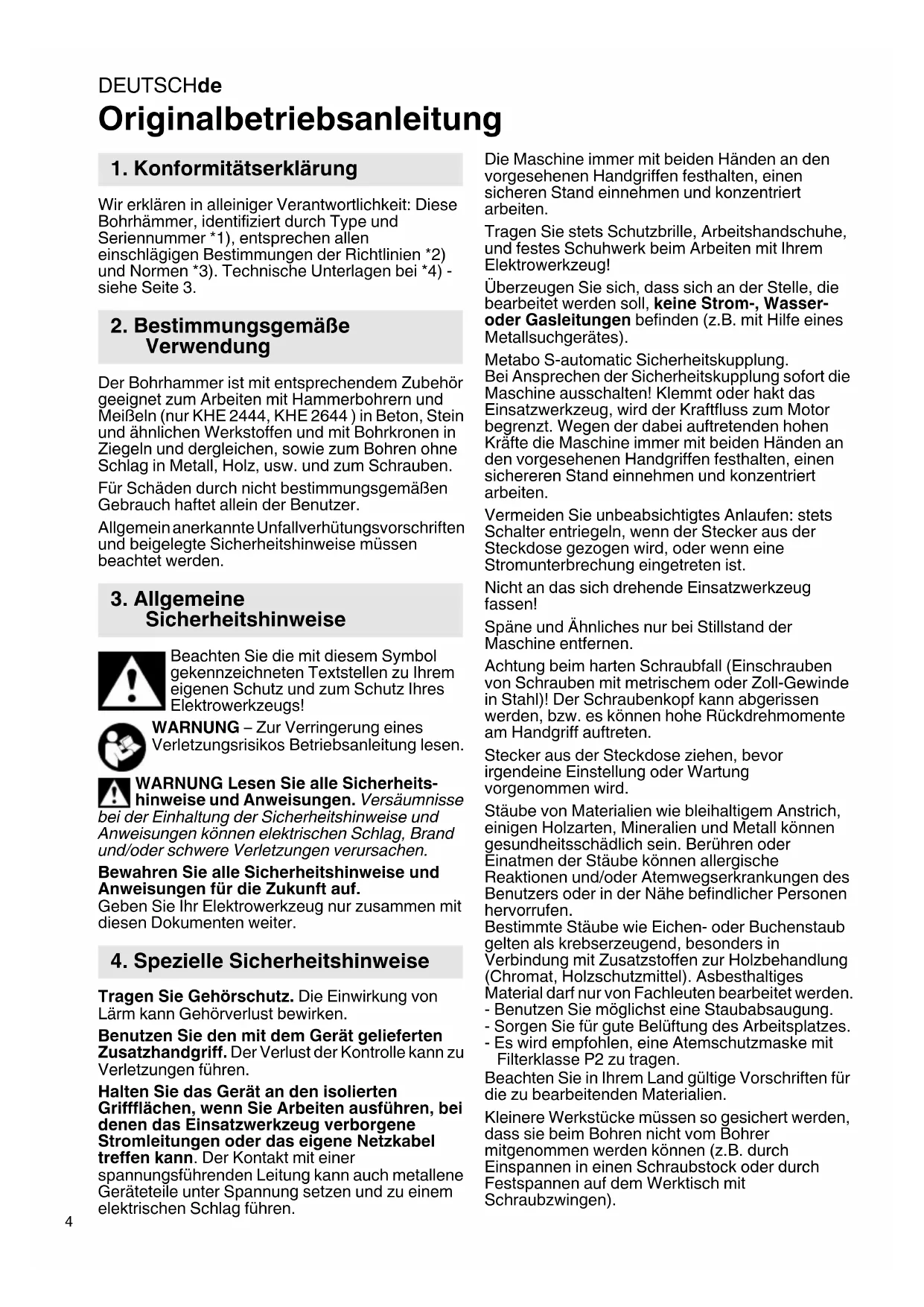 Originalbetriebsanleitung Wir erklären in alleiniger Verantwortlichkeit: Diese Bohrhämmer, identifiziert durch Type und Seriennummer *1), entsprechen allen einschlägigen Bestimmungen der Richtlinien *2) und Normen *3). Technische Unterlagen bei *4) - siehe Seite 3. Der Bohrhammer ist mit entsprechendem Zubehör geeignet zum Arbeiten mit Hammerbohrern und Meißeln (nur KHE 2444, KHE 2644 ) in Beton, Stein und ähnlichen Werkstoffen und mit Bohrkronen in Ziegeln und dergleichen, sowie zum Bohren ohne Schlag in Metall, Holz, usw. und zum Schrauben. Für Schäden durch nicht bestimmungsgemäßen Gebrauch haftet allein der Benutzer. Allgemein anerkannte Unfallverhütungsvorschriften und beigelegte Sicherheitshinweise müssen beachtet werden. Beachten Sie die mit diesem Symbol gekennzeichneten Textstellen zu Ihrem eigenen Schutz und zum Schutz Ihres Elektrowerkzeugs! WARNUNG – Zur Verringerung eines Verletzungsrisikos Betriebsanleitung lesen. WARNUNG Lesen Sie alle Sicherheits- hinweise und Anweisungen. Versäumnisse bei der Einhaltung der Sicherheitshinweise und Anweisungen können elektrischen Schlag, Brand und/oder schwere Verletzungen verursachen. Bewahren Sie alle Sicherheitshinweise und Anweisungen für die Zukunft auf. Geben Sie Ihr Elektrowerkzeug nur zusammen mit diesen Dokumenten weiter. Tragen Sie Gehörschutz. Die Einwirkung von Lärm kann Gehörverlust bewirken. Benutzen Sie den mit dem Gerät gelieferten Zusatzhandgriff. Der Verlust der Kontrolle kann zu Verletzungen führen. Halten Sie das Gerät an den isolierten Griffflächen, wenn Sie Arbeiten ausführen, bei denen das Einsatzwerkzeug verborgene Stromleitungen oder das eigene Netzkabel treffen kann. Der Kontakt mit einer spannungsführenden Leitung kann auch metallene Geräteteile unter Spannung setzen und zu einem elektrischen Schlag führen. Die Maschine immer mit beiden Händen an den vorgesehenen Handgriffen festhalten, einen sicheren Stand einnehmen und konzentriert arbeiten. Tragen Sie stets Schutzbrille, Arbeitshandschuhe, und festes Schuhwerk beim Arbeiten mit Ihrem Elektrowerkzeug! Überzeugen Sie sich, dass sich an der Stelle, die bearbeitet werden soll, keine Strom-, Wasser- oder Gasleitungen befinden (z.B. mit Hilfe eines Metallsuchgerätes). Metabo S-automatic Sicherheitskupplung. Bei Ansprechen der Sicherheitskupplung sofort die Maschine ausschalten! Klemmt oder hakt das Einsatzwerkzeug, wird der Kraftfluss zum Motor begrenzt. Wegen der dabei auftretenden hohen Kräfte die Maschine immer mit beiden Händen an den vorgesehenen Handgriffen festhalten, einen sichereren Stand einnehmen und konzentriert arbeiten. Vermeiden Sie unbeabsichtigtes Anlaufen: stets Schalter entriegeln, wenn der Stecker aus der Steckdose gezogen wird, oder wenn eine Stromunterbrechung eingetreten ist. Nicht an das sich drehende Einsatzwerkzeug fassen! Späne und Ähnliches nur bei Stillstand der Maschine entfernen. Achtung beim harten Schraubfall (Einschrauben von Schrauben mit metrischem oder Zoll-Gewinde in Stahl)! Der Schraubenkopf kann abgerissen werden, bzw. es können hohe Rückdrehmomente am Handgriff auftreten. Stecker aus der Steckdose ziehen, bevor irgendeine Einstellung oder Wartung vorgenommen wird. Stäube von Materialien wie bleihaltigem Anstrich, einigen Holzarten, Mineralien und Metall können gesundheitsschädlich sein. Berühren oder Einatmen der Stäube können allergische Reaktionen und/oder Atemwegserkrankungen des Benutzers oder in der Nähe befindlicher Personen hervorrufen. Bestimmte Stäube wie Eichen- oder Buchenstaub gelten als krebserzeugend, besonders in Verbindung mit Zusatzstoffen zur Holzbehandlung (Chromat, Holzschutzmittel). Asbesthaltiges Material darf nur von Fachleuten bearbeitet werden. - Benutzen Sie möglichst eine Staubabsaugung. - Sorgen Sie für gute Belüftung des Arbeitsplatzes. - Es wird empfohlen, eine Atemschutzmaske mit Filterklasse P2 zu tragen. Beachten Sie in Ihrem Land gültige Vorschriften für die zu bearbeitenden Materialien. Kleinere Werkstücke müssen so gesichert werden, dass sie beim Bohren nicht vom Bohrer mitgenommen werden können (z.B. durch Einspannen in einen Schraubstock oder durch Festspannen auf dem Werktisch mit Schraubzwingen).