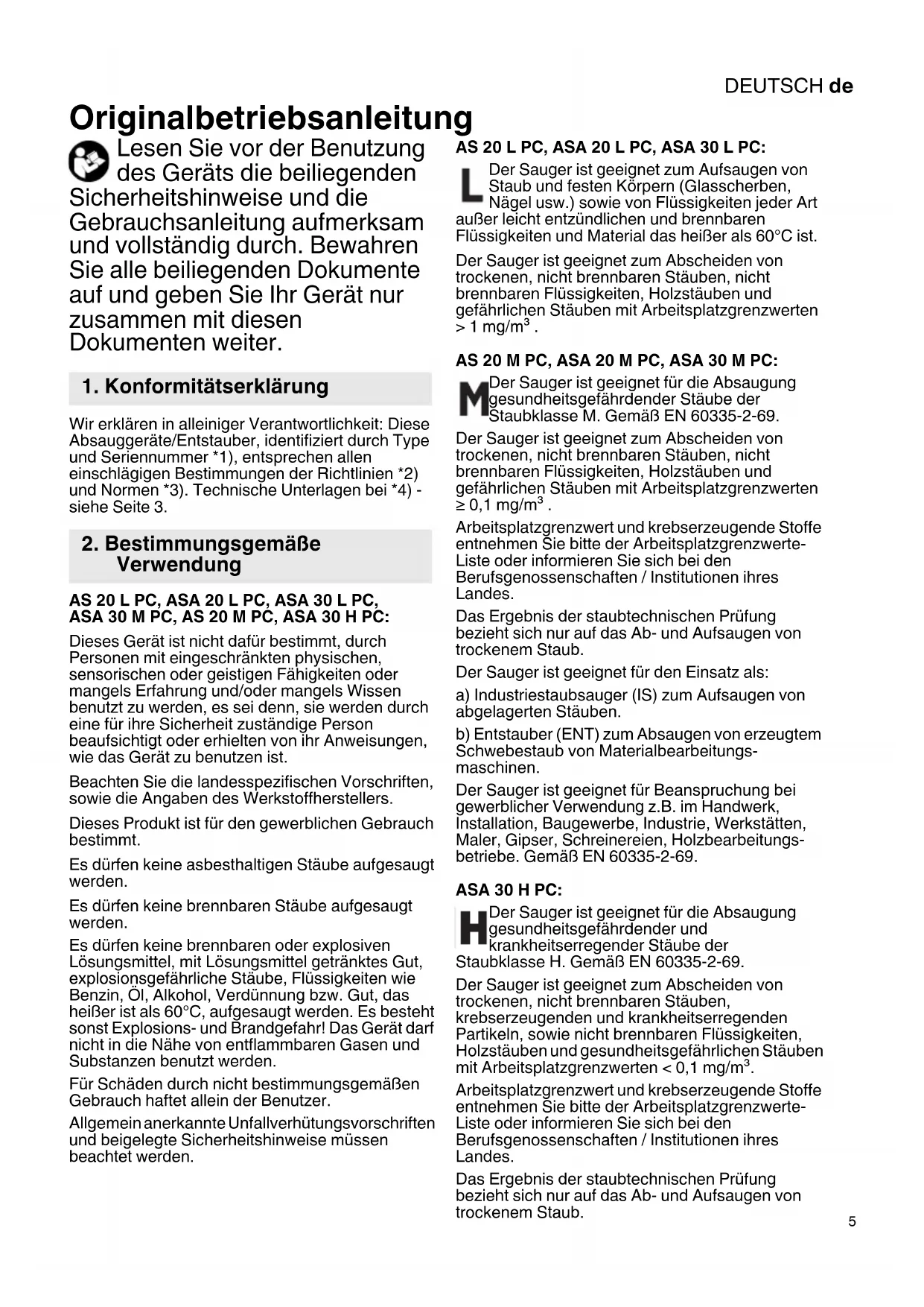 Originalbetriebsanleitung Lesen Sie vor der Benutzung des Geräts die beiliegenden Sicherheitshinweise und die Gebrauchsanleitung aufmerksam und vollständig durch. Bewahren Sie alle beiliegenden Dokumente auf und geben Sie Ihr Gerät nur zusammen mit diesen Dokumenten weiter. Wir erklären in alleiniger Verantwortlichkeit: Diese Absauggeräte/Entstauber, identifiziert durch Type und Seriennummer *1), entsprechen allen einschlägigen Bestimmungen der Richtlinien *2) und Normen *3). Technische Unterlagen bei *4) - siehe Seite 3. AS 20 L PC, ASA 20 L PC, ASA 30 L PC, ASA 30 M PC, AS 20 M PC, ASA 30 H PC: Dieses Gerät ist nicht dafür bestimmt, durch Personen mit eingeschränkten physischen, sensorischen oder geistigen Fähigkeiten oder mangels Erfahrung und/oder mangels Wissen benutzt zu werden, es sei denn, sie werden durch eine für ihre Sicherheit zuständige Person beaufsichtigt oder erhielten von ihr Anweisungen, wie das Gerät zu benutzen ist. Beachten Sie die landesspezifischen Vorschriften, sowie die Angaben des Werkstoffherstellers. Dieses Produkt ist für den gewerblichen Gebrauch bestimmt. Es dürfen keine asbesthaltigen Stäube aufgesaugt werden. Es dürfen keine brennbaren Stäube aufgesaugt werden. Es dürfen keine brennbaren oder explosiven Lösungsmittel, mit Lösungsmittel getränktes Gut, explosionsgefährliche Stäube, Flüssigkeiten wie Benzin, Öl, Alkohol, Verdünnung bzw. Gut, das heißer ist als 60°C, aufgesaugt werden. Es besteht sonst Explosions- und Brandgefahr! Das Gerät darf nicht in die Nähe von entflammbaren Gasen und Substanzen benutzt werden. Für Schäden durch nicht bestimmungsgemäßen Gebrauch haftet allein der Benutzer. Allgemein anerkannte Unfallverhütungsvorschriften und beigelegte Sicherheitshinweise müssen beachtet werden. AS 20 L PC, ASA 20 L PC, ASA 30 L PC: Der Sauger ist geeignet zum Aufsaugen von Staub und festen Körpern (Glasscherben, Nägel usw.) sowie von Flüssigkeiten jeder Art außer leicht entzündlichen und brennbaren Flüssigkeiten und Material das heißer als 60°C ist. Der Sauger ist geeignet zum Abscheiden von trockenen, nicht brennbaren Stäuben, nicht brennbaren Flüssigkeiten, Holzstäuben und gefährlichen Stäuben mit Arbeitsplatzgrenzwerten > 1 mg/m³ . AS 20 M PC, ASA 20 M PC, ASA 30 M PC: Der Sauger ist geeignet für die Absaugung gesundheitsgefährdender Stäube der Staubklasse M. Gemäß EN 60335-2-69. Der Sauger ist geeignet zum Abscheiden von trockenen, nicht brennbaren Stäuben, nicht brennbaren Flüssigkeiten, Holzstäuben und gefährlichen Stäuben mit Arbeitsplatzgrenzwerten ≥ 0,1 mg/m³ . Arbeitsplatzgrenzwert und krebserzeugende Stoffe entnehmen Sie bitte der Arbeitsplatzgrenzwerte- Liste oder informieren Sie sich bei den Berufsgenossenschaften / Institutionen ihres Landes. Das Ergebnis der staubtechnischen Prüfung bezieht sich nur auf das Ab- und Aufsaugen von trockenem Staub. Der Sauger ist geeignet für den Einsatz als: a) Industriestaubsauger (IS) zum Aufsaugen von abgelagerten Stäuben. b) Entstauber (ENT) zum Absaugen von erzeugtem Schwebestaub von Materialbearbeitungs- maschinen. Der Sauger ist geeignet für Beanspruchung bei gewerblicher Verwendung z.B. im Handwerk, Installation, Baugewerbe, Industrie, Werkstätten, Maler, Gipser, Schreinereien, Holzbearbeitungs- betriebe. Gemäß EN 60335-2-69. ASA 30 H PC: Der Sauger ist geeignet für die Absaugung gesundheitsgefährdender und krankheitserregender Stäube der Staubklasse H. Gemäß EN 60335-2-69. Der Sauger ist geeignet zum Abscheiden von trockenen, nicht brennbaren Stäuben, krebserzeugenden und krankheitserregenden Partikeln, sowie nicht brennbaren Flüssigkeiten, Holzstäuben und gesundheitsgefährlichen Stäuben mit Arbeitsplatzgrenzwerten < 0,1 mg/m³. Arbeitsplatzgrenzwert und krebserzeugende Stoffe entnehmen Sie bitte der Arbeitsplatzgrenzwerte- Liste oder informieren Sie sich bei den Berufsgenossenschaften / Institutionen ihres Landes. Das Ergebnis der staubtechnischen Prüfung bezieht sich nur auf das Ab- und Aufsaugen von trockenem Staub.