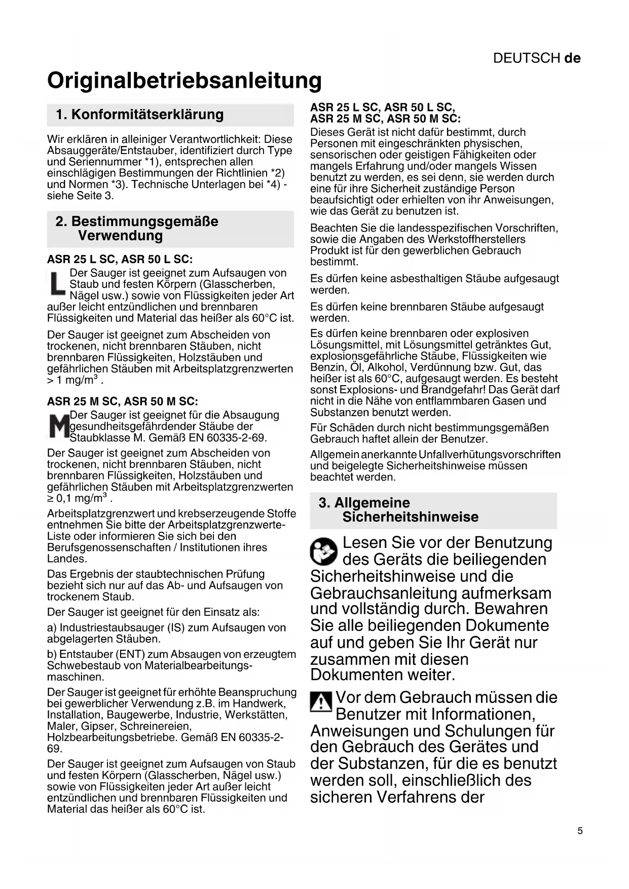 Originalbetriebsanleitung Wir erklären in alleiniger Verantwortlichkeit: Diese Absauggeräte/Entstauber, identifiziert durch Type und Seriennummer *1), entsprechen allen einschlägigen Bestimmungen der Richtlinien *2) und Normen *3). Technische Unterlagen bei *4) - siehe Seite 3. ASR 25 L SC, ASR 50 L SC: Der Sauger ist geeignet zum Aufsaugen von Staub und festen Körpern (Glasscherben, Nägel usw.) sowie von Flüssigkeiten jeder Art außer leicht entzündlichen und brennbaren Flüssigkeiten und Material das heißer als 60°C ist. Der Sauger ist geeignet zum Abscheiden von trockenen, nicht brennbaren Stäuben, nicht brennbaren Flüssigkeiten, Holzstäuben und gefährlichen Stäuben mit Arbeitsplatzgrenzwerten > 1 mg/m³ . ASR 25 M SC, ASR 50 M SC: Der Sauger ist geeignet für die Absaugung gesundheitsgefährdender Stäube der Staubklasse M. Gemäß EN 60335-2-69. Der Sauger ist geeignet zum Abscheiden von trockenen, nicht brennbaren Stäuben, nicht brennbaren Flüssigkeiten, Holzstäuben und gefährlichen Stäuben mit Arbeitsplatzgrenzwerten ≥ 0,1 mg/m³ . Arbeitsplatzgrenzwert und krebserzeugende Stoffe entnehmen Sie bitte der Arbeitsplatzgrenzwerte- Liste oder informieren Sie sich bei den Berufsgenossenschaften / Institutionen ihres Landes. Das Ergebnis der staubtechnischen Prüfung bezieht sich nur auf das Ab- und Aufsaugen von trockenem Staub. Der Sauger ist geeignet für den Einsatz als: a) Industriestaubsauger (IS) zum Aufsaugen von abgelagerten Stäuben. b) Entstauber (ENT) zum Absaugen von erzeugtem Schwebestaub von Materialbearbeitungs- maschinen. Der Sauger ist geeignet für erhöhte Beanspruchung bei gewerblicher Verwendung z.B. im Handwerk, Installation, Baugewerbe, Industrie, Werkstätten, Maler, Gipser, Schreinereien, Holzbearbeitungsbetriebe. Gemäß EN 60335-2-