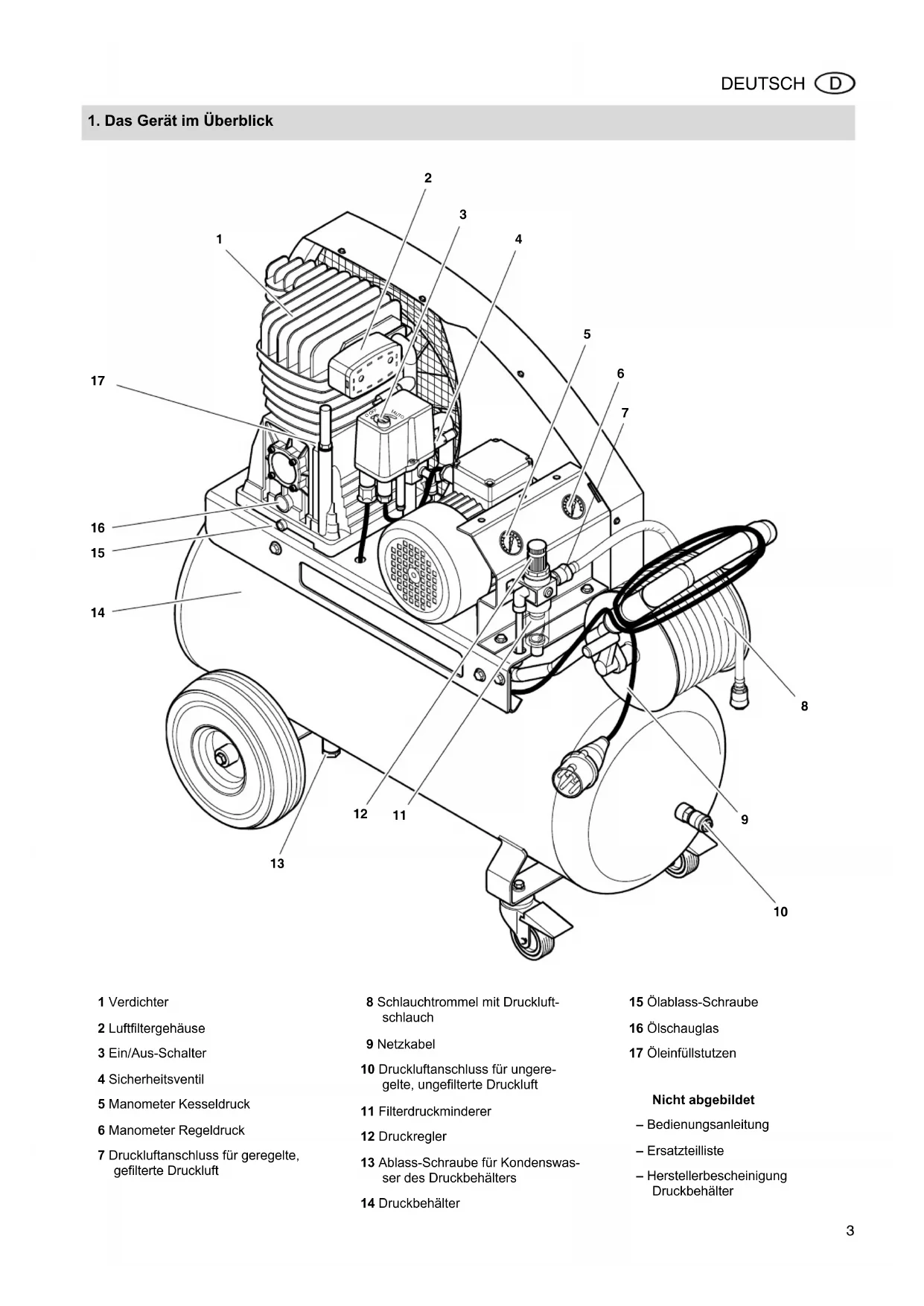 - Bewahren Sie diese Betriebsanleitung gut auf, damit Sie bei Unklarheiten jederzeit nachlesen können. Falls der Kompressor gewerblich genutzt wird, bewahren Sie auch die Prüfbescheinigungen der Druckluftkomponenten auf.