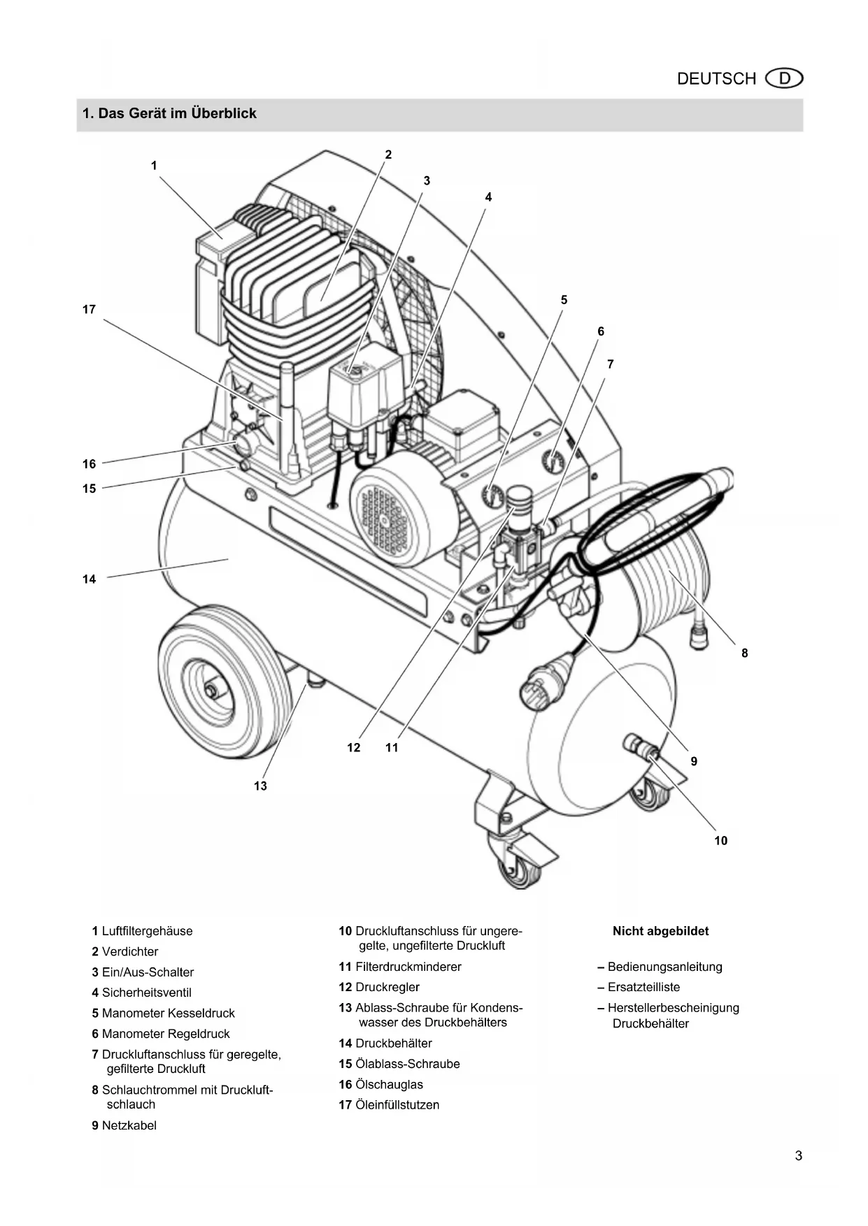 1 Luftfiltergehäuse 2 Verdichter 3 Ein/Aus-Schalter 4 Sicherheitsventil 5 Manometer Kesseldruck 6 Manometer Regeldruck 7 Druckluftanschluss für geregelte, gefilterte Druckluft 8 Schlauchtrommel mit Druckluft- schlauch 9 Netzkabel 10 Druckluftanschluss für ungere- gelte, ungefilterte Druckluft 11 Filterdruckminderer 12 Druckregler 13 Ablass-Schraube für Kondens- wasser des Druckbehälters 14 Druckbehälter 15 Ölablass-Schraube 16 Ölschauglas 17 Öleinfüllstutzen Nicht abgebildet – Bedienungsanleitung – Ersatzteilliste – Herstellerbescheinigung Druckbehälter XK0017D2.fm Betriebsanleitung DEUTSCH4 DEUTSCH