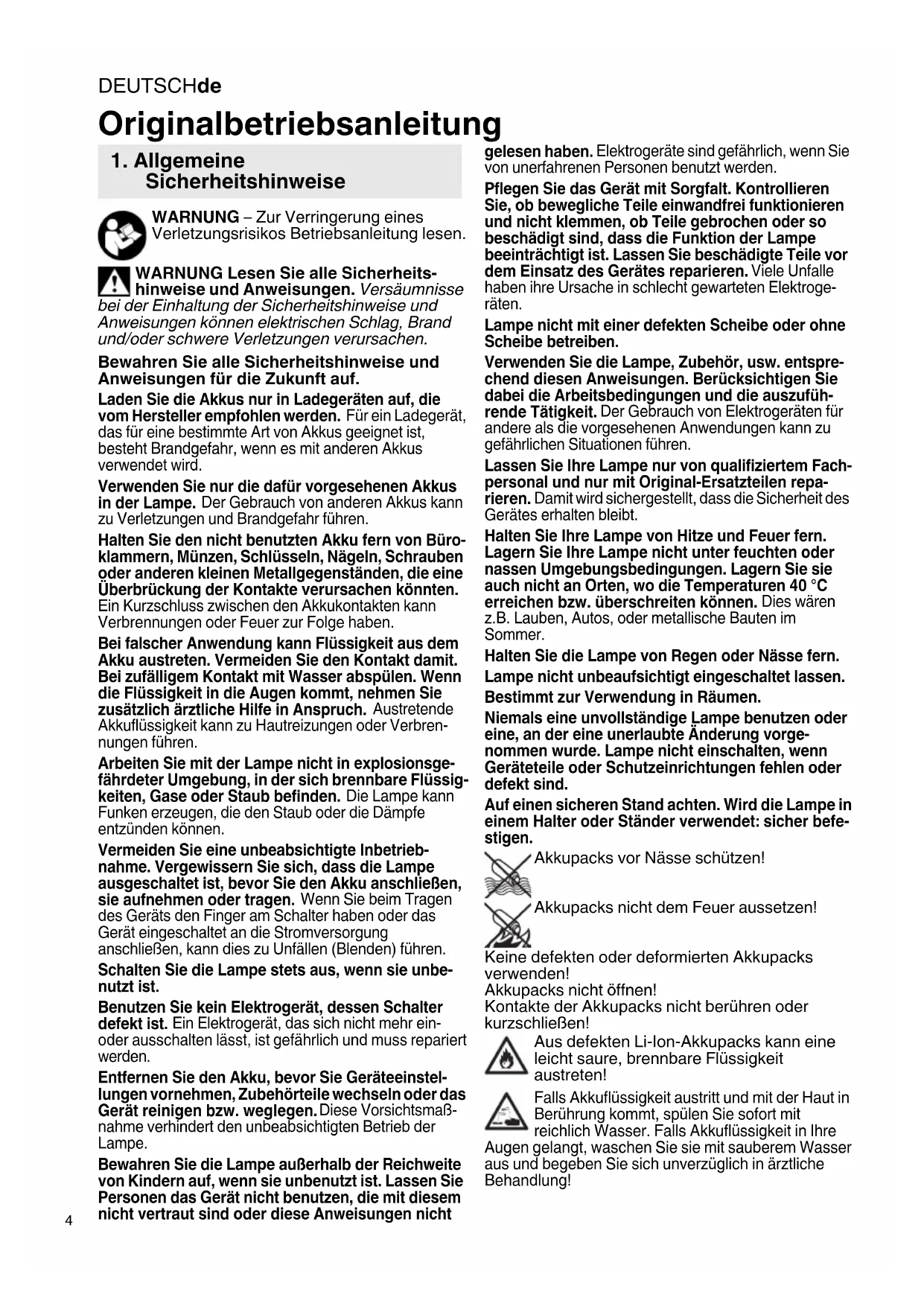 WARNUNG – Zur Verringerung eines Verletzungsrisikos Betriebsanleitung lesen. WARNUNG Lesen Sie alle Sicherheits- hinweise und Anweisungen. Versäumnisse bei der Einhaltung der Sicherheitshinweise und Anweisungen können elektrischen Schlag, Brand und/oder schwere Verletzungen verursachen. Bewahren Sie alle Sicherheitshinweise und Anweisungen für die Zukunft auf. Laden Sie die Akkus nur in Ladegeräten auf, die vom Hersteller empfohlen werden. Für ein Ladegerät, das für eine bestimmte Art von Akkus geeignet ist, besteht Brandgefahr, wenn es mit anderen Akkus verwendet wird. Verwenden Sie nur die dafür vorgesehenen Akkus in der Lampe. Der Gebrauch von anderen Akkus kann zu Verletzungen und Brandgefahr führen. Halten Sie den nicht benutzten Akku fern von Büro- klammern, Münzen, Schlüsseln, Nägeln, Schrauben oder anderen kleinen Metallgegenständen, die eine Überbrückung der Kontakte verursachen könnten. Ein Kurzschluss zwischen den Akkukontakten kann Verbrennungen oder Feuer zur Folge haben. Bei falscher Anwendung kann Flüssigkeit aus dem Akku austreten. Vermeiden Sie den Kontakt damit. Bei zufälligem Kontakt mit Wasser abspülen. Wenn die Flüssigkeit in die Augen kommt, nehmen Sie zusätzlich ärztliche Hilfe in Anspruch. Austretende Akkuflüssigkeit kann zu Hautreizungen oder Verbren- nungen führen. Arbeiten Sie mit der Lampe nicht in explosionsge- fährdeter Umgebung, in der sich brennbare Flüssig- keiten, Gase oder Staub befinden. Die Lampe kann Funken erzeugen, die den Staub oder die Dämpfe entzünden können. Vermeiden Sie eine unbeabsichtigte Inbetrieb- nahme. Vergewissern Sie sich, dass die Lampe ausgeschaltet ist, bevor Sie den Akku anschließen, sie aufnehmen oder tragen. Wenn Sie beim Tragen des Geräts den Finger am Schalter haben oder das Gerät eingeschaltet an die Stromversorgung anschließen, kann dies zu Unfällen (Blenden) führen. Schalten Sie die Lampe stets aus, wenn sie unbe- nutzt ist. Benutzen Sie kein Elektrogerät, dessen Schalter defekt ist. Ein Elektrogerät, das sich nicht mehr ein- oder ausschalten lässt, ist gefährlich und muss repariert werden. Entfernen Sie den Akku, bevor Sie Geräteeinstel- lungen vornehmen, Zubehörteile wechseln oder das Gerät reinigen bzw. weglegen. Diese Vorsichtsmaß- nahme verhindert den unbeabsichtigten Betrieb der Lampe. Bewahren Sie die Lampe außerhalb der Reichweite von Kindern auf, wenn sie unbenutzt ist. Lassen Sie Personen das Gerät nicht benutzen, die mit diesem nicht vertraut sind oder diese Anweisungen nicht gelesen haben. Elektrogeräte sind gefährlich, wenn Sie von unerfahrenen Personen benutzt werden. Pflegen Sie das Gerät mit Sorgfalt. Kontrollieren Sie, ob bewegliche Teile einwandfrei funktionieren und nicht klemmen, ob Teile gebrochen oder so beschädigt sind, dass die Funktion der Lampe beeinträchtigt ist. Lassen Sie beschädigte Teile vor dem Einsatz des Gerätes reparieren. Viele Unfalle haben ihre Ursache in schlecht gewarteten Elektroge- räten. Lampe nicht mit einer defekten Scheibe oder ohne Scheibe betreiben. Verwenden Sie die Lampe, Zubehör, usw. entspre- chend diesen Anweisungen. Berücksichtigen Sie dabei die Arbeitsbedingungen und die auszufüh- rende Tätigkeit. Der Gebrauch von Elektrogeräten für andere als die vorgesehenen Anwendungen kann zu gefährlichen Situationen führen. Lassen Sie Ihre Lampe nur von qualifiziertem Fach- personal und nur mit Original-Ersatzteilen repa- rieren. Damit wird sichergestellt, dass die Sicherheit des Gerätes erhalten bleibt. Halten Sie Ihre Lampe von Hitze und Feuer fern. Lagern Sie Ihre Lampe nicht unter feuchten oder nassen Umgebungsbedingungen. Lagern Sie sie auch nicht an Orten, wo die Temperaturen 40 °C erreichen bzw. überschreiten können. Dies wären z.B. Lauben, Autos, oder metallische Bauten im Sommer. Halten Sie die Lampe von Regen oder Nässe fern. Lampe nicht unbeaufsichtigt eingeschaltet lassen. Bestimmt zur Verwendung in Räumen. Niemals eine unvollständige Lampe benutzen oder eine, an der eine unerlaubte Änderung vorge- nommen wurde. Lampe nicht einschalten, wenn Geräteteile oder Schutzeinrichtungen fehlen oder defekt sind. Auf einen sicheren Stand achten. Wird die Lampe in einem Halter oder Ständer verwendet: sicher befe- stigen. Akkupacks vor Nässe schützen! Akkupacks nicht dem Feuer aussetzen! Keine defekten oder deformierten Akkupacks verwenden! Akkupacks nicht öffnen! Kontakte der Akkupacks nicht berühren oder kurzschließen! Aus defekten Li-Ion-Akkupacks kann eine leicht saure, brennbare Flüssigkeit austreten! Falls Akkuflüssigkeit austritt und mit der Haut in Berührung kommt, spülen Sie sofort mit reichlich Wasser. Falls Akkuflüssigkeit in Ihre Augen gelangt, waschen Sie sie mit sauberem Wasser aus und begeben Sie sich unverzüglich in ärztliche Behandlung! Originalbetriebsanleitung