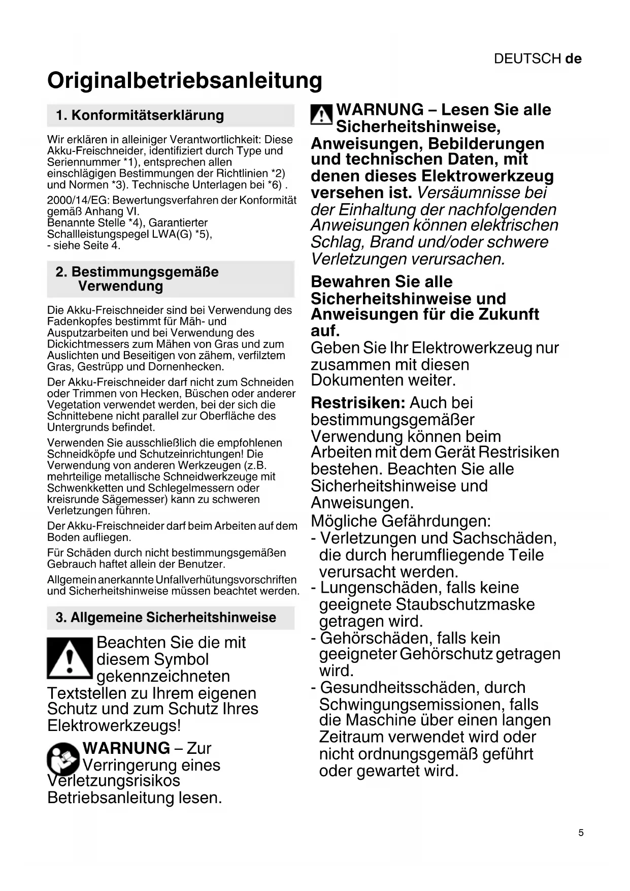 Originalbetriebsanleitung Wir erklären in alleiniger Verantwortlichkeit: Diese Akku-Freischneider, identifiziert durch Type und Seriennummer *1), entsprechen allen einschlägigen Bestimmungen der Richtlinien *2) und Normen *3). Technische Unterlagen bei *6) . 2000/14/EG: Bewertungsverfahren der Konformität gemäß Anhang VI. Benannte Stelle *4), Garantierter Schallleistungspegel LWA(G) *5), - siehe Seite 4. Die Akku-Freischneider sind bei Verwendung des Fadenkopfes bestimmt für Mäh- und Ausputzarbeiten und bei Verwendung des Dickichtmessers zum Mähen von Gras und zum Auslichten und Beseitigen von zähem, verfilztem Gras, Gestrüpp und Dornenhecken. Der Akku-Freischneider darf nicht zum Schneiden oder Trimmen von Hecken, Büschen oder anderer Vegetation verwendet werden, bei der sich die Schnittebene nicht parallel zur Oberfläche des Untergrunds befindet. Verwenden Sie ausschließlich die empfohlenen Schneidköpfe und Schutzeinrichtungen! Die Verwendung von anderen Werkzeugen (z.B. mehrteilige metallische Schneidwerkzeuge mit Schwenkketten und Schlegelmessern oder kreisrunde Sägemesser) kann zu schweren Verletzungen führen. Der Akku-Freischneider darf beim Arbeiten auf dem Boden aufliegen. Für Schäden durch nicht bestimmungsgemäßen Gebrauch haftet allein der Benutzer. Allgemein anerkannte Unfallverhütungsvorschriften und Sicherheitshinweise müssen beachtet werden. Beachten Sie die mit diesem Symbol gekennzeichneten Textstellen zu Ihrem eigenen Schutz und zum Schutz Ihres Elektrowerkzeugs! WARNUNG – Zur Verringerung eines Verletzungsrisikos Betriebsanleitung lesen. WARNUNG – Lesen Sie alle Sicherheitshinweise, Anweisungen, Bebilderungen und technischen Daten, mit denen dieses Elektrowerkzeug versehen ist. Versäumnisse bei der Einhaltung der nachfolgenden Anweisungen können elektrischen Schlag, Brand und/oder schwere Verletzungen verursachen. Bewahren Sie alle Sicherheitshinweise und Anweisungen für die Zukunft auf. Geben Sie Ihr Elektrowerkzeug nur zusammen mit diesen Dokumenten weiter. Restrisiken: Auch bei bestimmungsgemäßer Verwendung können beim Arbeiten mit dem Gerät Restrisiken bestehen. Beachten Sie alle Sicherheitshinweise und Anweisungen. Mögliche Gefährdungen: - Verletzungen und Sachschäden, die durch herumfliegende Teile verursacht werden. - Lungenschäden, falls keine geeignete Staubschutzmaske getragen wird. - Gehörschäden, falls kein geeigneter Gehörschutz getragen wird. - Gesundheitsschäden, durch Schwingungsemissionen, falls die Maschine über einen langen Zeitraum verwendet wird oder nicht ordnungsgemäß geführt oder gewartet wird.