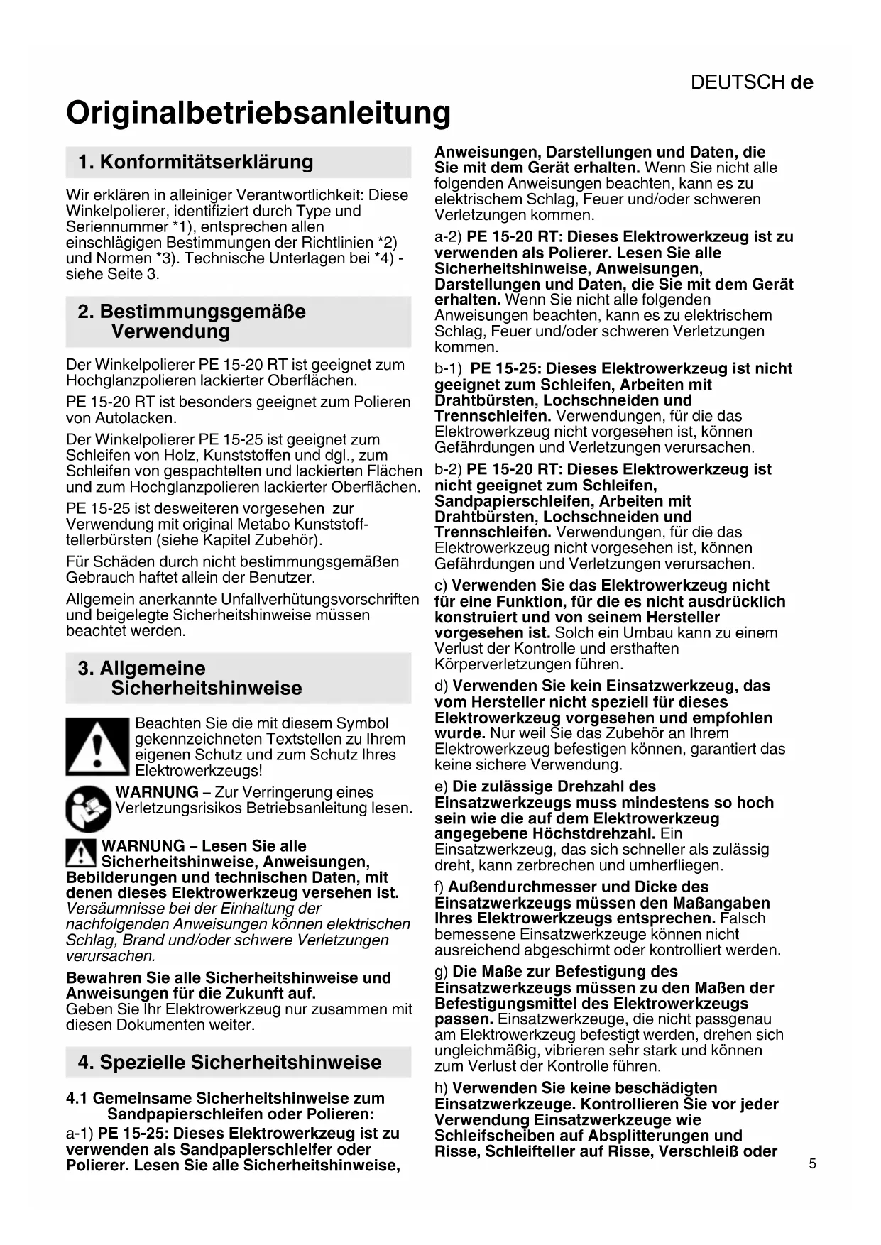 Originalbetriebsanleitung Wir erklären in alleiniger Verantwortlichkeit: Diese Winkelpolierer, identifiziert durch Type und Seriennummer *1), entsprechen allen einschlägigen Bestimmungen der Richtlinien *2) und Normen *3). Technische Unterlagen bei *4) - siehe Seite 3. Der Winkelpolierer PE 15-20 RT ist geeignet zum Hochglanzpolieren lackierter Oberflächen. PE 15-20 RT ist besonders geeignet zum Polieren von Autolacken. Der Winkelpolierer PE 15-25 ist geeignet zum Schleifen von Holz, Kunststoffen und dgl., zum Schleifen von gespachtelten und lackierten Flächen und zum Hochglanzpolieren lackierter Oberflächen. PE 15-25 ist desweiteren vorgesehen zur Verwendung mit original Metabo Kunststoff- tellerbürsten (siehe Kapitel Zubehör). Für Schäden durch nicht bestimmungsgemäßen Gebrauch haftet allein der Benutzer. Allgemein anerkannte Unfallverhütungsvorschriften und beigelegte Sicherheitshinweise müssen beachtet werden. Beachten Sie die mit diesem Symbol gekennzeichneten Textstellen zu Ihrem eigenen Schutz und zum Schutz Ihres Elektrowerkzeugs! WARNUNG – Zur Verringerung eines Verletzungsrisikos Betriebsanleitung lesen. WARNUNG – Lesen Sie alle Sicherheitshinweise, Anweisungen, Bebilderungen und technischen Daten, mit denen dieses Elektrowerkzeug versehen ist. Versäumnisse bei der Einhaltung der nachfolgenden Anweisungen können elektrischen Schlag, Brand und/oder schwere Verletzungen verursachen. Bewahren Sie alle Sicherheitshinweise und Anweisungen für die Zukunft auf. Geben Sie Ihr Elektrowerkzeug nur zusammen mit diesen Dokumenten weiter.