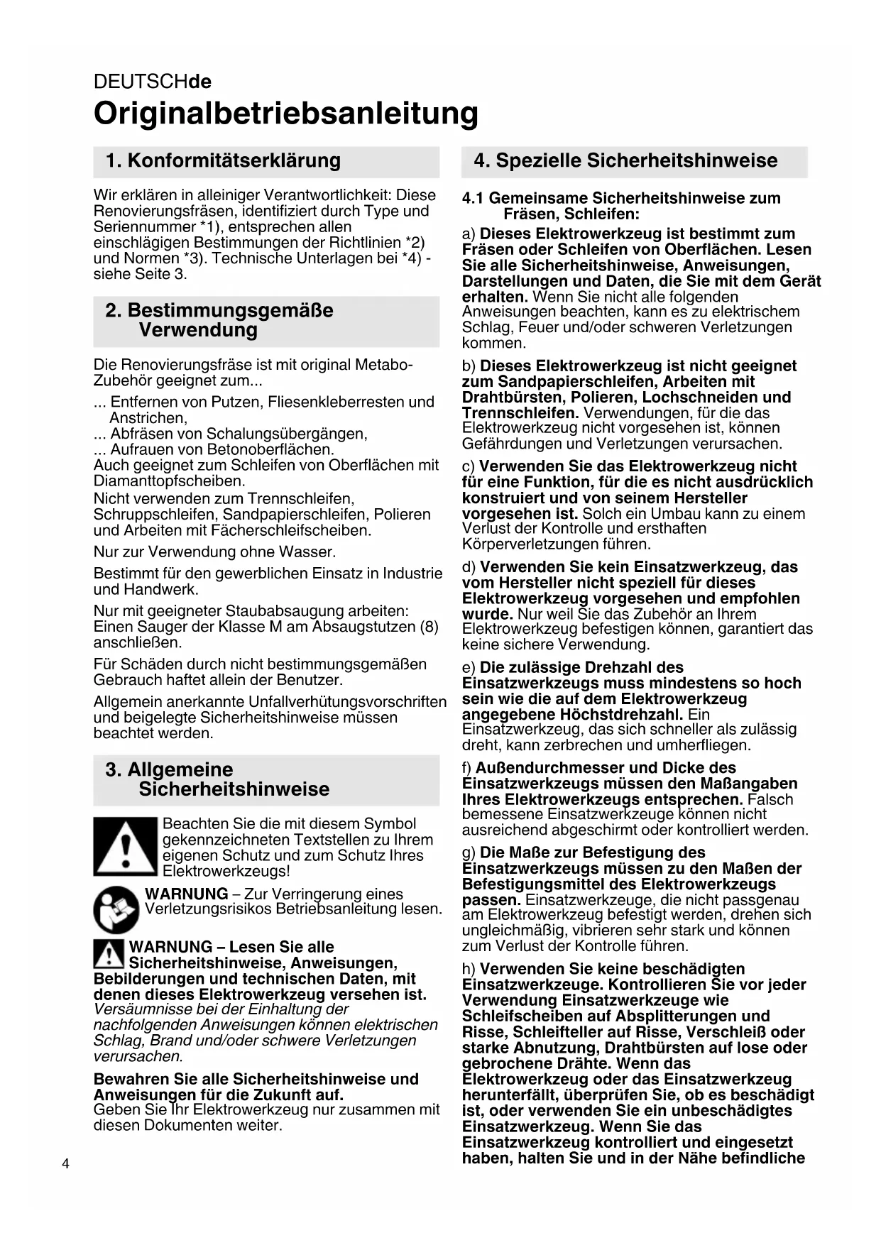 Originalbetriebsanleitung Wir erklären in alleiniger Verantwortlichkeit: Diese Renovierungsfräsen, identifiziert durch Type und Seriennummer *1), entsprechen allen einschlägigen Bestimmungen der Richtlinien *2) und Normen *3). Technische Unterlagen bei *4) - siehe Seite 3. Die Renovierungsfräse ist mit original Metabo- Zubehör geeignet zum... ... Entfernen von Putzen, Fliesenkleberresten und Anstrichen, ... Abfräsen von Schalungsübergängen, ... Aufrauen von Betonoberflächen. Auch geeignet zum Schleifen von Oberflächen mit Diamanttopfscheiben. Nicht verwenden zum Trennschleifen, Schruppschleifen, Sandpapierschleifen, Polieren und Arbeiten mit Fächerschleifscheiben. Nur zur Verwendung ohne Wasser. Bestimmt für den gewerblichen Einsatz in Industrie und Handwerk. Nur mit geeigneter Staubabsaugung arbeiten: Einen Sauger der Klasse M am Absaugstutzen (8) anschließen. Für Schäden durch nicht bestimmungsgemäßen Gebrauch haftet allein der Benutzer. Allgemein anerkannte Unfallverhütungsvorschriften und beigelegte Sicherheitshinweise müssen beachtet werden. Beachten Sie die mit diesem Symbol gekennzeichneten Textstellen zu Ihrem eigenen Schutz und zum Schutz Ihres Elektrowerkzeugs! WARNUNG – Zur Verringerung eines Verletzungsrisikos Betriebsanleitung lesen. WARNUNG – Lesen Sie alle Sicherheitshinweise, Anweisungen, Bebilderungen und technischen Daten, mit denen dieses Elektrowerkzeug versehen ist. Versäumnisse bei der Einhaltung der nachfolgenden Anweisungen können elektrischen Schlag, Brand und/oder schwere Verletzungen verursachen. Bewahren Sie alle Sicherheitshinweise und Anweisungen für die Zukunft auf. Geben Sie Ihr Elektrowerkzeug nur zusammen mit diesen Dokumenten weiter.