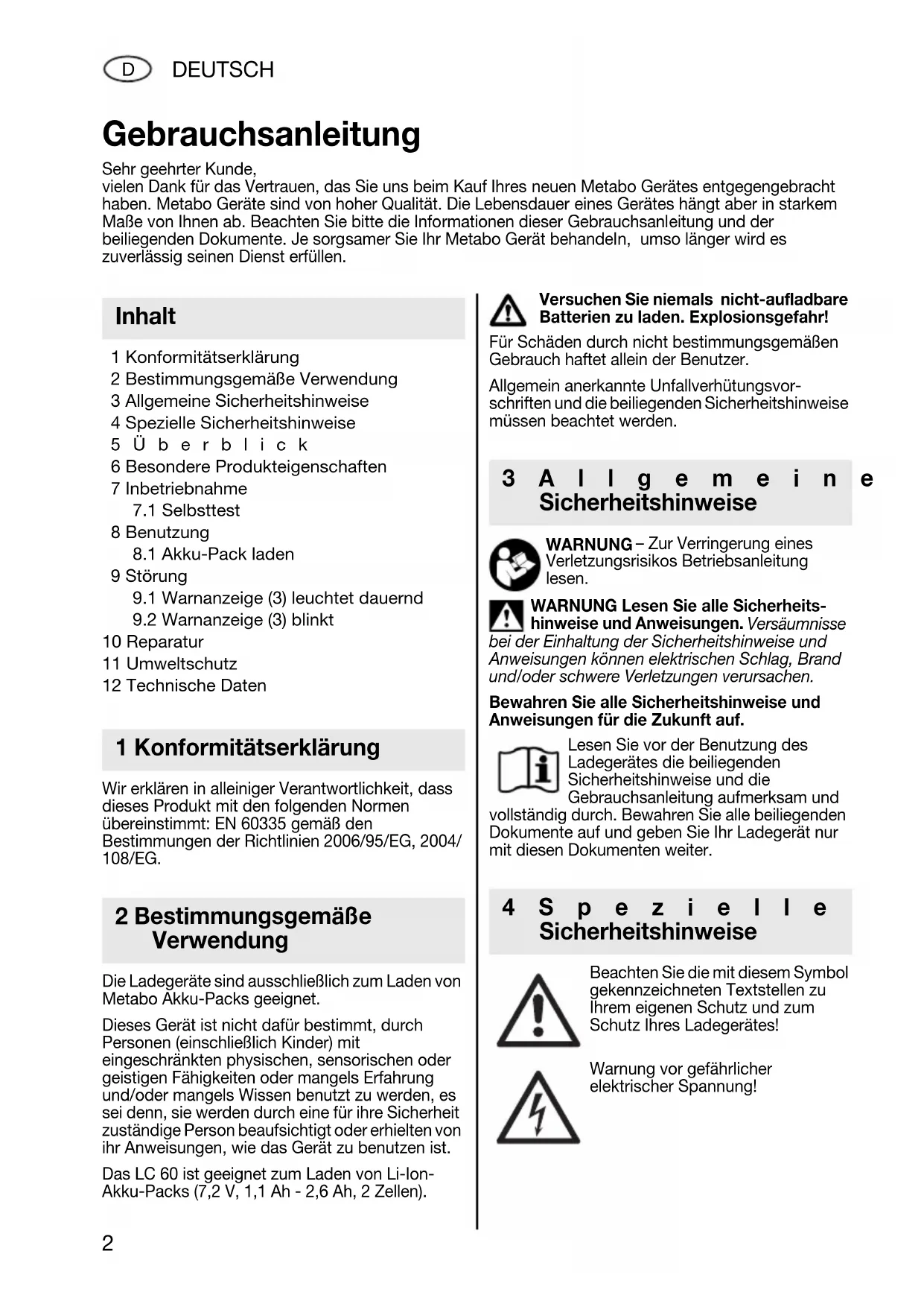 10 Reparatur 11 Umweltschutz 12 Technische Daten Wir erklären in alleiniger Verantwortlichkeit, dass dieses Produkt mit den folgenden Normen übereinstimmt: EN 60335 gemäß den Bestimmungen der Richtlinien 2006/95/EG, 2004/ 108/EG. Die Ladegeräte sind ausschließlich zum Laden von Metabo Akku-Packs geeignet. Dieses Gerät ist nicht dafür bestimmt, durch Personen (einschließlich Kinder) mit eingeschränkten physischen, sensorischen oder geistigen Fähigkeiten oder mangels Erfahrung und/oder mangels Wissen benutzt zu werden, es sei denn, sie werden durch eine für ihre Sicherheit zuständige Person beaufsichtigt oder erhielten von ihr Anweisungen, wie das Gerät zu benutzen ist. Das LC 60 ist geeignet zum Laden von Li-Ion- Akku-Packs (7,2 V, 1,1 Ah - 2,6 Ah, 2 Zellen). Versuchen Sie niemals nicht-aufladbare Batterien zu laden. Explosionsgefahr! Für Schäden durch nicht bestimmungsgemäßen Gebrauch haftet allein der Benutzer. Allgemein anerkannte Unfallverhütungsvor- schriften und die beiliegenden Sicherheitshinweise müssen beachtet werden. WARNUNG – Zur Verringerung eines Verletzungsrisikos Betriebsanleitung lesen. WARNUNG Lesen Sie alle Sicherheits- hinweise und Anweisungen. Versäumnisse bei der Einhaltung der Sicherheitshinweise und Anweisungen können elektrischen Schlag, Brand und/oder schwere Verletzungen verursachen. Bewahren Sie alle Sicherheitshinweise und Anweisungen für die Zukunft auf. Lesen Sie vor der Benutzung des Ladegerätes die beiliegenden Sicherheitshinweise und die Gebrauchsanleitung aufmerksam und vollständig durch. Bewahren Sie alle beiliegenden Dokumente auf und geben Sie Ihr Ladegerät nur mit diesen Dokumenten weiter. Beachten Sie die mit diesem Symbol gekennzeichneten Textstellen zu Ihrem eigenen Schutz und zum Schutz Ihres Ladegerätes! Warnung vor gefährlicher elektrischer Spannung! Gebrauchsanleitung Sehr geehrter Kunde, vielen Dank für das Vertrauen, das Sie uns beim Kauf Ihres neuen Metabo Gerätes entgegengebracht haben. Metabo Geräte sind von hoher Qualität. Die Lebensdauer eines Gerätes hängt aber in starkem Maße von Ihnen ab. Beachten Sie bitte die Informationen dieser Gebrauchsanleitung und der beiliegenden Dokumente. Je sorgsamer Sie Ihr Metabo Gerät behandeln, umso länger wird es zuverlässig seinen Dienst erfüllen. Inhalt 1 Konformitätserklärung 2 Bestimmungsgemäße Verwendung 3Allgemeine Sicherheitshinweise 4Spezielle SicherheitshinweiseDEUTSCH