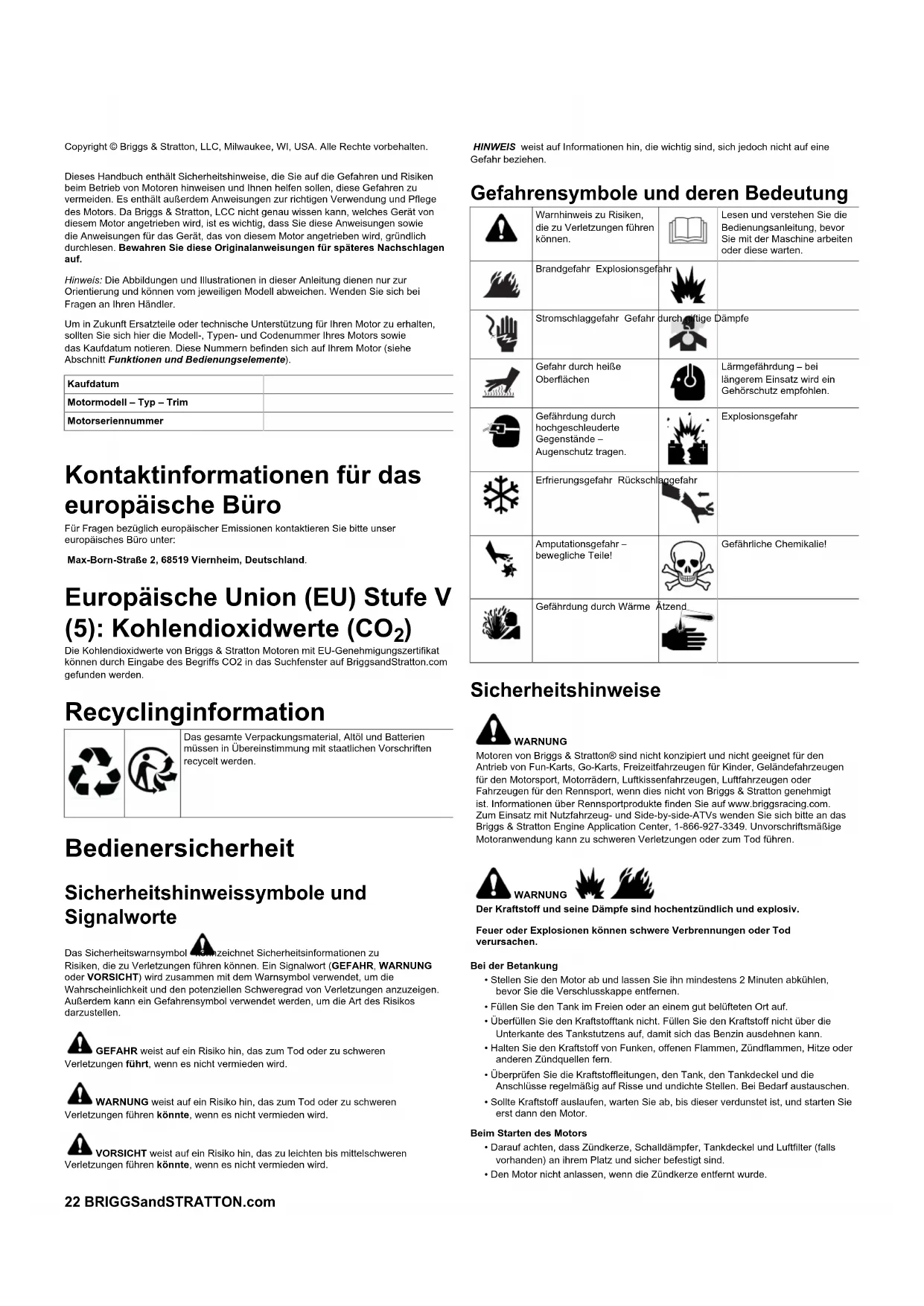 opbevaring på lager eller forkert motorinstallation. Servicegarantien er kun tilgængelig via autoriserede Briggs & Stratton- serviceforhandlere. Find din nærmeste serviceforhandler på vores forhandlerkort på BRIGGSandSTRATTON.COM, eller ved at ringe til 1-800-233-3723 (i USA). 80004537 (Rev. F)22 BRIGGSandSTRATTON.com Copyright © Briggs & Stratton, LLC, Milwaukee, WI, USA. Alle Rechte vorbehalten. Dieses Handbuch enthält Sicherheitshinweise, die Sie auf die Gefahren und Risiken beim Betrieb von Motoren hinweisen und Ihnen helfen sollen, diese Gefahren zu vermeiden. Es enthält außerdem Anweisungen zur richtigen Verwendung und Pflege des Motors. Da Briggs & Stratton, LCC nicht genau wissen kann, welches Gerät von diesem Motor angetrieben wird, ist es wichtig, dass Sie diese Anweisungen sowie die Anweisungen für das Gerät, das von diesem Motor angetrieben wird, gründlich durchlesen. Bewahren Sie diese Originalanweisungen für späteres Nachschlagen auf. Hinweis:Die Abbildungen und Illustrationen in dieser Anleitung dienen nur zur Orientierung und können vom jeweiligen Modell abweichen. Wenden Sie sich bei Fragen an Ihren Händler. Um in Zukunft Ersatzteile oder technische Unterstützung für Ihren Motor zu erhalten, sollten Sie sich hier die Modell-, Typen- und Codenummer Ihres Motors sowie das Kaufdatum notieren. Diese Nummern befinden sich auf Ihrem Motor (siehe AbschnittFunktionen und Bedienungselemente). Kaufdatum Motormodell – Typ – Trim Motorseriennummer Kontaktinformationen für das europäische Büro Für Fragen bezüglich europäischer Emissionen kontaktieren Sie bitte unser europäisches Büro unter: Max-Born-Straße 2, 68519 Viernheim, Deutschland. Europäische Union (EU) Stufe V (5): Kohlendioxidwerte (CO