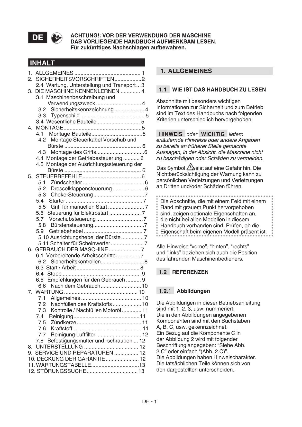 Bitte lesen Sie vor der Inbetriebnahme diese Gebrauchsanweisungen aufmerksam durch. Machen Sie sich mit den Bedienungsteilen und dem richtigen Gebrauch der Maschine vertraut. Lernen Sie, den Motor schnell abzustellen. Die Nichtbeachtung der Sicherheitshinweise und der Anweisungen kann zu Unfällen bzw. schweren Verletzungen führen. Bewahren Sie alle Hinweise und die Anweisungen für zukünftiges Nachschlagen auf.