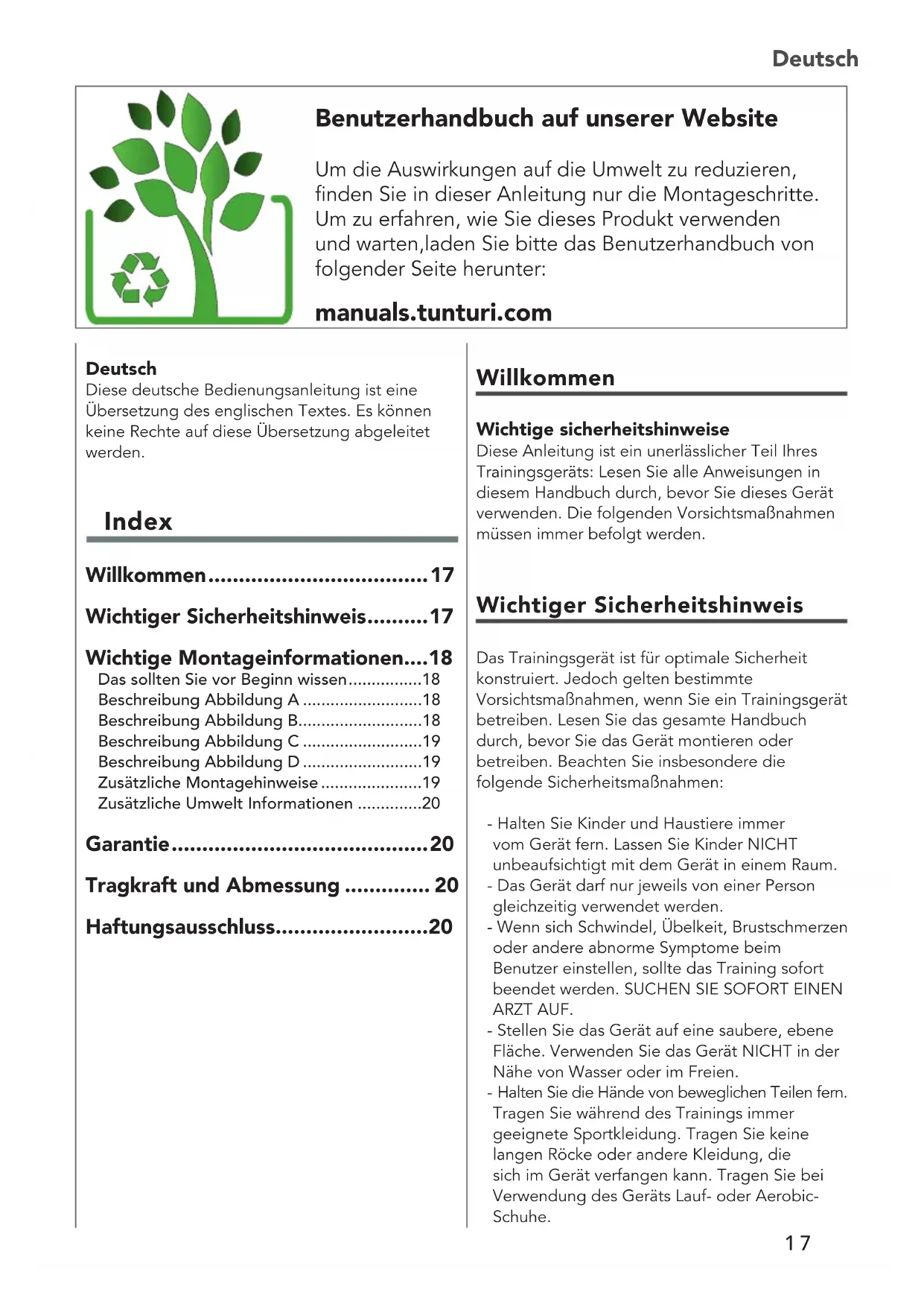 - We recommend checking the hardware regularly, at least once every 3 months. Additional environmental information Packaging disposal Government guidelines ask that we reduce the amount of waste material disposed of in land fill sites. We therefore ask that you dispose of all packaging waste responsibly at public recycling centres. End of life disposal We at Tunturi hope you enjoy many years of enjoyable use from your fitness trainer. However, a Time will come when your fitness trainer will come to the end of its useful life. Under ‘European WEEE Legislation you are responsible for the appropriate disposal of your fitness trainer to a recognised public collection facility. Warranty Tunturi purchaser‘s warranty Warranty terms The consumer is entitled to the applicable legal rights stated in the national legislation concerning the commerce of consumer goods. This warranty does not restrict these rights. The Purchaser’s Warranty is only valid if the item is used in an environment approved by Tunturi New Fitness BV, and is maintained as instructed for that particular equipment. The product-specific approved environment and maintenance instructions are stated in the “user manual” of the product. The “user manual” can be downloaded from our website. http://manuals.tunturi.com16 English Weight capacity and dimension (Fig W#1) - Maximum load weight: 300 kg. Assembled Dimension: 120x 104x 215 cm. 120 cm 104 cm 215 cm Disclaimer © 2025 Tunturi New Fitness BV All rights reserved. - The product and the manual are subject to change. - Specifications can be changed without further notice. - Check our website for the latest user manual version.17 Deutsch Deutsch Diese deutsche Bedienungsanleitung ist eine Übersetzung des englischen Textes. Es können keine Rechte auf diese Übersetzung abgeleitet werden. Index Benutzerhandbuch auf unserer Website Um die Auswirkungen auf die Umwelt zu reduzieren, finden Sie in dieser Anleitung nur die Montageschritte. Um zu erfahren, wie Sie dieses Produkt verwenden und warten,laden Sie bitte das Benutzerhandbuch von folgender Seite herunter: manuals.tunturi.com Willkommen Wichtige sicherheitshinweise Diese Anleitung ist ein unerlässlicher Teil Ihres Trainingsgeräts: Lesen Sie alle Anweisungen in diesem Handbuch durch, bevor Sie dieses Gerät verwenden. Die folgenden Vorsichtsmaßnahmen müssen immer befolgt werden. Wichtiger Sicherheitshinweis Das Trainingsgerät ist für optimale Sicherheit konstruiert. Jedoch gelten bestimmte Vorsichtsmaßnahmen, wenn Sie ein Trainingsgerät betreiben. Lesen Sie das gesamte Handbuch durch, bevor Sie das Gerät montieren oder betreiben. Beachten Sie insbesondere die folgende Sicherheitsmaßnahmen: - Halten Sie Kinder und Haustiere immer vom Gerät fern. Lassen Sie Kinder NICHT unbeaufsichtigt mit dem Gerät in einem Raum. - Das Gerät darf nur jeweils von einer Person gleichzeitig verwendet werden. - Wenn sich Schwindel, Übelkeit, Brustschmerzen oder andere abnorme Symptome beim Benutzer einstellen, sollte das Training sofort beendet werden. SUCHEN SIE SOFORT EINEN ARZT AUF. - Stellen Sie das Gerät auf eine saubere, ebene Fläche. Verwenden Sie das Gerät NICHT in der Nähe von Wasser oder im Freien. - Halten Sie die Hände von beweglichen Teilen fern. Tragen Sie während des Trainings immer geeignete Sportkleidung. Tragen Sie keine langen Röcke oder andere Kleidung, die sich im Gerät verfangen kann. Tragen Sie bei Verwendung des Geräts Lauf- oder Aerobic- Schuhe. Willkommen 17 Wichtiger Sicherheitshinweis 17 Wichtige Montageinformationen 18 Das sollten Sie vor Beginn wissen 18 Beschreibung Abbildung A 18 Beschreibung Abbildung B 18 Beschreibung Abbildung C 19 Beschreibung Abbildung D 19 Zusätzliche Montagehinweise 19 Zusätzliche Umwelt Informationen 20 Garantie 20 Tragkraft und Abmessung 20 Haftungsausschluss 2018 Deutsch - Verwenden Sie das Gerät nur für den beabsichtigten Gebrauch wie in diesem Handbuch beschrieben. Verwenden Sie keine Anbauteile, die NICHT vom Hersteller empfohlen sind. - Stellen Sie keine spitzen Gegenstände rund um das Gerät auf. - Behinderte Personen dürfen das Gerät nicht ohne Beaufsichtigung durch eine qualifizierte Person oder einen Arzt benutzen. - Machen Sie vor Verwendung des Geräts immer Deh-nübungen, um sich aufzuwärmen. - 11. Verwenden Sie das Gerät nicht, wenn es nicht richtig funktioniert. - Für das Training wird ein Helfer empfohlen. - Stecken Sie den Gewichtsauswahlstift nicht hinein, während sich der Gewichtsstapel oder die obere Platte in einer erhöhten Position befinden. - Achten Sie darauf, dass der Auswahlstift vollständig hineingesteckt ist. - Verwenden Sie keine Hanteln oder andere Mittel, um den Gewichtswiderstand zu erhöhen. Verwenden Sie nur vom Hersteller gelieferte Gewichtsplatten. - Das Gerät ist für den privaten Gebrauch und nicht für den gewerblichen Gebrauch gedacht. Warnung: Ziehen sie vor Durchführung eines Übungsprogramms ihren Arzt zu rate. dies gilt insbesondere für Personen über 35 Jahre oder für Personen mit bestehenden gesundheitlichen Problemen. lesen sie vor Verwendung von Fitnessgeräten die gesamte Anleitung durch. Tunturi New Fitness bv übernimmt keine Verantwortung für Verletzungen oder Sachschäden, die durch dieses Produkt oder durch Verwendung dieses Produkts entstehen. Bewahren sie diese Anleitung auf! Wichtige Montageinformationen Das sollten Sie vor Beginn wissen Wir empfehlen die Verwendung von zwei verstellbaren Schraubenschlüsseln für die Montage Ihres Produkts. Wenn Sie metrische Schraubenschlüssel in der richtigen Größe haben, ist das auch in Ordnung. ‼ HINWEIS