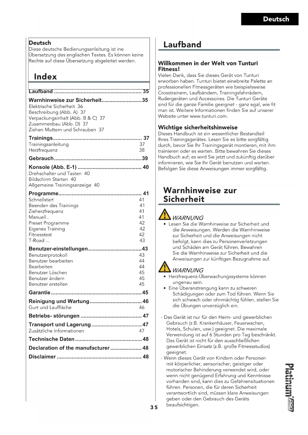BEDIENUNGSANLEITUNG Platinum PRO Treadmill 3.0 TUNTURI