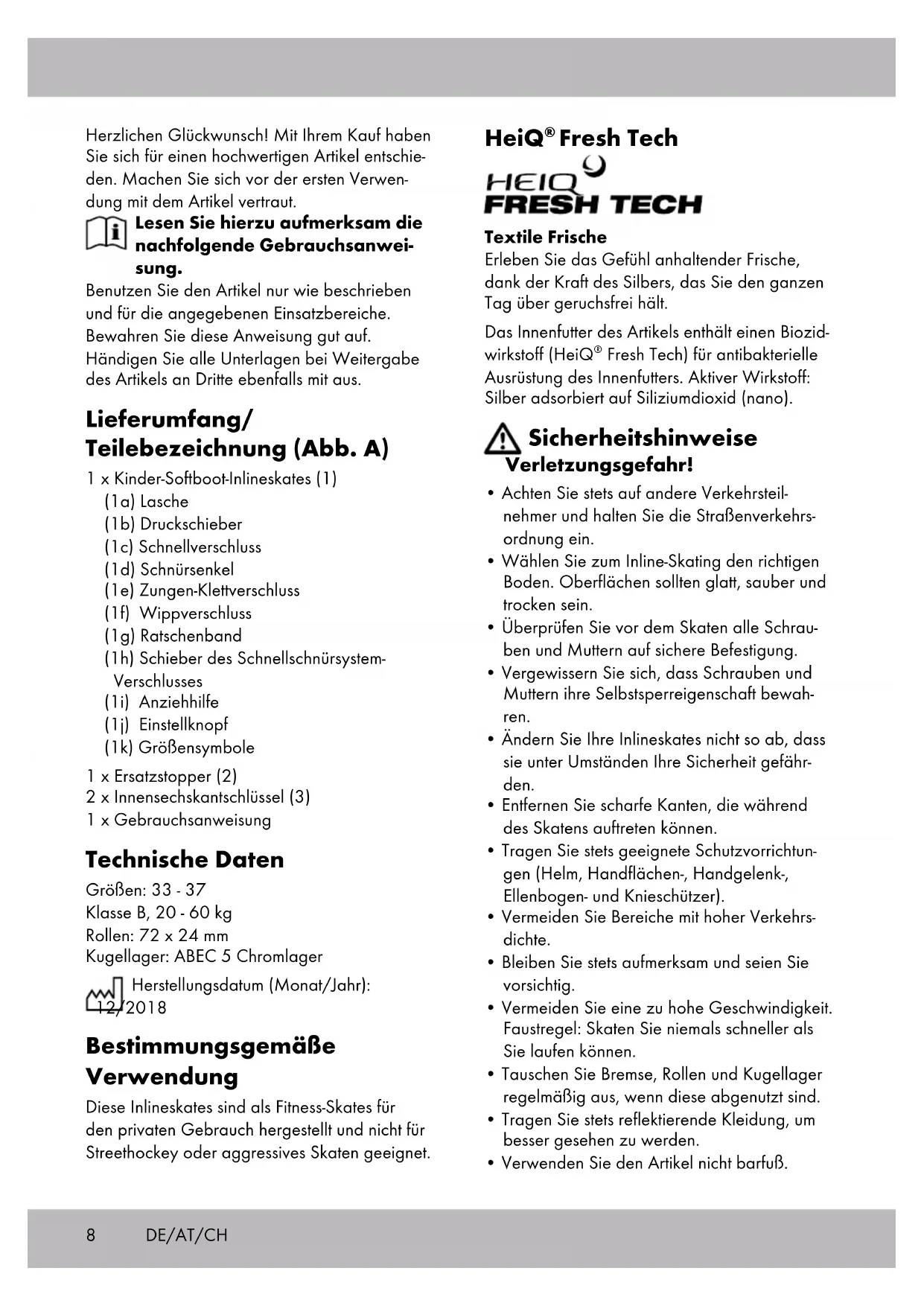 - Verwenden Sie den Artikel nicht barfuß. Herzlichen Glückwunsch! Mit Ihrem Kauf haben Sie sich für einen hochwertigen Artikel entschie- den. Machen Sie sich vor der ersten Verwen- dung mit dem Artikel vertraut. Lesen Sie hierzu aufmerksam die nachfolgende Gebrauchsanwei- sung. Benutzen Sie den Artikel nur wie beschrieben und für die angegebenen Einsatzbereiche. Bewahren Sie diese Anweisung gut auf. Händigen Sie alle Unterlagen bei Weitergabe des Artikels an Dritte ebenfalls mit aus. Lieferumfang/ Teilebezeichnung (Abb. A) 1 x Kinder-Softboot-Inlineskates (1) (1a) Lasche (1b) Druckschieber (1c) Schnellverschluss (1d) Schnürsenkel (1e) Zungen-Klettverschluss (1f) Wippverschluss (1g) Ratschenband (1h) Schieber des Schnellschnürsystem- Verschlusses (1i) Anziehhilfe (1j) Einstellknopf (1k) Größensymbole 1 x Ersatzstopper (2) 2 x Innensechskantschlüssel (3) 1 x Gebrauchsanweisung Technische Daten Größen: 33 - 37 Klasse B, 20 - 60 kg Rollen: 72 x 24 mm Kugellager: ABEC 5 Chromlager Herstellungsdatum (Monat/Jahr): 12/2018 Bestimmungsgemäße Verwendung Diese Inlineskates sind als Fitness-Skates für den privaten Gebrauch hergestellt und nicht für Streethockey oder aggressives Skaten geeignet. DE/AT/CH9 Bremstechniken Hinweis: Üben Sie die unterschiedlichen Brems- techniken auf einer ebenen Oberfläche ohne Verkehr und ohne Fußgänger. Vermeiden Sie Gefälle, bis Sie die Bremstechniken beherrschen. Fersenbremse (Abb. C): Wenn Ihre Inlineskates mit Bremsen ausgestattet sind, denken Sie daran, diese zu benutzen. Heben Sie die Spitze des Skates, an dem die Bremse montiert ist, leicht an und drücken Sie die Bremse auf den Boden. Verlagern Sie Ihr Gewicht leicht nach vorn und beugen Sie die Knie. Die Bremswirkung kann verstärkt werden, wenn Sie die Knie stärker beugen und Ihr Gewicht weiter nach vorn verlagern, während Sie gleichzeitig den Druck auf Ihren bremsenden Skate verstärken. T-Bremse (Abb. D): Falls Ihre Inlineskates nicht mit einer Bremse ausgestattet sind oder Sie die Bremse abmon- tiert haben, empfehlen wir Ihnen den Einsatz der „T-Stop-Technik“– diese ist jedoch nur für fortgeschrittene Skater geeignet! Beim Einsatz der „T-Stop-Technik“ verlagern Sie Ihr gesamtes Gewicht auf einen Fuß. Bewegen Sie jetzt den anderen Fuß hinter den ersten und setzen Sie ihn im rechten Winkel dahinter. Verlagern Sie anschließend Ihr Gewicht von vorn auf die Innenseite der Rollen Ihres hinteren Skates und bremsen Sie mit zunehmendem Druck. Einstellen der Größe (Abb. E) Drücken Sie den Einstellknopf (1j) hinunter und verschieben Sie den Schuh bei gedrücktem Einstellknopf auf die gewünschte Größe. Der Schuh muss durch einen hörbaren „KLICK“ einrasten. Der Pfeil am Schuh zeigt dabei auf die passende Größe (1k) auf dem Rahmen. Einstellen der Weite (Abb. F) Lösen Sie die Schraube an der Unterseite des Ar- tikels mit dem beiliegenden langen Innensechs- kantschlüssel (3) durch Drehen in Pfeilrichtung. Passen Sie die Weite durch Verschieben des Vermeidung von Sachschäden!
