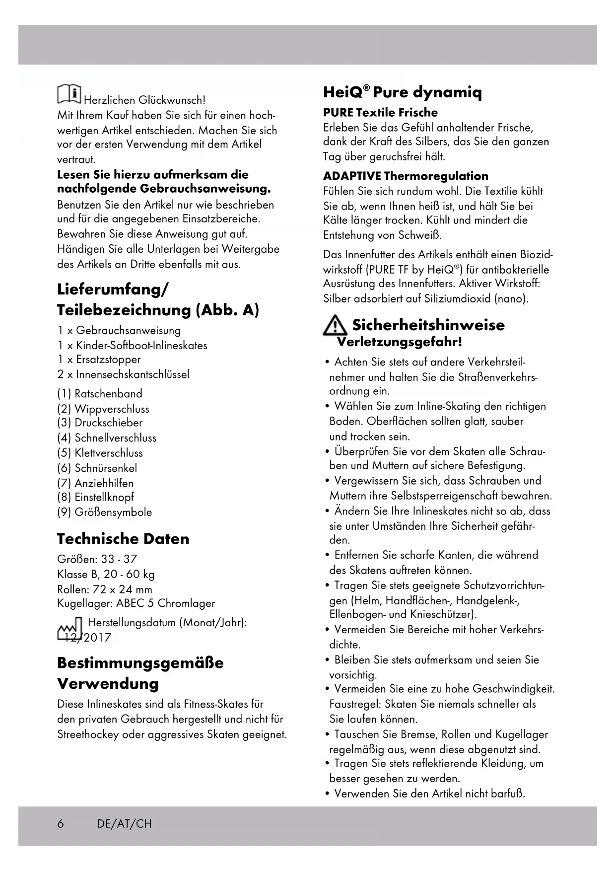 - Verwenden Sie den Artikel nicht barfuß. Herzlichen Glückwunsch! Mit Ihrem Kauf haben Sie sich für einen hoch- wertigen Artikel entschieden. Machen Sie sich vor der ersten Verwendung mit dem Artikel vertraut. Lesen Sie hierzu aufmerksam die nachfolgende Gebrauchsanweisung. Benutzen Sie den Artikel nur wie beschrieben und für die angegebenen Einsatzbereiche. Bewahren Sie diese Anweisung gut auf. Händigen Sie alle Unterlagen bei Weitergabe des Artikels an Dritte ebenfalls mit aus. Lieferumfang/ Teilebezeichnung (Abb. A) 1 x Gebrauchsanweisung 1 x Kinder-Softboot-Inlineskates 1 x Ersatzstopper 2 x Innensechskantschlüssel (1) Ratschenband (2) Wippverschluss (3) Druckschieber (4) Schnellverschluss (5) Klettverschluss (6) Schnürsenkel (7) Anziehhilfen (8) Einstellknopf (9) Größensymbole Technische Daten Größen: 33 - 37 Klasse B, 20 - 60 kg Rollen: 72 x 24 mm Kugellager: ABEC 5 Chromlager Herstellungsdatum (Monat/Jahr): 12/2017 Bestimmungsgemäße Verwendung Diese Inlineskates sind als Fitness-Skates für den privaten Gebrauch hergestellt und nicht für Streethockey oder aggressives Skaten geeignet. DE/AT/CH7 Bremstechniken Hinweis: Üben Sie die unterschiedlichen Brems- techniken auf einer ebenen Oberfläche ohne Verkehr und ohne Fußgänger. Ver- meiden Sie Gefälle, bis Sie die Brems- techniken beherrschen. Fersenbremse (Abb. C): Wenn Ihre Inlineskates mit Bremsen ausgestattet sind, denken Sie daran, diese zu benutzen. Heben Sie die Spitze des Skates, an dem die Bremse montiert ist, leicht an und drücken Sie die Bremse auf den Boden. Verlagern Sie Ihr Gewicht leicht nach vorn und beugen Sie die Knie. Die Bremswirkung kann verstärkt wer- den, wenn Sie die Knie stärker beugen und Ihr Gewicht weiter nach vorn verlegen, während Sie gleichzeitig den Druck auf Ihren bremsenden Skate verstärken. T-Bremse (Abb. D): Falls Ihre Inlineskates nicht mit einer Bremse ausgestattet sind oder Sie die Bremse abmontiert haben, empfehlen wir Ihnen den Einsatz der „T-Stop-Technik“– diese ist jedoch nur für fort- geschrittene Skater geeignet! Beim Einsatz der „T-Stop-Technik“ verlagern Sie Ihr gesamtes Gewicht auf einen Fuß. Bewegen Sie jetzt den anderen Fuß hinter den ersten und setzen Sie ihn im rechten Winkel dahinter. Verlagern Sie anschließend Ihr Gewicht von vorn auf die Innenseite der Rollen Ihres hinteren Skates und bremsen Sie mit zunehmendem Druck. Einstellen der Größe (Abb. E) Drücken Sie den Einstellknopf (8) hinunter und verschieben Sie den Schuh bei gedrücktem Einstellknopf auf die gewünschte Größe. Der Schuh muss durch einen hörbaren „KLICK“ einrasten. Der Pfeil am Schuh zeigt dabei auf die passende Größe (9) auf dem Rahmen. Vermeidung von Sachschäden!