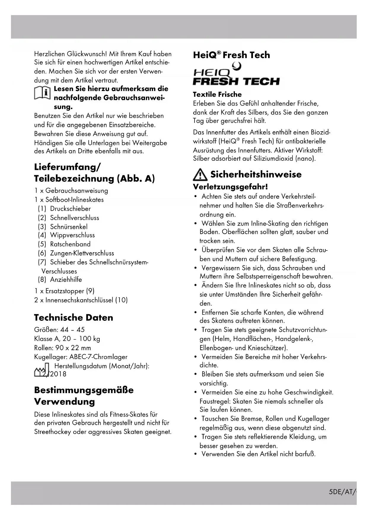 - Notes on the guarantee and service handling DE/AT/CH Herzlichen Glückwunsch! Mit Ihrem Kauf haben Sie sich für einen hochwertigen Artikel entschie- den. Machen Sie sich vor der ersten Verwen- dung mit dem Artikel vertraut. Lesen Sie hierzu aufmerksam die nachfolgende Gebrauchsanwei- sung. Benutzen Sie den Artikel nur wie beschrieben und für die angegebenen Einsatzbereiche. Bewahren Sie diese Anweisung gut auf. Händigen Sie alle Unterlagen bei Weitergabe des Artikels an Dritte ebenfalls mit aus. Lieferumfang/ Teilebezeichnung (Abb. A) 1 x Gebrauchsanweisung 1 x Softboot-Inlineskates (1) Druckschieber (2) Schnellverschluss (3) Schnürsenkel (4) Wippverschluss (5) Ratschenband (6) Zungen-Klettverschluss (7) Schieber des Schnellschnürsystem- Verschlusses (8) Anziehhilfe 1 x Ersatzstopper (9) 2 x Innensechskantschlüssel (10) Technische Daten Größen: 44 – 45 Klasse A, 20 – 100 kg Rollen: 90 x 22 mm Kugellager: ABEC-7-Chromlager Herstellungsdatum (Monat/Jahr): 12/2018 Bestimmungsgemäße Verwendung Diese Inlineskates sind als Fitness-Skates für den privaten Gebrauch hergestellt und nicht für Streethockey oder aggressives Skaten geeignet. HeiQ p. 255
