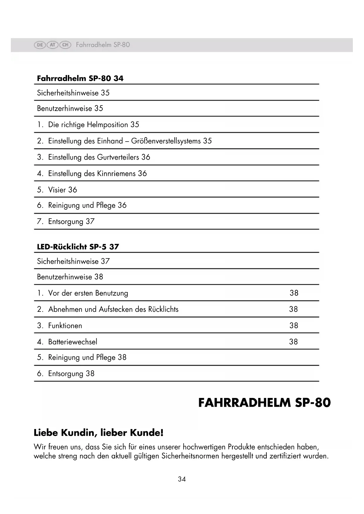 Doe lege batterijen niet bij het huisvuil. Laat ze achter in de hiervoor bedoelde verzamelcon- tainers. LED-Achterlicht SP-534 FAHRRADHELM SP-80 Liebe Kundin, lieber Kunde! Wir freuen uns, dass Sie sich für eines unserer hochwertigen Produkte entschieden haben, welche streng nach den aktuell gültigen Sicherheitsnormen hergestellt und zertiziert wurden. Fahrradhelm SP-80 Fahrradhelm SP-80 34 Sicherheitshinweise 35 Benutzerhinweise 35