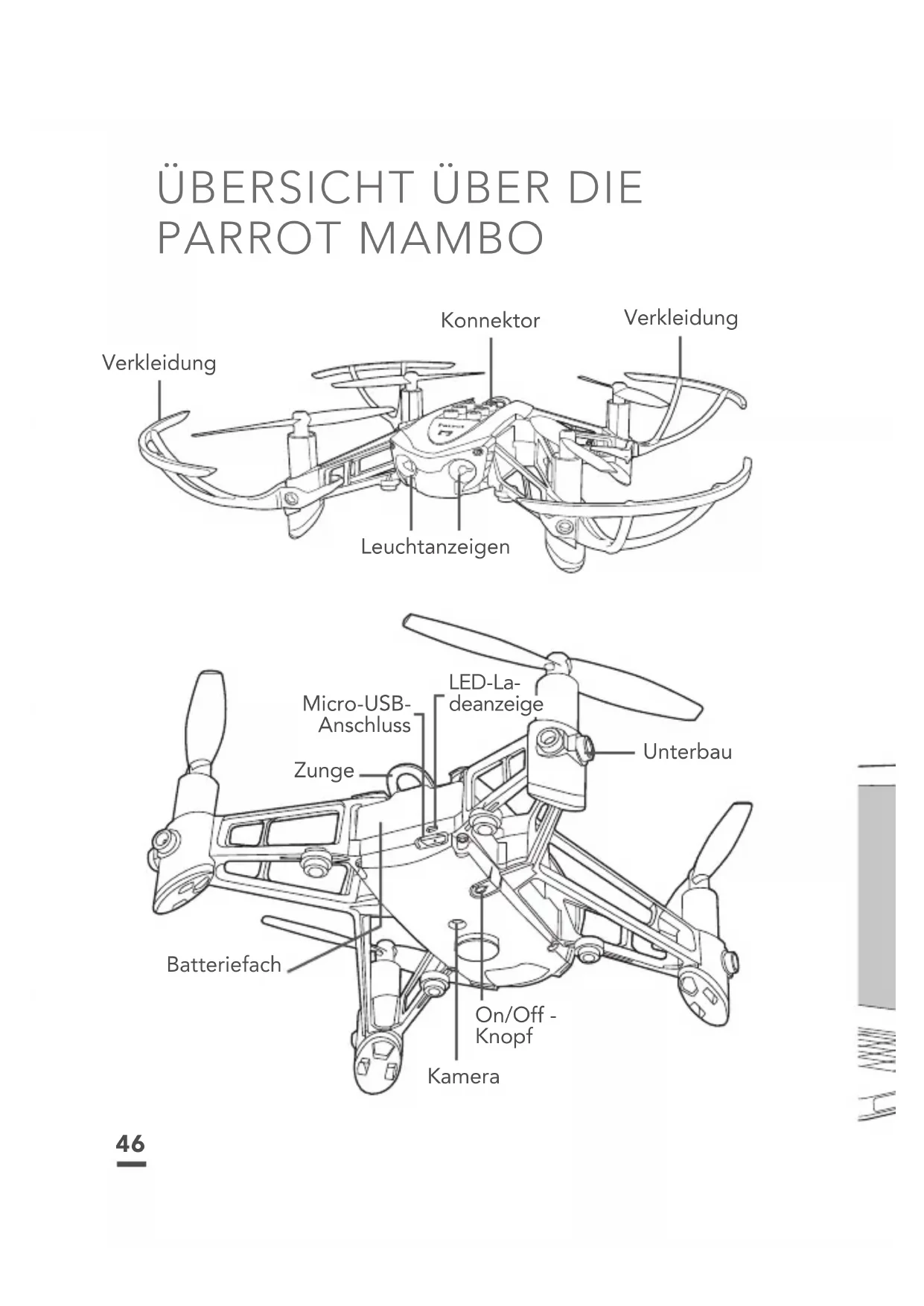 PARROT MAMBO Verkleidung Verkleidung Leuchtanzeigen Konnektor Batteriefach Kamera On/Off - Knopf Micro-USB- Anschluss Zunge Unterbau LED-La- deanzeige47 DEUTSCH