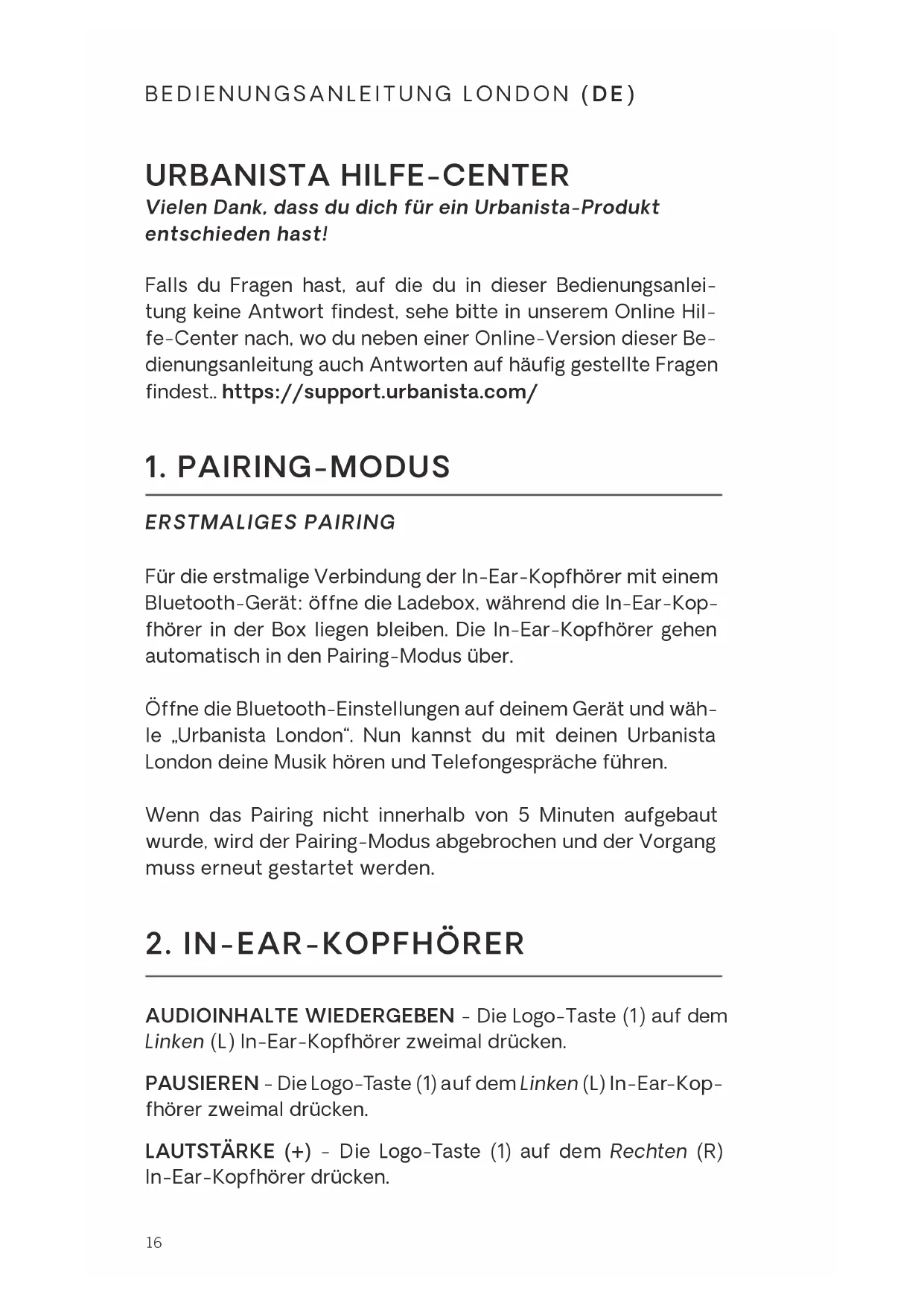 AUDIOINHALTE WIEDERGEBEN - Die Logo-Taste (1) auf dem Linken (L) In-Ear-Kopfhörer zweimal drücken. PAUSIEREN - Die Logo-Taste (1) auf dem Linken (L) In-Ear-Kop- fhörer zweimal drücken. LAUTSTÄRKE (+) - Die Logo-Taste (1) auf dem Rechten (R) In-Ear-Kopfhörer drücken. BEDIENUNGSANLEITUNG LONDON (DE) URBANISTA HILFE-CENTER Vielen Dank, dass du dich für ein Urbanista-Produkt entschieden hast! Falls du Fragen hast, auf die du in dieser Bedienungsanlei- tung keine Antwort findest, sehe bitte in unserem Online Hil- fe-Center nach, wo du neben einer Online-Version dieser Be- dienungsanleitung auch Antworten auf häufig gestellte Fragen findest.. https://support.urbanista.com/17 LAUTSTÄRKE (-) - Die Logo-Taste (2) auf dem Linken (L) In-Ear-Kopfhörer drücken. EINGEHENDEN ANRUF ANNEHMEN - Die Logo-Taste (1) auf dem Linken (L) oder Rechten (R) In-Ear-Kopfhörer zweimal drücken. ANRUF BEENDEN - Die Logo-Taste (1) auf dem Linken (L) oder Rechten (R) In-Ear-Kopfhörer zweimal drücken. ANRUF ABLEHNEN - Die Logo-Taste auf dem Linken (L) oder Rechten (R) In-Ear-Kopfhörer drücken und gedrückt halten. SIRI - Die Logo-Taste (1) auf dem Rechten (R) In-Ear-Kopfhörer zweimal drücken. AKTIVE GERÄUSCHUNTERDRÜCKUNG EIN/AUS - Die Logo- Taste (1) auf dem Rechten (R) In-Ear-Kopfhörer drücken und 2 Sekunden gedrückt halten. UMGEBUNGSGERÄUSCH-MODUS EIN/AUS - Die Logo- Taste (1) auf dem Linken (L) In-Ear-Kopfhörer drücken und 2 Sekunden lang gedrückt halten. OHRERKENNUNG – Eingebaute Sensoren erkennen, wenn ein In-Ear-Kopfhörer aus deinem Ohr herausgenommen wurde und das Abspielen der Musik wird automatisch gestoppt. Die automatische Wiedergabe schaltet sich ein, sobald du den In-Ear-Kopfhörer wieder in dein Ohr steckst und die Musik beginnt wieder zu spielen. Sobald der In-Ear-Kopfhörer aus deinem Ohr herausgenommen wurde, wird die Touch-Tas- ten-Funktion deaktiviert. Telefongespräche werden, auch wenn ein In-Ear-Kopfhörer aus dem Ohr herausgenommen wurde, nicht beendet. ANZEIGE AKKUSTATUS – Nach dem Schließen des Deckels der Ladebox zeigen die Akkustandsleuchten (3) den verblei- benden Ladestand des Akkus an. WARNUNG NIEDRIGER AKKUSTAND - Bei niedrigem Lade- stand deines Akkus ertönt eine Sprachansage „low battery“ und es verbleiben 30 Minuten Spielzeit, bis die In-Ear-Kopf- hörer automatisch abschalten.18 BEDIENUNGSANLEITUNG LONDON (DE)