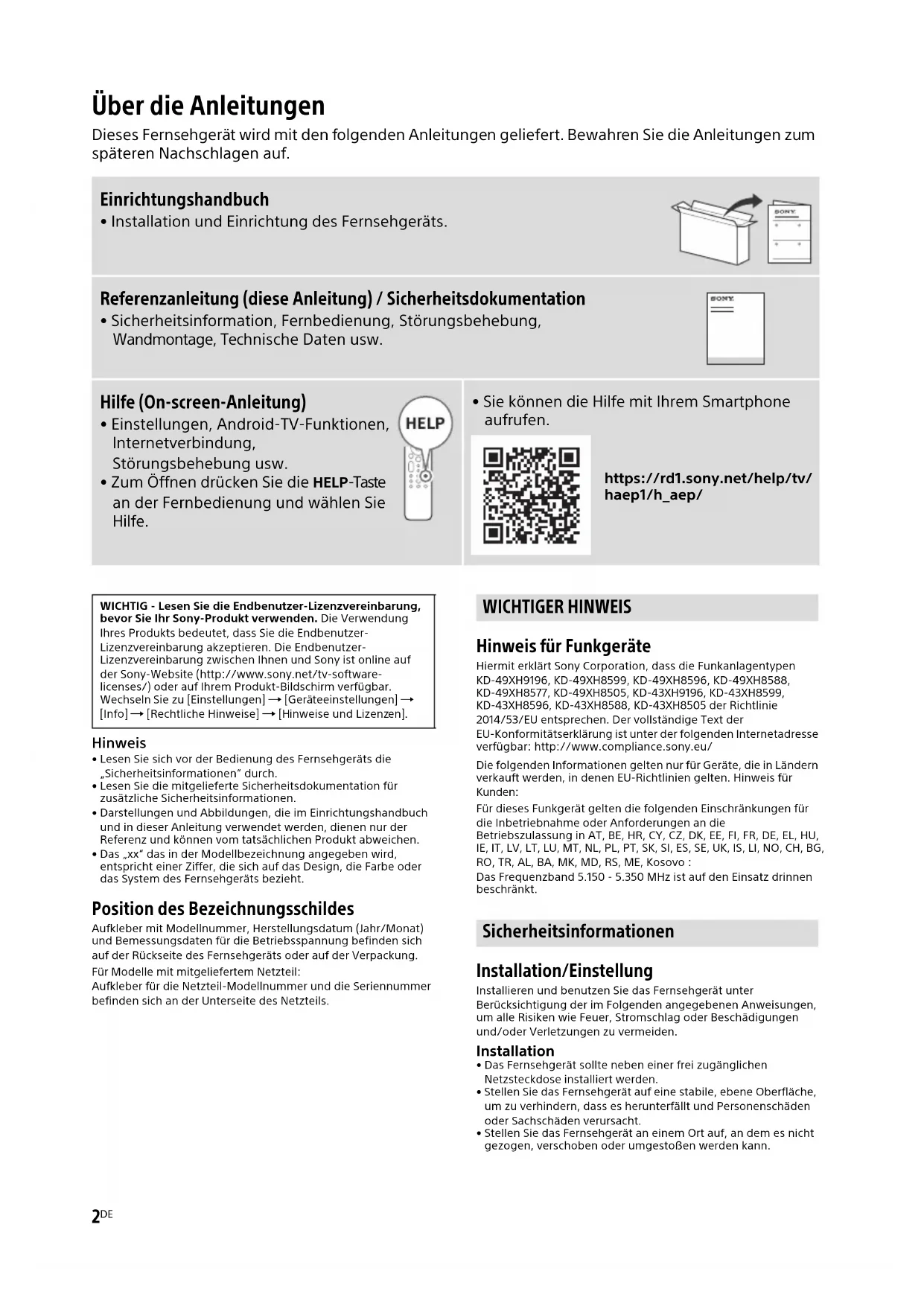 - Das „xx“ das in der Modellbezeichnung angegeben wird, entspricht einer Ziffer, die sich auf das Design, die Farbe oder das System des Fernsehgeräts bezieht. Position des Bezeichnungsschildes Aufkleber mit Modellnummer, Herstellungsdatum (Jahr/Monat) und Bemessungsdaten für die Betriebsspannung befinden sich auf der Rückseite des Fernsehgeräts oder auf der Verpackung. Für Modelle mit mitgeliefertem Netzteil: Aufkleber für die Netzteil-Modellnummer und die Seriennummer befinden sich an der Unterseite des Netzteils. Hinweis für Funkgeräte Hiermit erklärt Sony Corporation, dass die Funkanlagentypen KD-49XH9196, KD-49XH8599, KD-49XH8596, KD-49XH8588, KD-49XH8577, KD-49XH8505, KD-43XH9196, KD-43XH8599, KD-43XH8596, KD-43XH8588, KD-43XH8505 der Richtlinie 2014/53/EU entsprechen. Der vollständige Text der EU-Konformitätserklärung ist unter der folgenden Internetadresse verfügbar: http://www.compliance.sony.eu/ Die folgenden Informationen gelten nur für Geräte, die in Ländern verkauft werden, in denen EU-Richtlinien gelten. Hinweis für Kunden: Für dieses Funkgerät gelten die folgenden Einschränkungen für die Inbetriebnahme oder Anforderungen an die Betriebszulassung in AT, BE, HR, CY, CZ, DK, EE, FI, FR, DE, EL, HU, IE, IT, LV, LT, LU, MT, NL, PL, PT, SK, SI, ES, SE, UK, IS, LI, NO, CH, BG, RO, TR, AL, BA, MK, MD, RS, ME, Kosovo : Das Frequenzband 5.150 - 5.350 MHz ist auf den Einsatz drinnen beschränkt. Installation/Einstellung Installieren und benutzen Sie das Fernsehgerät unter Berücksichtigung der im Folgenden angegebenen Anweisungen, um alle Risiken wie Feuer, Stromschlag oder Beschädigungen und/oder Verletzungen zu vermeiden. Installation