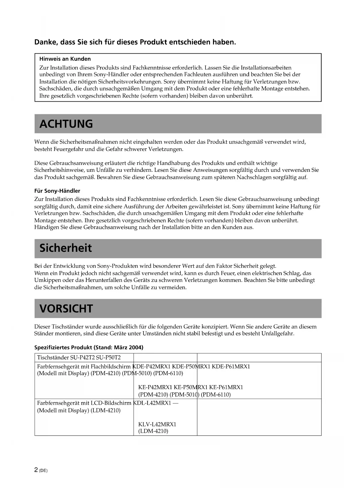 SU-P42T2 SU-P50T2 Afmetingen: (mm) A 500 600 B 295 321 C 392 D 340 E 310 F 461 G 141 H 602 Gewicht: (kg) 16,0 19,0 B2 (DE) Danke, dass Sie sich für dieses Produkt entschieden haben. Hinweis an Kunden Zur Installation dieses Produkts sind Fachkenntnisse erforderlich. Lassen Sie die Installationsarbeiten unbedingt von Ihrem Sony-Händler oder entsprechenden Fachleuten ausführen und beachten Sie bei der Installation die nötigen Sicherheitsvorkehrungen. Sony übernimmt keine Haftung für Verletzungen bzw. Sachschäden, die durch unsachgemäßen Umgang mit dem Produkt oder eine fehlerhafte Montage entstehen. Ihre gesetzlich vorgeschriebenen Rechte (sofern vorhanden) bleiben davon unberührt. ACHTUNG Wenn die Sicherheitsmaßnahmen nicht eingehalten werden oder das Produkt unsachgemäß verwendet wird, besteht Feuergefahr und die Gefahr schwerer Verletzungen. Diese Gebrauchsanweisung erläutert die richtige Handhabung des Produkts und enthält wichtige Sicherheitshinweise, um Unfälle zu verhindern. Lesen Sie diese Anweisungen sorgfältig durch und verwenden Sie das Produkt sachgemäß. Bewahren Sie diese Gebrauchsanweisung zum späteren Nachschlagen sorgfältig auf. Für Sony-Händler Zur Installation dieses Produkts sind Fachkenntnisse erforderlich. Lesen Sie diese Gebrauchsanweisung unbedingt sorgfältig durch, damit eine sichere Ausführung der Arbeiten gewährleistet ist. Sony übernimmt keine Haftung für Verletzungen bzw. Sachschäden, die durch unsachgemäßen Umgang mit dem Produkt oder eine fehlerhafte Montage entstehen. Ihre gesetzlich vorgeschriebenen Rechte (sofern vorhanden) bleiben davon unberührt. Händigen Sie diese Gebrauchsanweisung nach der Installation bitte an den Kunden aus. Sicherheit Bei der Entwicklung von Sony-Produkten wird besonderer Wert auf den Faktor Sicherheit gelegt. Wenn ein Produkt jedoch nicht sachgemäß verwendet wird, kann es durch Feuer, einen elektrischen Schlag, das Umkippen oder das Herunterfallen des Geräts zu schweren Verletzungen kommen. Beachten Sie bitte unbedingt die Sicherheitsmaßnahmen, um solche Unfälle zu vermeiden. VORSICHT Dieser Tischständer wurde ausschließlich für die folgenden Geräte konzipiert. Wenn Sie andere Geräte an diesem Ständer montieren, sind diese Geräte unter Umständen nicht stabil befestigt und es besteht Unfallgefahr. Spezifiziertes Produkt (Stand: März 2004) Tischständer SU-P42T2 SU-P50T2 Farbfernsehgerät mit Flachbildschirm KDE-P42MRX1 KDE-P50MRX1 KDE-P61MRX1 (Modell mit Display) (PDM-4210) (PDM-5010) (PDM-6110)