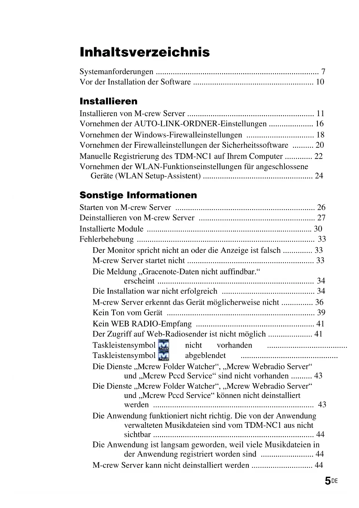 s Betriebssystem: Windows Vista Ultimate, Windows Vista Business, Windows Vista Home Premium, Windows Vista Home Basic, Windows XP Home Edition (SP2 oder höher), Windows XP Professional (SP2 oder höher), Windows XP Media Center Edition 2004 (SP2 oder höher), Windows XP Media Center Edition 2005 (SP2 oder höher) M-crew Server läuft nicht in Umgebungen mit Microsoft Windows 3.1, Windows 95, Windows 98, Windows Me, Windows NT, Windows 2000 Professional, Windows XP (ohne SP2), Windows Vista Starter oder Windows Vista Enterprise. Zur Installation müssen Sie sich als Administrator anmelden. s Microsoft .NET Framework-Modul Version 2.0 oder höher s Internet-Zugang (für Gracenote-Zugriff und WEB RADIO) s Display: XGA (1.024 × 768 Pixel) Muss in der Lage sein, mindestens 65.536 Farben anzuzeigen. s Verwendete Sprache: Englisch/Deutsch/ Französisch s Benutzerprivilegien – M-crew Server kann nur von Benutzern mit Administratorprivilegien benutzt werden. – M-crew Server unterstützt nicht die Benutzerwechselfunktion.9