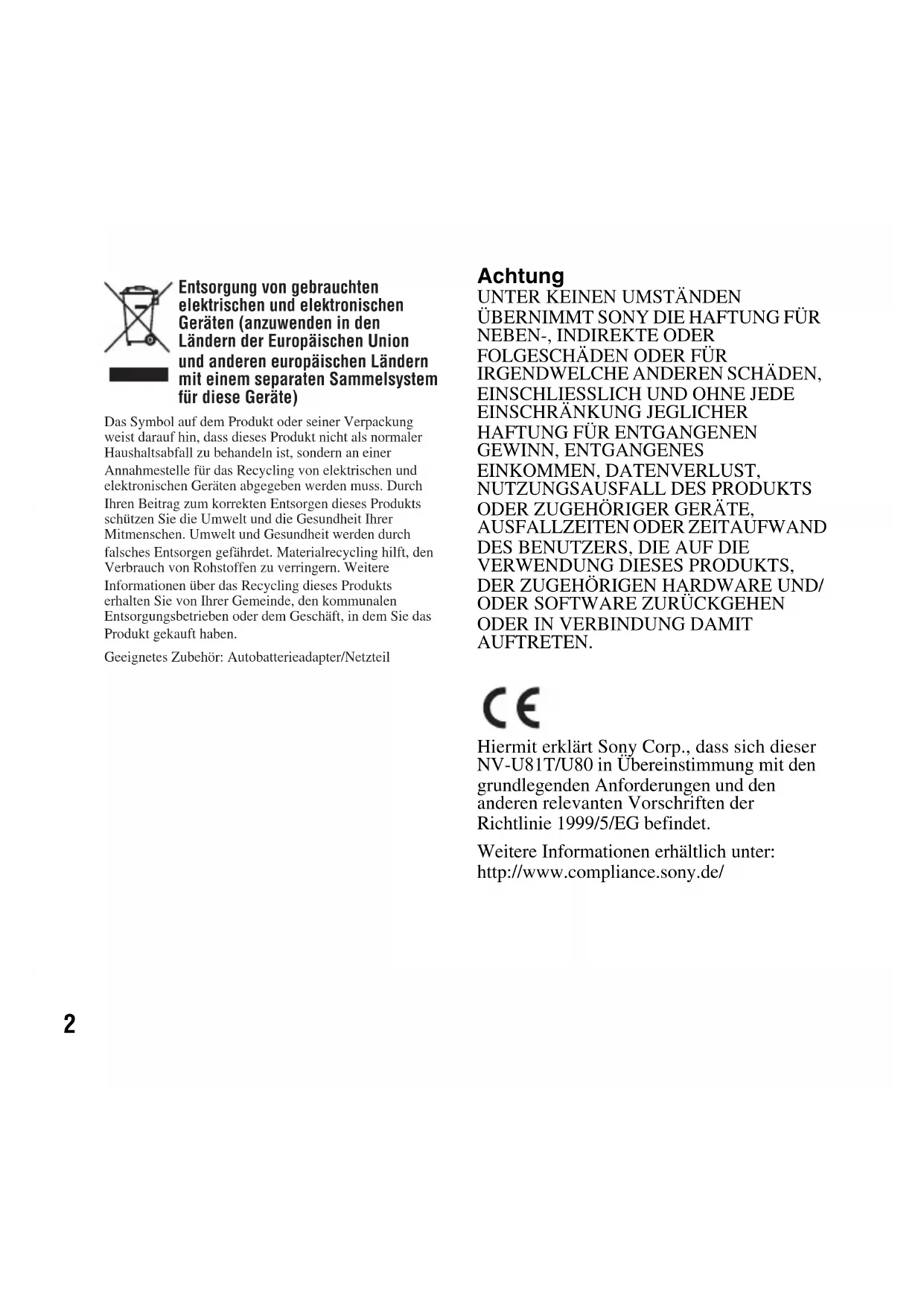 AUFTRETEN. Hiermit erklärt Sony Corp., dass sich dieser NV-U81T/U80 in Übereinstimmung mit den grundlegenden Anforderungen und den anderen relevanten Vorschriften der Richtlinie 1999/5/EG befindet. Weitere Informationen erhältlich unter: http://www.compliance.sony.de/ Entsorgung von gebrauchten elektrischen und elektronischen Geräten (anzuwenden in den Ländern der Europäischen Union und anderen europäischen Ländern mit einem separaten Sammelsystem für diese Geräte) Das Symbol auf dem Produkt oder seiner Verpackung weist darauf hin, dass dieses Produkt nicht als normaler Haushaltsabfall zu behandeln ist, sondern an einer Annahmestelle für das Recycling von elektrischen und elektronischen Geräten abgegeben werden muss. Durch Ihren Beitrag zum korrekten Entsorgen dieses Produkts schützen Sie die Umwelt und die Gesundheit Ihrer Mitmenschen. Umwelt und Gesundheit werden durch falsches Entsorgen gefährdet. Materialrecycling hilft, den Verbrauch von Rohstoffen zu verringern. Weitere Informationen über das Recycling dieses Produkts erhalten Sie von Ihrer Gemeinde, den kommunalen Entsorgungsbetrieben oder dem Geschäft, in dem Sie das Produkt gekauft haben. Geeignetes Zubehör: Autobatterieadapter/NetzteilInhalt