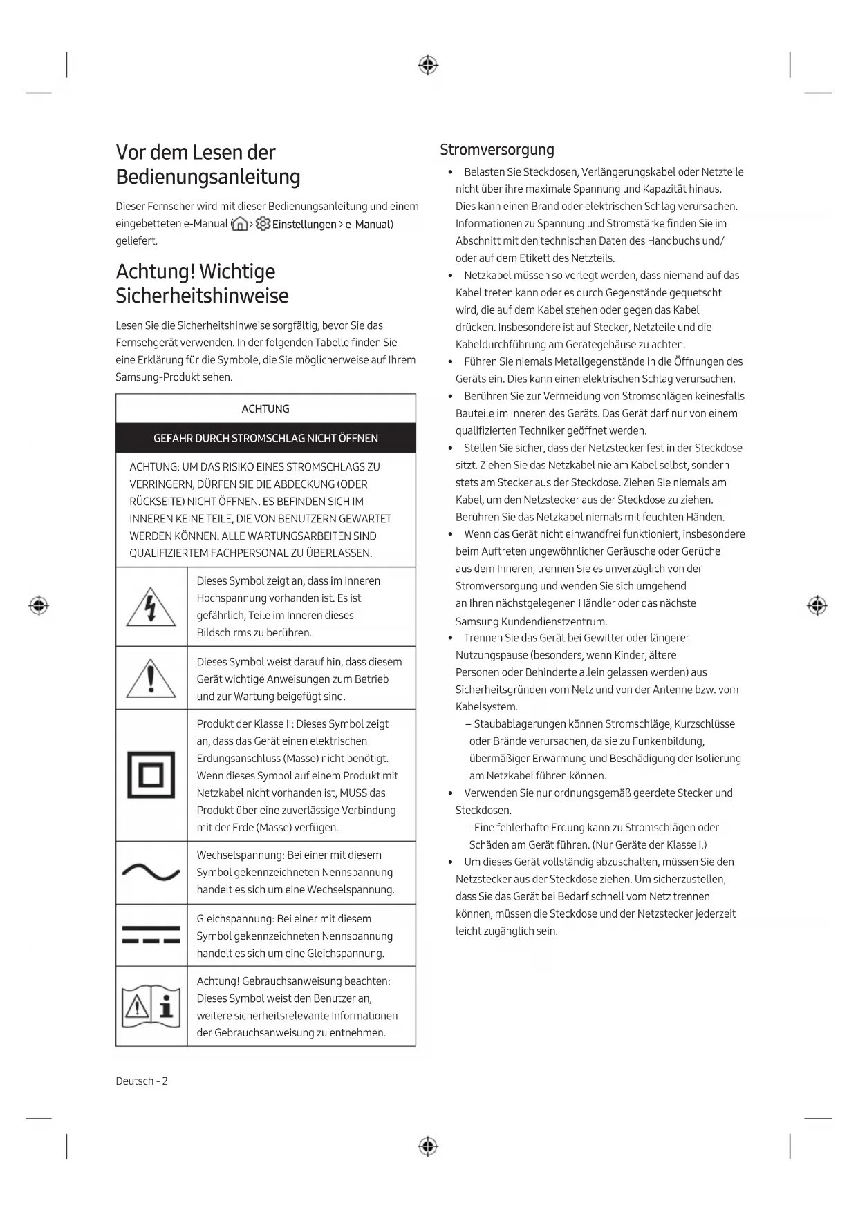 - Die Höhe eventuell anfallender Gebühren wird Ihnen vor dem Besuch eines Technikers mitgeteilt. Bei jeder Reparatur sind zwingend die von Samsung bereitgestellten Reparatur- und Wartungsanweisungen zu beachten. Samsung übernimmt keinerlei Haftung für den Fall, dass infolge einer nicht entsprechend fachgerechten Reparatur oder eines nicht fachgerechten Reparaturversuchs Schäden jeglicher Art am Produkt, wie auch mögliche Verletzungen oder Produktsicherheitsmängel auftreten. Nicht fachgerecht ist eine Reparatur insbesondere, wenn die von Samsung bereitgestellten Reparatur- und Wartungsanweisungen nicht eingehalten wurden. Jegliche Schäden am Produkt, die auf einer Reparatur oder eines Reparaturversuchs durch Dritte, die nicht von Samsung als Service-Dienstleister zertifiziert sind, zurückzuführen sind, sind von der Herstellergarantie ausgeschlossen. Auf der Webseite https://www.samsung.com/de/support/ findest du weitere Informationen zum externen Netzadapter und zur Fernbedienung im Hinblick auf die europäische Ökodesign- Richtlinie (ErP). Deutsch - 6* Die Abbildungen und Illustrationen in diesem Handbuch dienen nur zur Information und können vom tatsächlichen Aussehen des Geräts abweichen. Änderungen an Ausführung und technischen Daten vorbehalten. Verringern des Stromverbrauchs Wenn Sie das Gerät ausschalten, wechselt es in den Standby- Modus. Im Standby-Modus verbraucht es weiterhin eine gewisse Menge an Strom. Wenn Sie das Fernsehgerät längere Zeit nicht verwenden, sollten Sie daher den Netzstecker aus der Steckdose ziehen, um den Stromverbrauch zu senken. Lizenzen The terms HDMI and HDMI High-Definition Multimedia Interface, and the HDMI Logo are trademarks or registered trademarks of HDMI Licensing LLC in the United States and other countries. Hiermit erklärt Samsung, dass dieses Gerät mit der Richtlinie 2014/53/EU und den entsprechenden gesetzlichen Bestimmungen des Vereinigten Königreichs konform ist. Den vollständigen Text der Konformitätserklärung können Sie unter folgender Internetadresse abrufen: http://www.samsung.com, wechseln Sie zu „Support“ und geben Sie die Modellbezeichnung ein. Dieses Gerät darf in allen Ländern der EU und im Vereinigten Königreich verwendet werden. Wi-Fi maximale Sendeleistung: 100 mW bei 2,4 GHz-2,4835 GHz Ordnungsgemäße Entsorgung dieses Geräts (Elektro- & Elektronik-Altgeräte) (Anwendbar in Ländern mit Systemen zur getrennten Sammlung von Wertstoffen). Diese Kennzeichnung auf dem Bildschirm, dem Zubehör oder der Dokumentation bedeutet, dass der Bildschirm sowie das elektronische Zubehör (z.B. Ladegerät, Headset, USB-Kabel) am Ende ihrer Lebensdauer nicht im normalen Hausmüll entsorgt werden dürfen. Entsorgen Sie diese Geräte bitte getrennt von anderen Abfällen, um der Umwelt bzw. der menschlichen Gesundheit nicht durch unkontrollierte Müllbeseitigung zu schaden. Recyceln Sie den Bildschirm, um die nachhaltige Wiederverwertung von stofflichen Ressourcen zu fördern. Private Nutzer sollten den Händler, bei dem das Produkt gekauft wurde, oder die zuständigen Behörden kontaktieren, um in Erfahrung zu bringen, wie sie den Bildschirm auf umweltfreundliche Weise recyceln können. Gewerbliche Benutzer wenden sich an ihren Lieferanten und überprüfen die Konditionen Ihres Kaufvertrags. Der Bildschirm und seine elektronischen Zubehörteile dürfen nicht zusammen mit anderem Gewerbemüll entsorgt werden. Ordnungsgemäße Entsorgung der Batterien in diesem Gerät (Anwendbar in Ländern mit Systemen zur getrennten Sammlung von Wertstoffen). Diese Kennzeichnung auf der Batterie, dem Handbuch oder der Verpackung bedeutet, dass die Batterien am Ende ihrer Lebensdauer nicht im normalen Hausmüll entsorgt werden dürfen. Die Kennzeichnung mit den chemischen Symbolen „Hg“, „Cd“ oder „Pb“ bedeutet, dass die Batterie Quecksilber, Cadmium oder Blei in Mengen enthält, die die Grenzwerte der EU-Direktive 2006/66 übersteigen. Wenn Batterien nicht ordnungsgemäß entsorgt werden, können diese Substanzen die Gesundheit von Menschen oder die Umwelt gefährden. Zum Schutz der natürlichen Ressourcen und zur Förderung der Wiederverwertung von Materialien trennen Sie die Batterien von anderem Müll und führen Sie sie Ihrem örtlichen Recyclingsystem zu. Deutsch - 7 DeutschInnan du läser den här bruksanvisningen Tv:n levereras med den här bruksanvisningen och en inbäddad e-handbok ( > Inställningar > e-Manual). Varning! Viktiga säkerhetsanvisningar Läs igenom säkerhetsanvisningarna innan du använder tv:n. Se tabellen nedan för en förklaring av symboler som kan finnas på din Samsung-produkt. VARNING! RISK FÖR ELSTÖTAR. ÖPPNA INTE. VARNING! FÖR ATT UNDVIKA RISK FÖR ELSTÖTAR SKALL DU INTE TA BORT (ELLER FÖRA TILLBAKA) SKYDDET. DET FINNS INGA DELAR DU KAN BYTA INUTI. ÖVERLÅT REPARATIONER TILL BEHÖRIG SERVICEPERSONAL. Den här symbolen visar att det är hög spänning på insidan. Det är farligt att komma i kontakt med produktens insida. Den här symbolen indikerar att det finns viktig dokumentation som medföljer produkten angående dess funktion och underhåll. Klass II-produkt: Den här symbolen indikerar att produkten inte kräver en säkerhetsanslutning till jord. Om denna symbol inte finns på en produkt med en strömkabel MÅSTE produkten ha en tillförlitlig anslutning till skyddsjord. Växelström: Märkspänning som markerats med den här symbolen är växelström. Likström: Märkspänning som markerats med den här symbolen är likström. Var försiktig! Läs anvisningarna för användning: Den här symbolen instruerar användare att läsa bruksanvisningen för att få ytterligare säkerhetsrelaterad information. Effekt